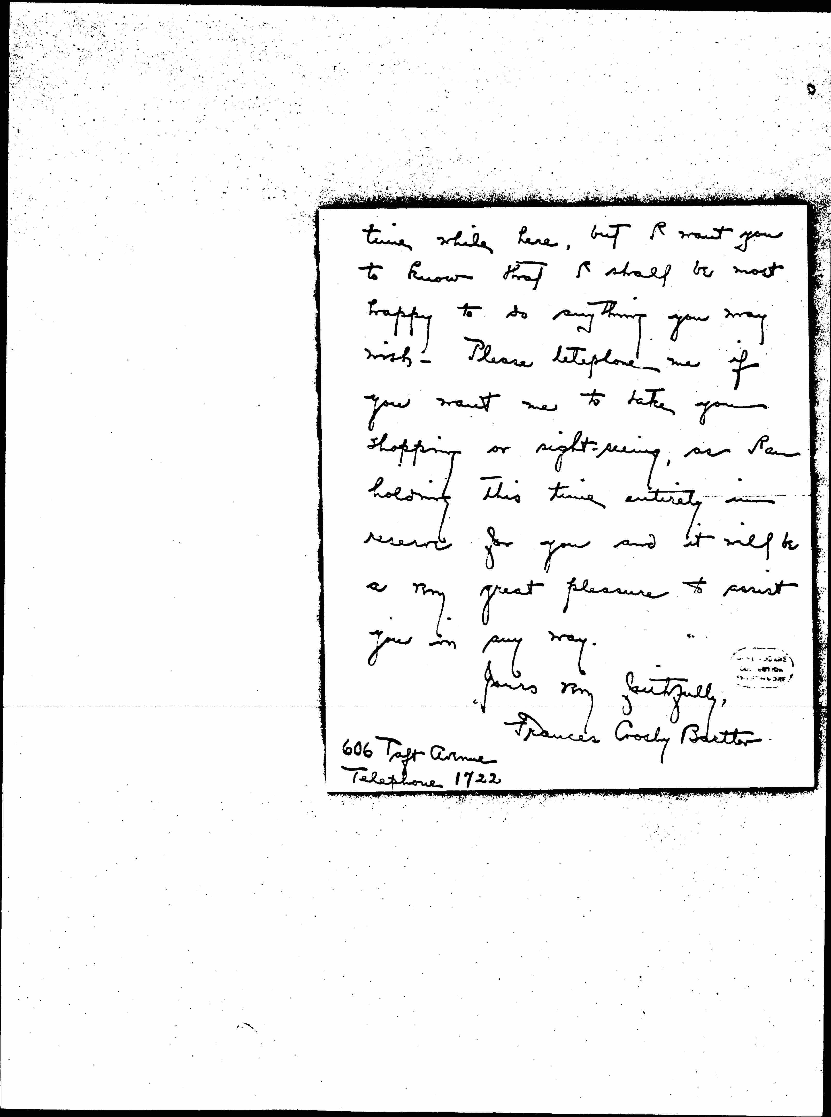 I know that many plans have been made for you, and I do not wish to add to your burden by asking for any of your [page 2] time while here, but I want you to know that I shall be most happy to do anything you may wish. Please telephone me if you want me to take you shopping or sight-seeing, as I am holding this time entirely in reserve for you and it will be a very great pleasure to assist you in any way.