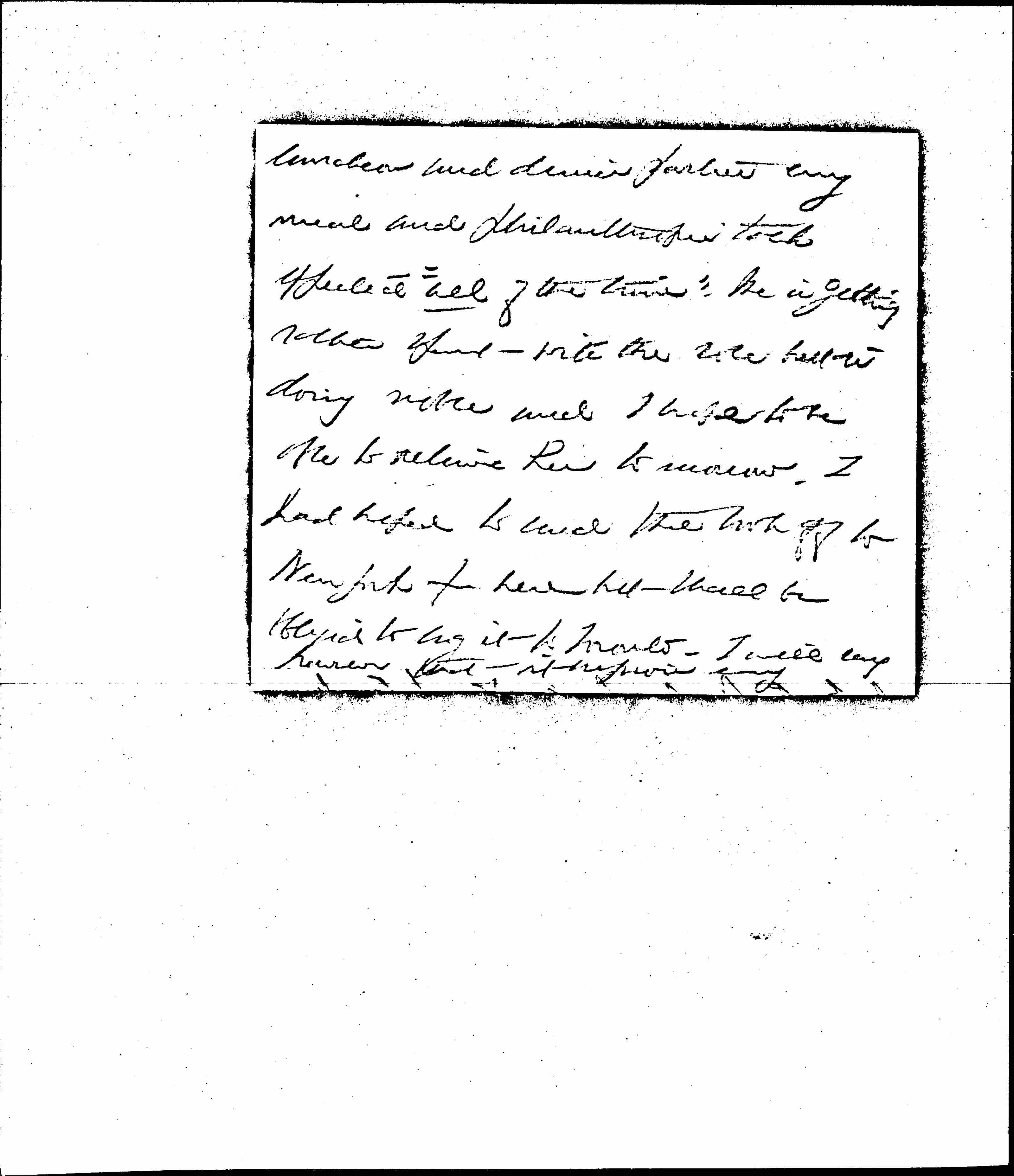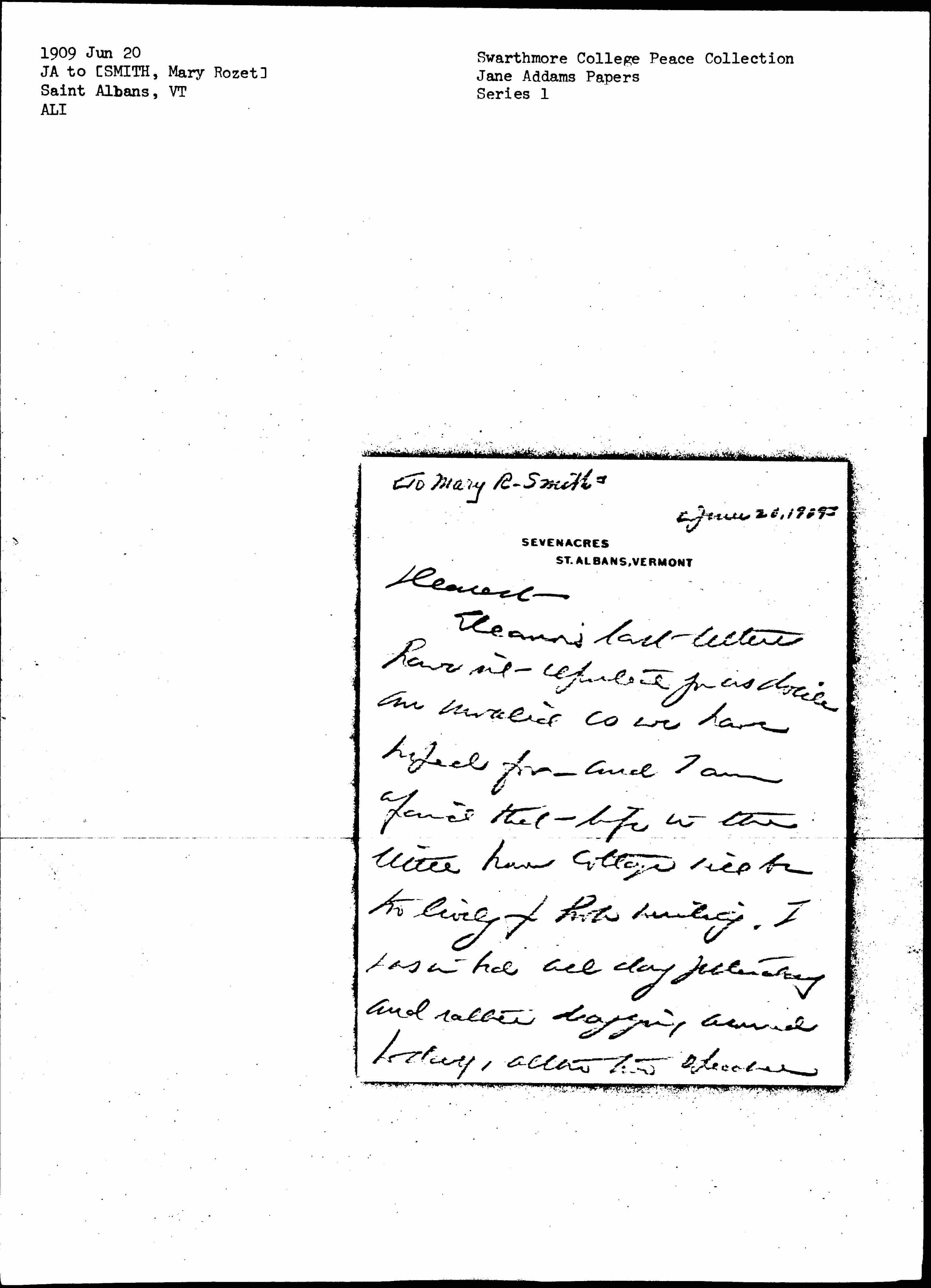 Eleanor's last letters haven't reported you as docile an invalid as we have hoped for -- and I am afraid that life in the little brown cottage will be too lively for book writing. I was in bed all day yesterday and rather dragging around today, [although] two speeches [page 2] are expected -- thank Goodness one is over. This is a beautiful portion of the earth, the view of Lake Champlain is really more enchanting than our long ago ride upon its waters -- we motored today for a little while but I was glad to get back to my blue wrapper and the sofa. The poor Lady is bearing the heat and burden of the day, [page 3] luncheon and dinner parties every meal and philanthropic talk expected "all of the time." She is getting rather spent with the role but is doing noble [and] I hope to be able to relieve her tomorrow. I had hoped to send the book off to New York from here but shall be obliged to lug it to Toronto. I will say however that it improves every [page 4] trip it takes. I think of you long and often, always with love and yearning -- it is only a week from today when I shall be back.