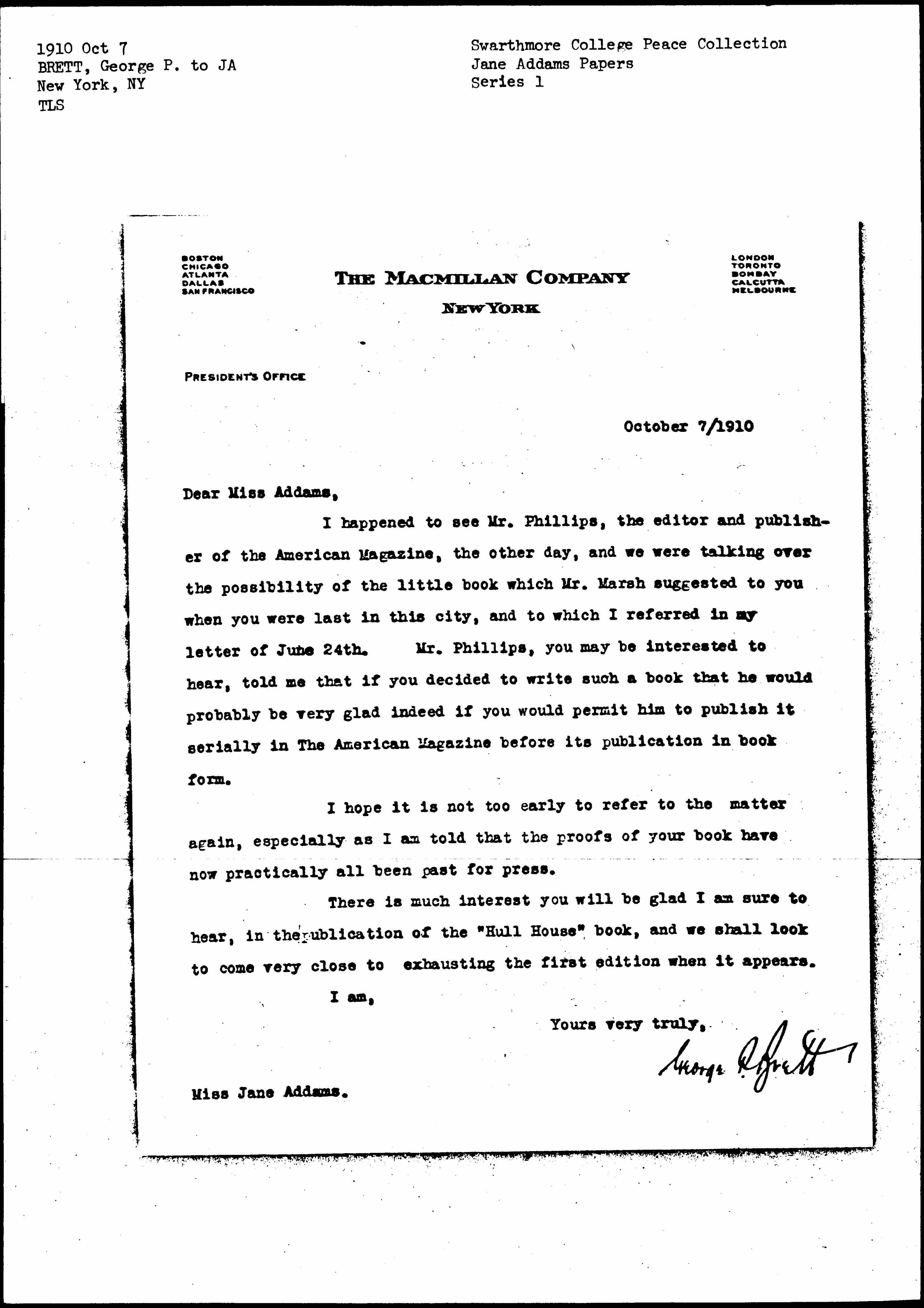 There is much interest you will be glad I am sure to hear, in the publication of the "Hull House" book, and we shall look to come very close to exhausting the first edition when it appears.