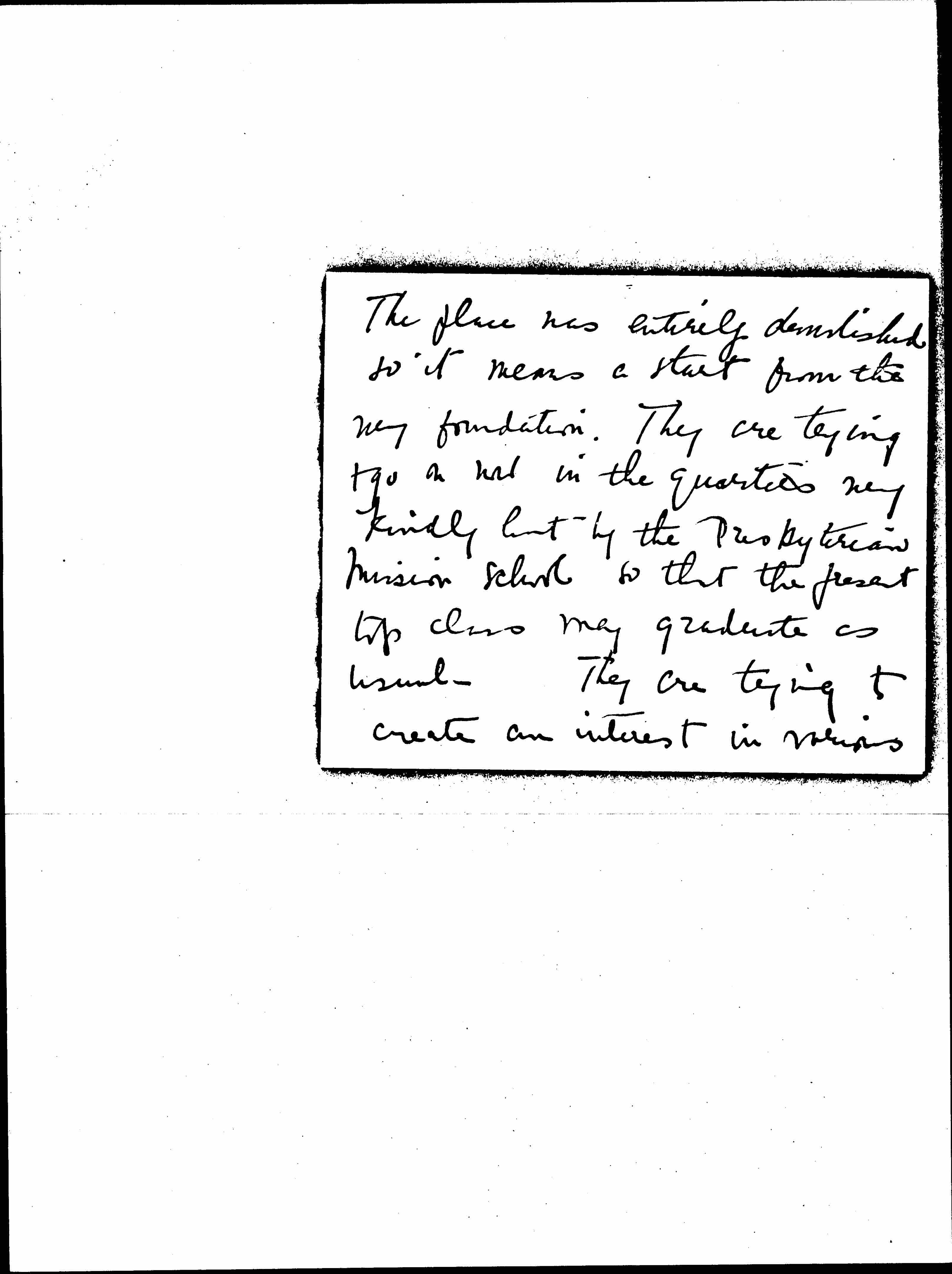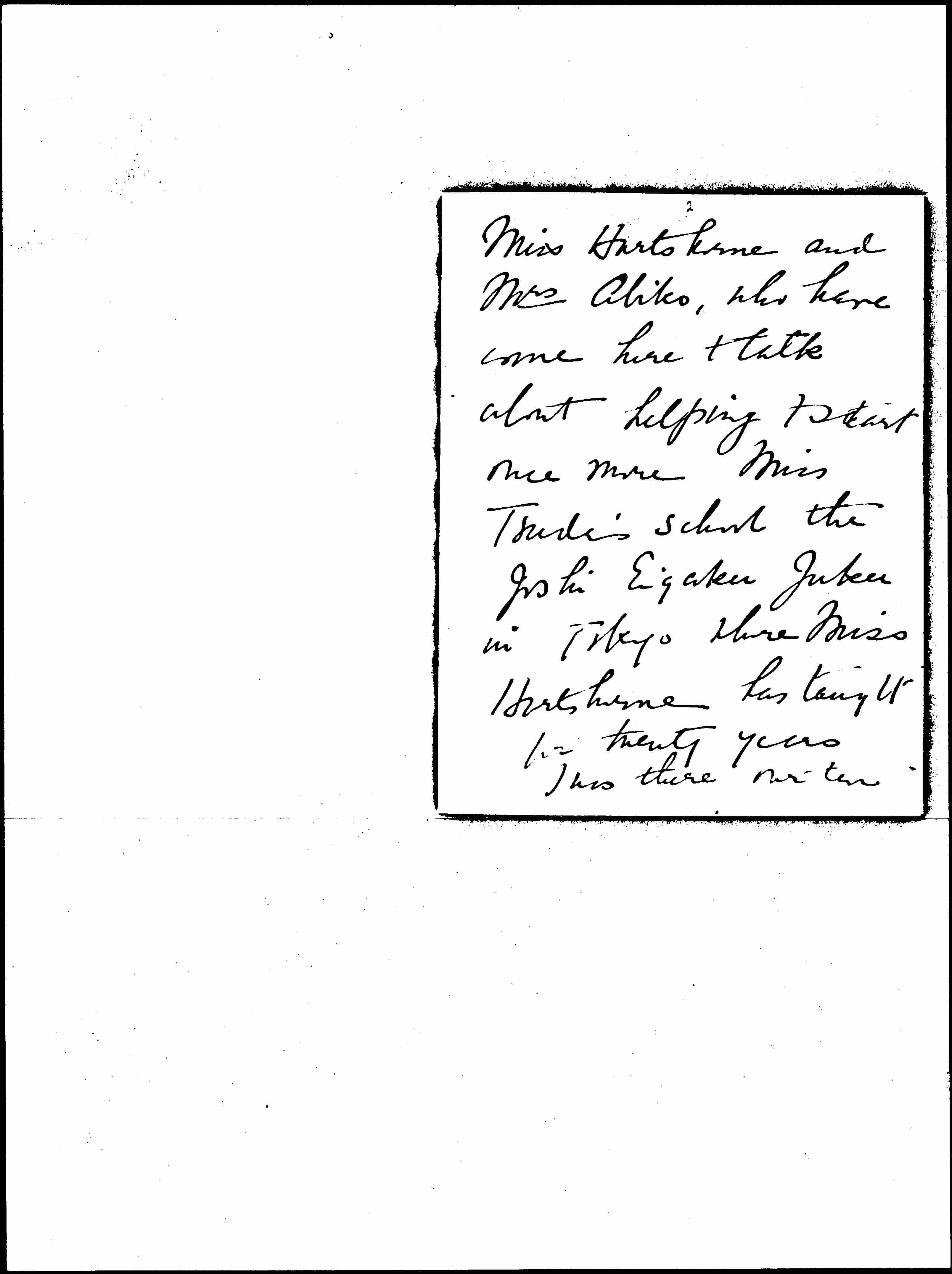 Yesterday I went to Boston [to] talk with [page 2] Miss Hartshorne and Mrs. Abiko, who have come here [to] talk about helping to start once more Miss Tsuda's school the Joshi Eigaku Juku in Tokyo where Miss Hartshorne has taught for twenty years. I was there over ten. [page 3] The place was entirely demolished so it means a start from the very foundation. They are trying [to] go on now in the quarters very kindly lent by the Presbyterian mission school so that the present top class may graduate as usual.