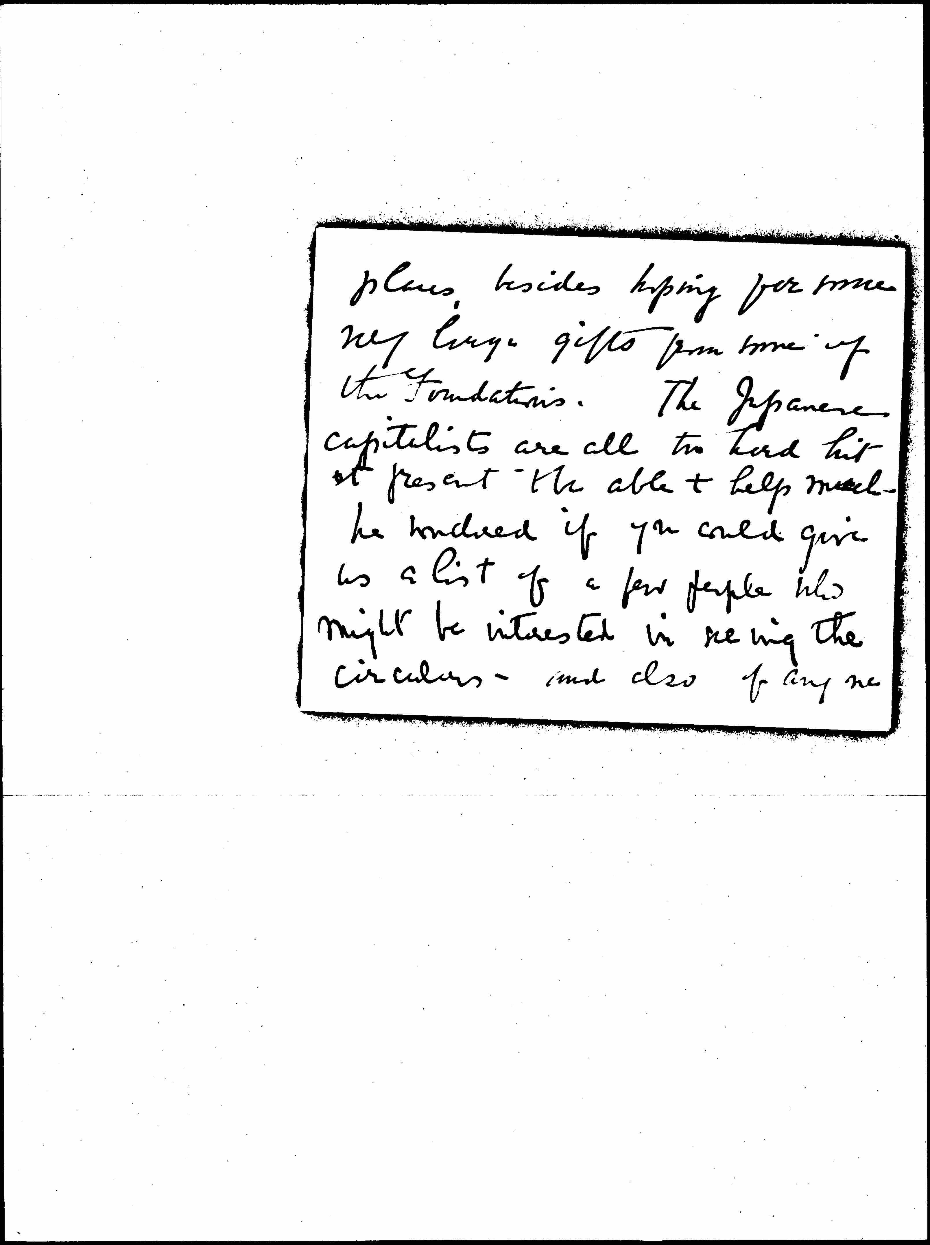 They are trying to create an interest in various [page 4] places, besides hoping for some very large gifts from some of the Foundations. The Japanese capitalists are all too hard hit at present [to] be able [to] help much. We wondered if you could give us a list of a few people who might be interested in seeing the circulars -- and also of anyone [page 5] who might be willing [to] be on a committee [to] help.