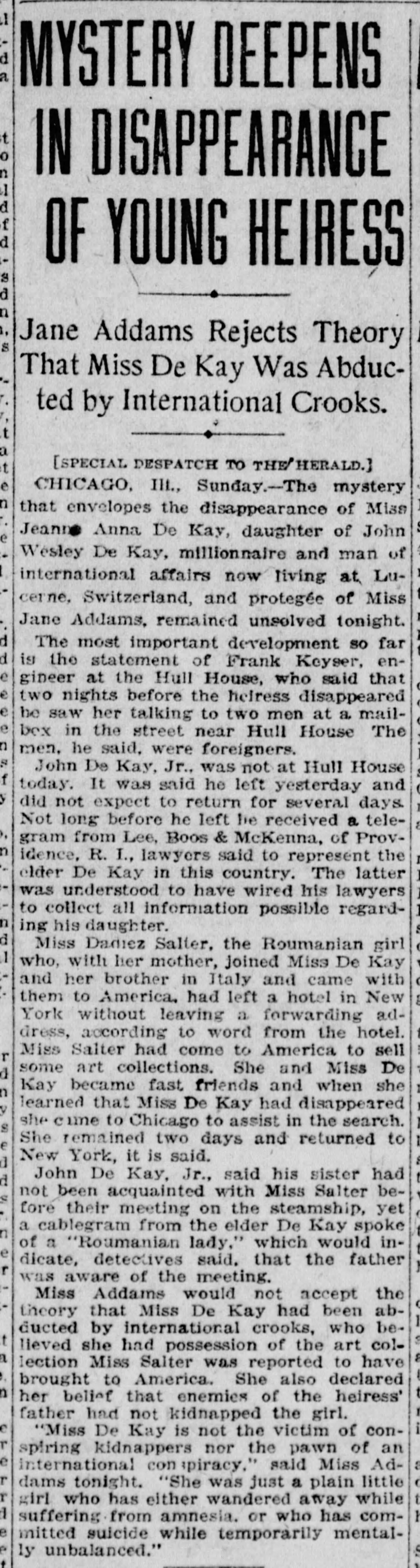 Miss Addams would not accept the theory that Miss DeKay had been abducted by international crooks, who believed she had possession of the art collection Miss Salter was reported to have brought to America. She also declared her belief that enemies of the heiress’ father had not kidnapped the girl.