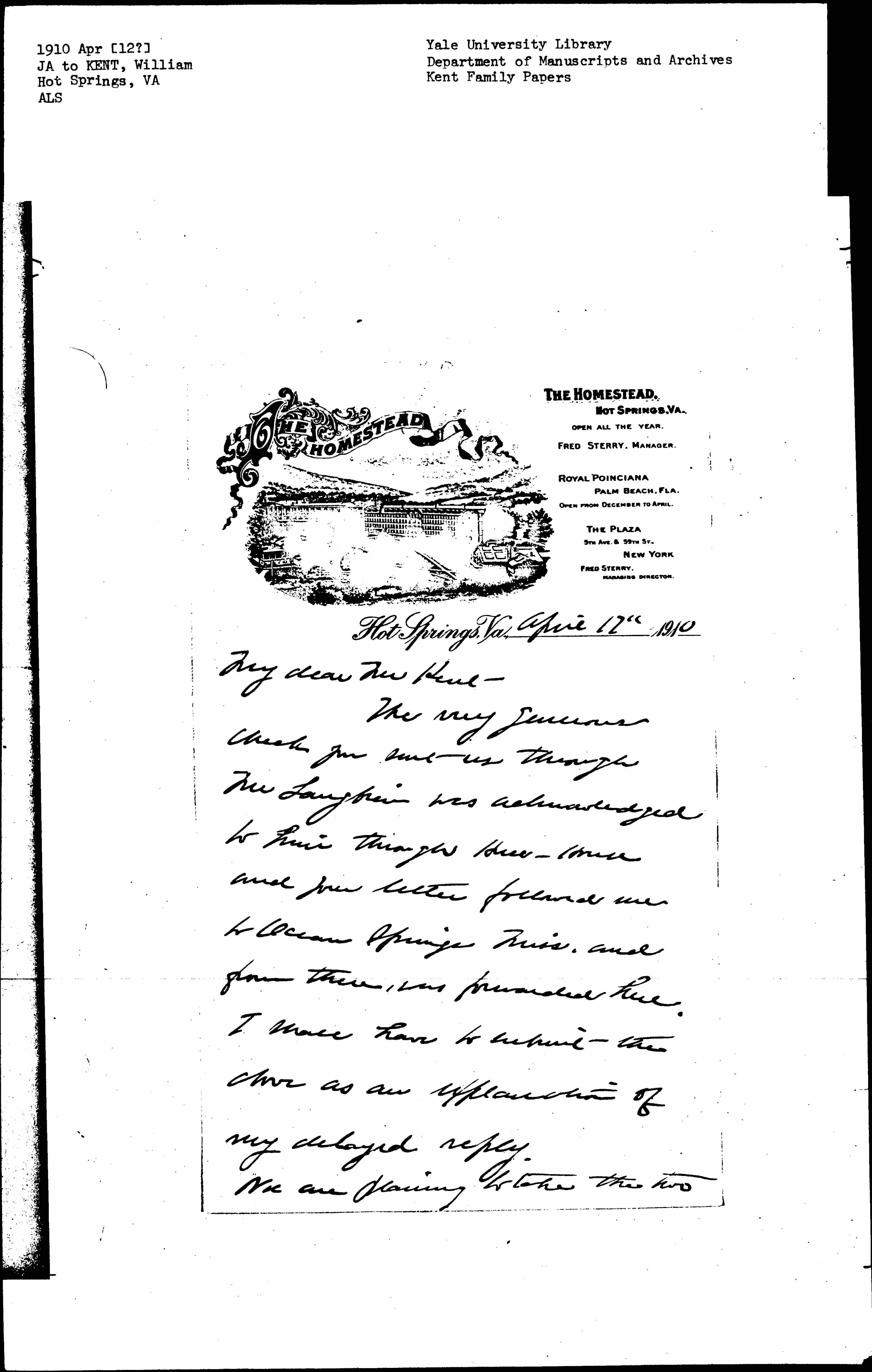 The very generous check you sent us through Mr. Langbein was acknowledged to him through Hull-House and your letter followed me to Ocean Springs Miss. and from there, was forwarded here. I shall have to submit the above as an explanation of my delayed reply.