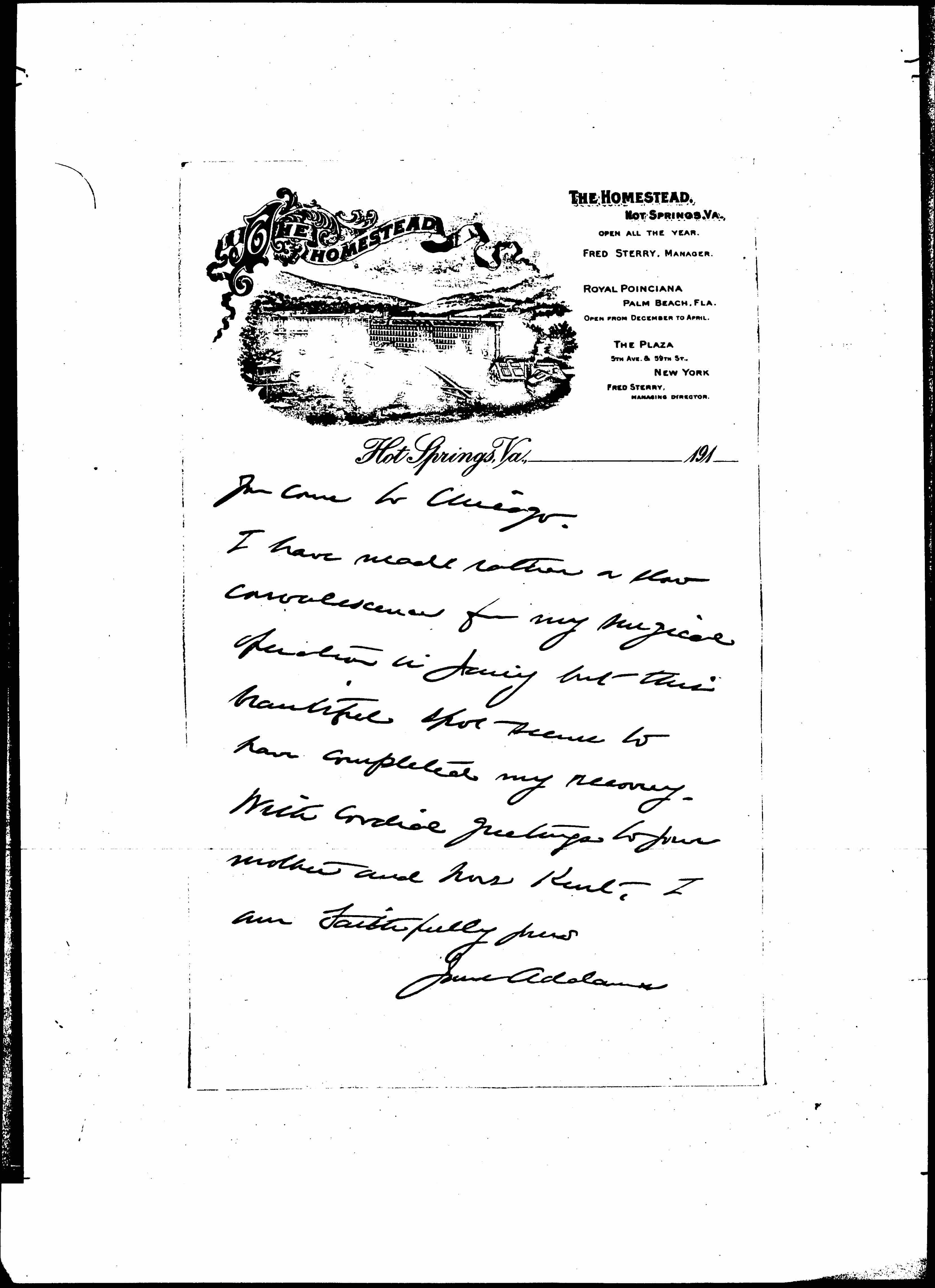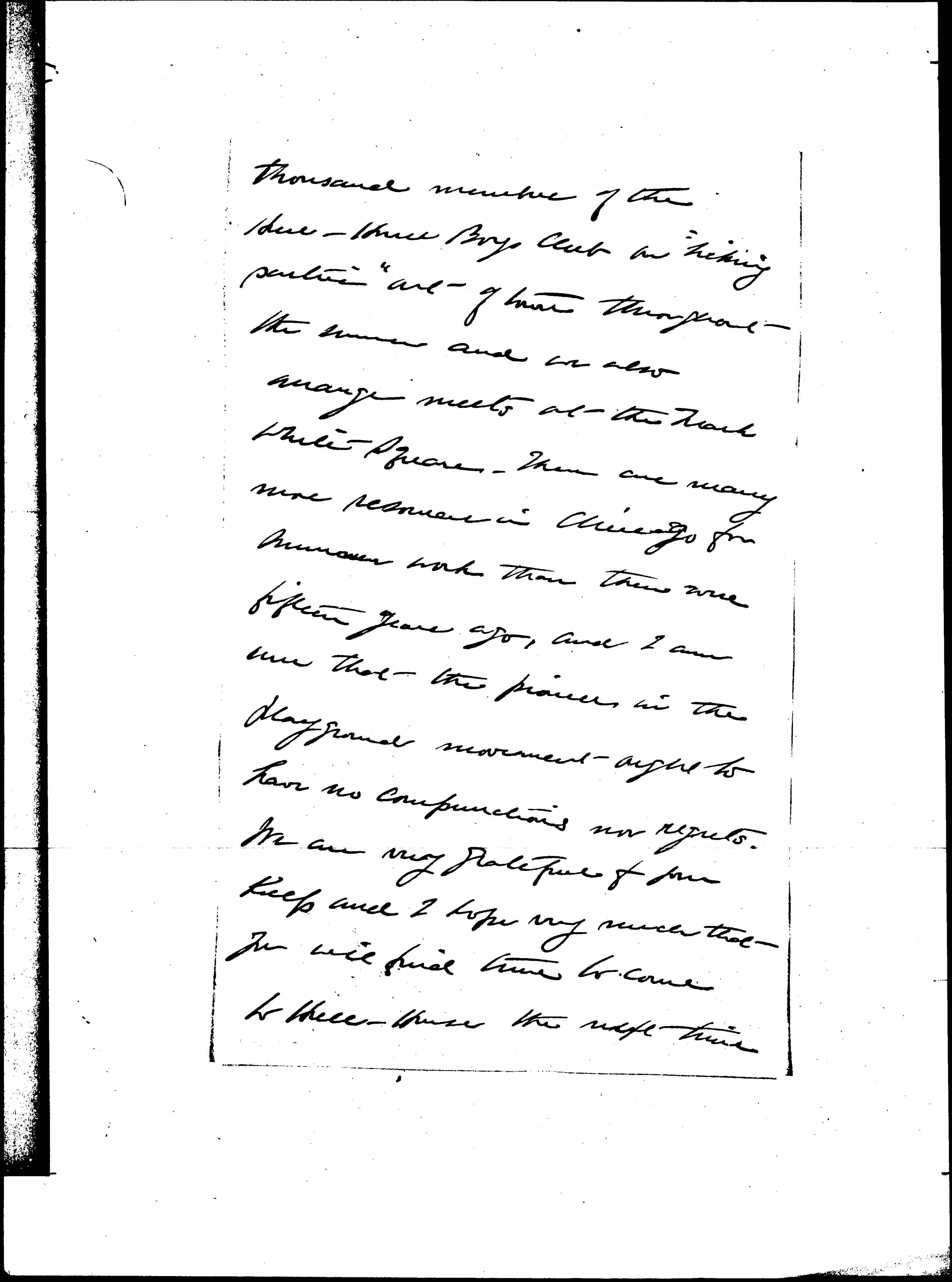 We are planning to take the two [page 2] thousand members of the Hull-House Boys Club on "hiking parties" out of town throughout the summer and we also arrange meets at the Mark White Square. There are many more resources in Chicago for summer work than there were fifteen years ago, and I am sure that the pioneers in the playground movement ought to have no compunctions nor regrets. We are very grateful for your help and I hope very much that you will find time to come to Hull-House the next time [page 3] you come to Chicago.