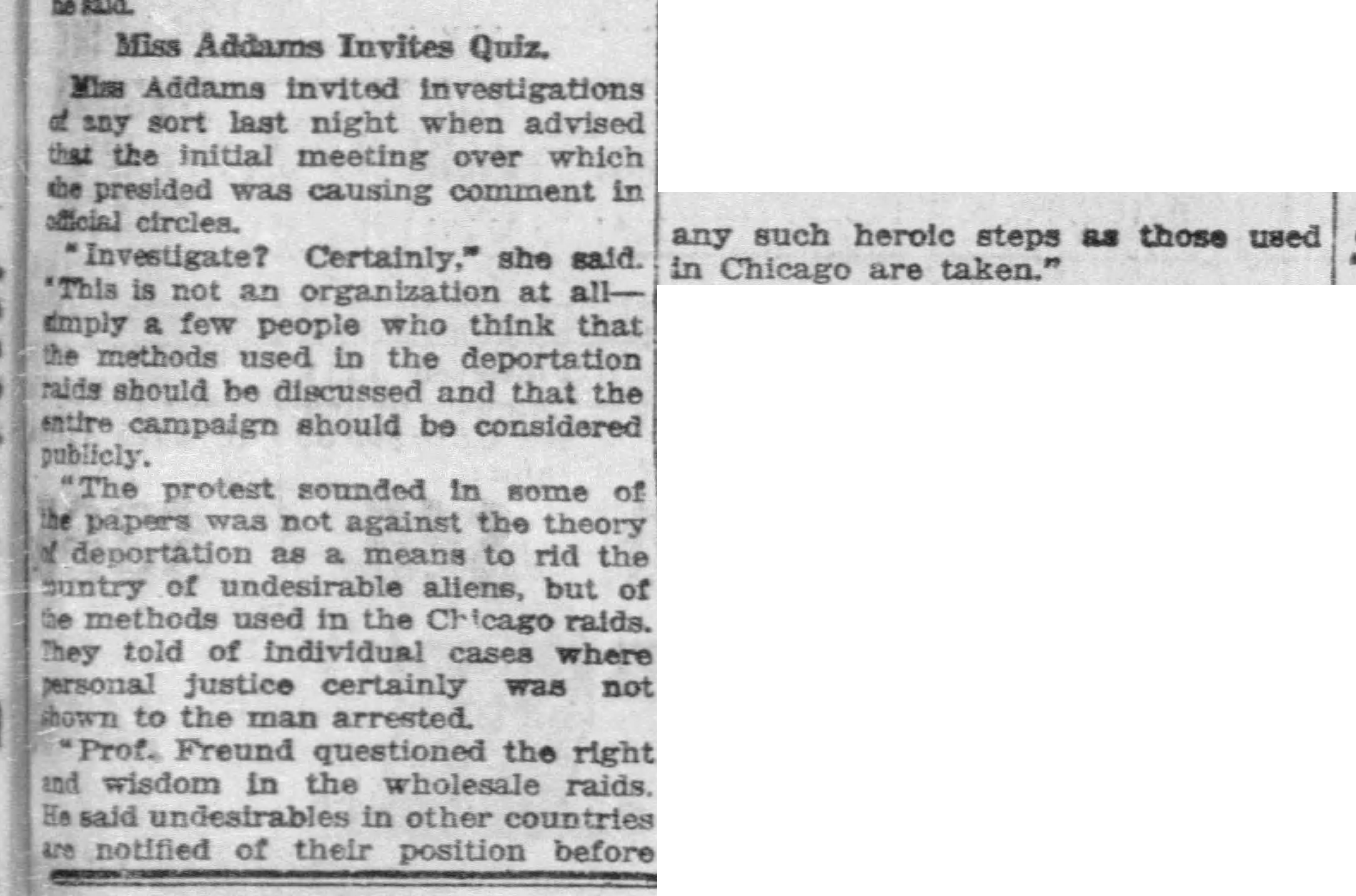 “Prof. Freund questioned the right and wisdom in the wholesale raids. He said undesirables in other countries are notified of their position before any such heroic steps as those used in Chicago are taken.”