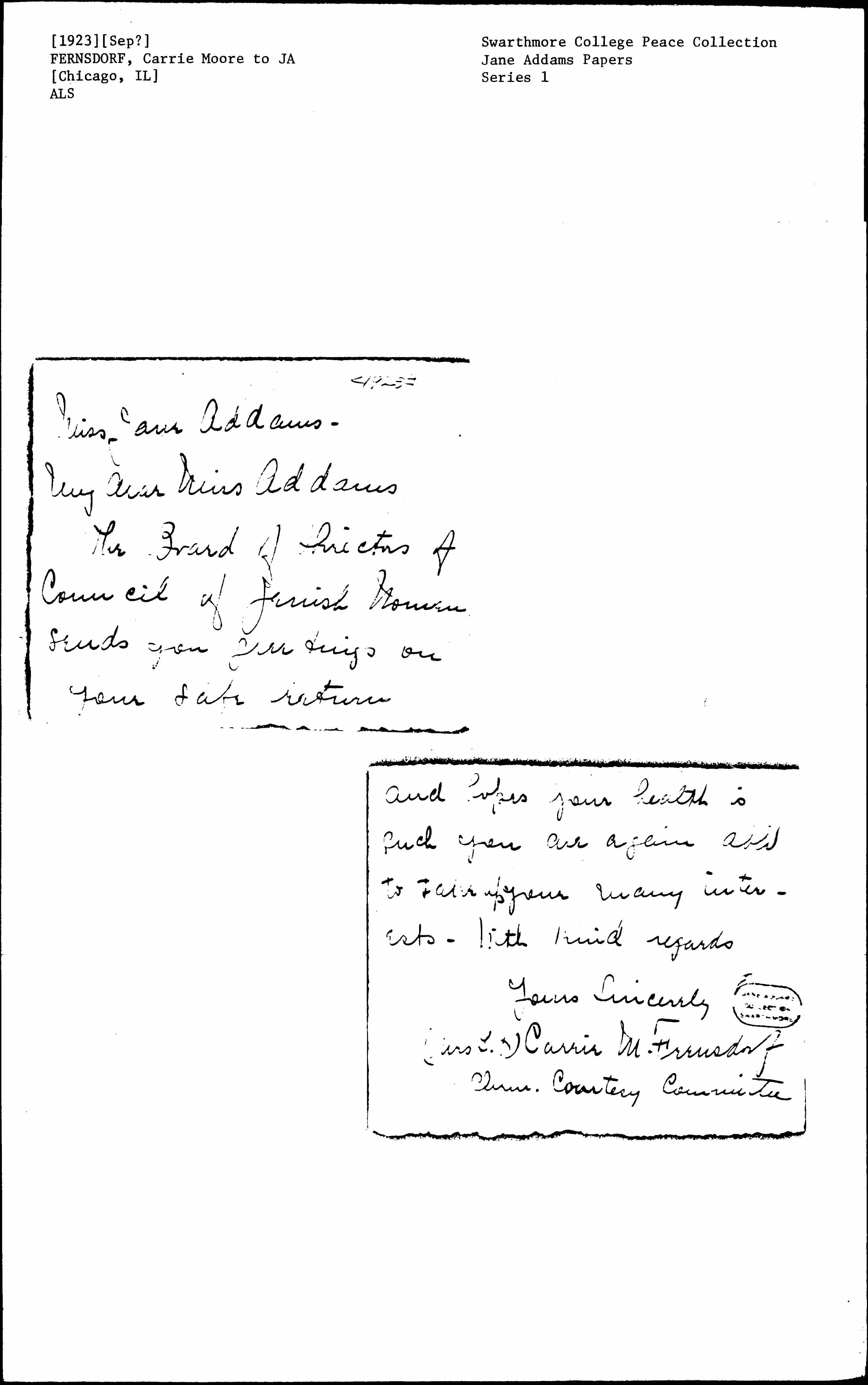 The Board of Directors of Council of Jewish Women sends you greetings on your safe return [page 2] and hopes your health is such you are again able to take up your many interests. With kind regards