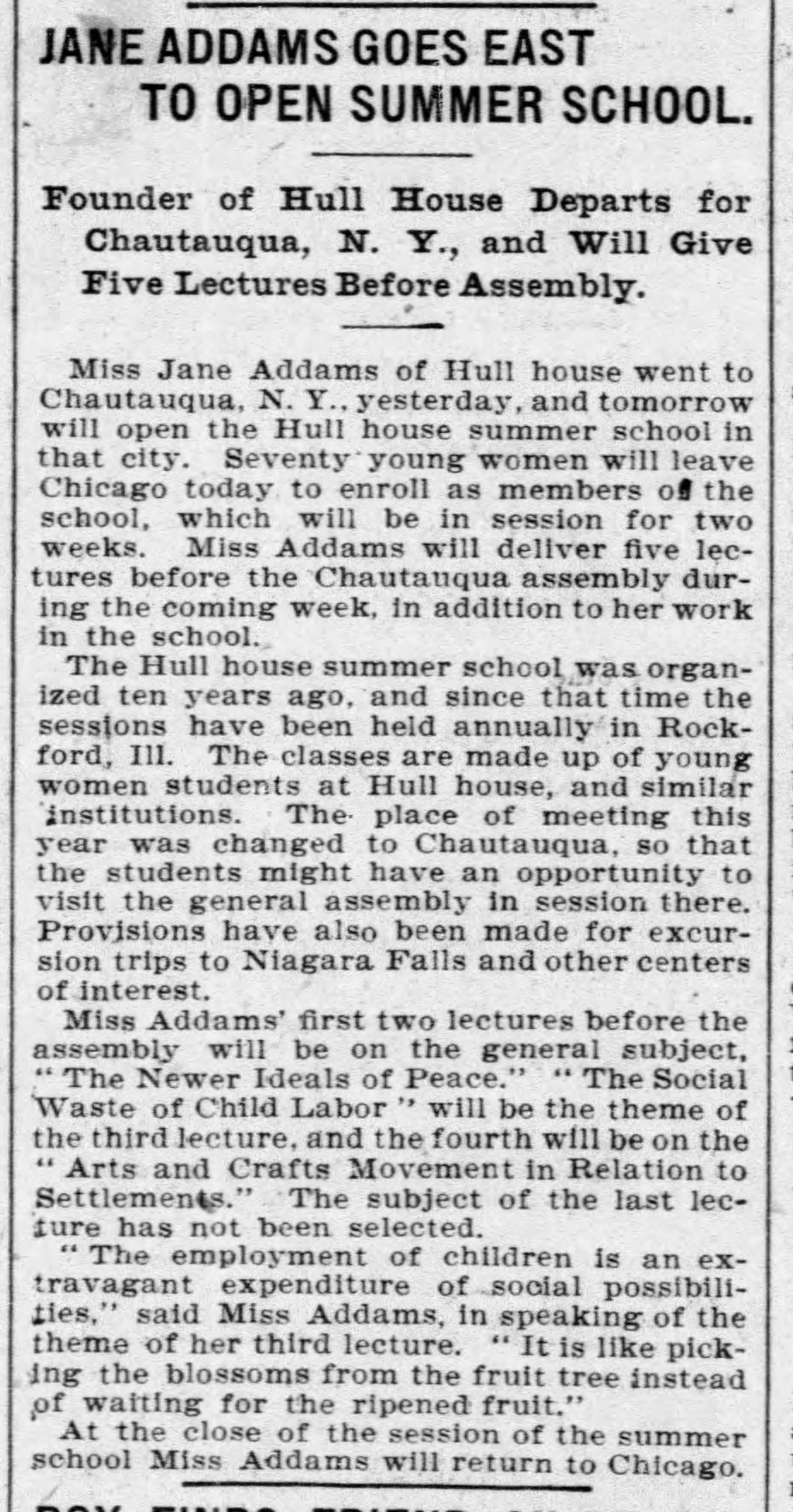 "The employment of children is an extravagant expenditure of social possibilities," said Miss Addams, in speaking of the theme of her third lecture. "It is like picking the blossoms from the fruit tree instead of waiting for the ripened fruit."