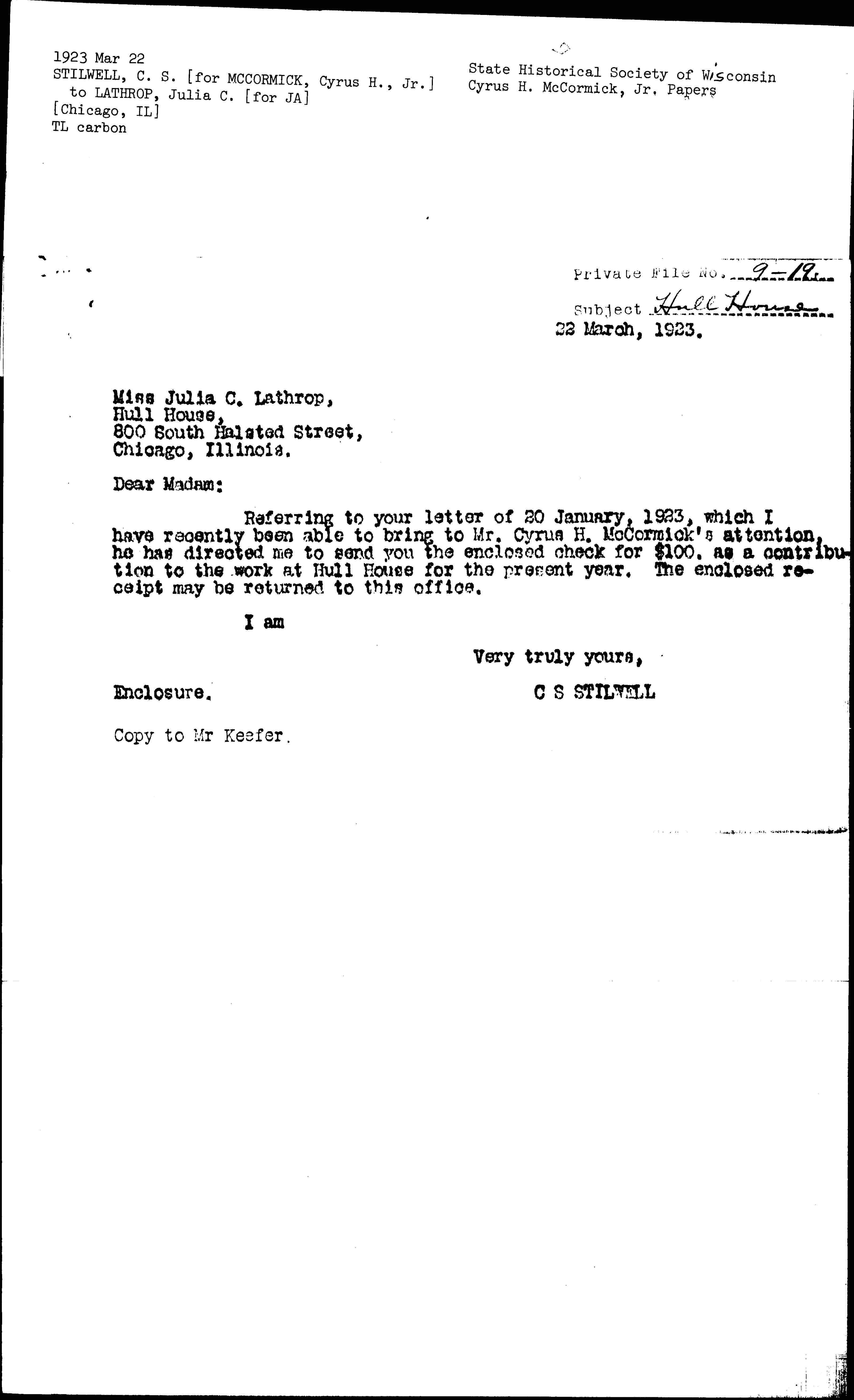 Referring to your letter of 20 January, 1923, which I have recently been able to bring to Mr. Cyrus H. McCormick's attention, he has directed me to send you the enclosed check for $100, as a contribution to the work at Hull House for the present year. The enclosed receipt may be returned to this office.