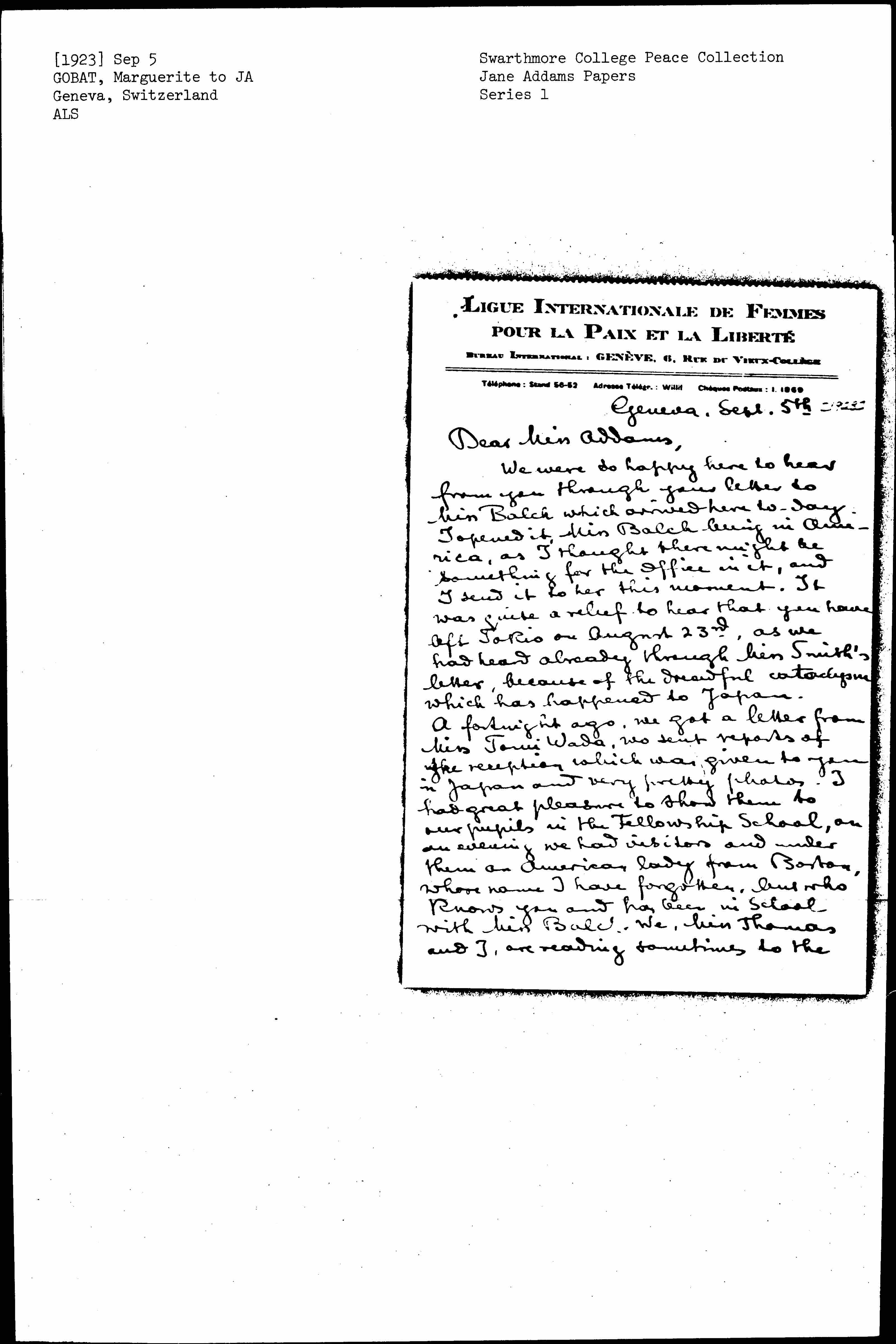 We were so happy here to hear from you through your letter to Miss Balch which arrived here [today]. I opened it, Miss Balch being in America, as I thought there might be something for the office in it, and I sent it to her this moment. It was quite a relief to hear that you have left [Tokyo] on August 23rd, as we had heard already through Miss Smith’s letter, because of the dreadful cataclysm which has happened to Japan.