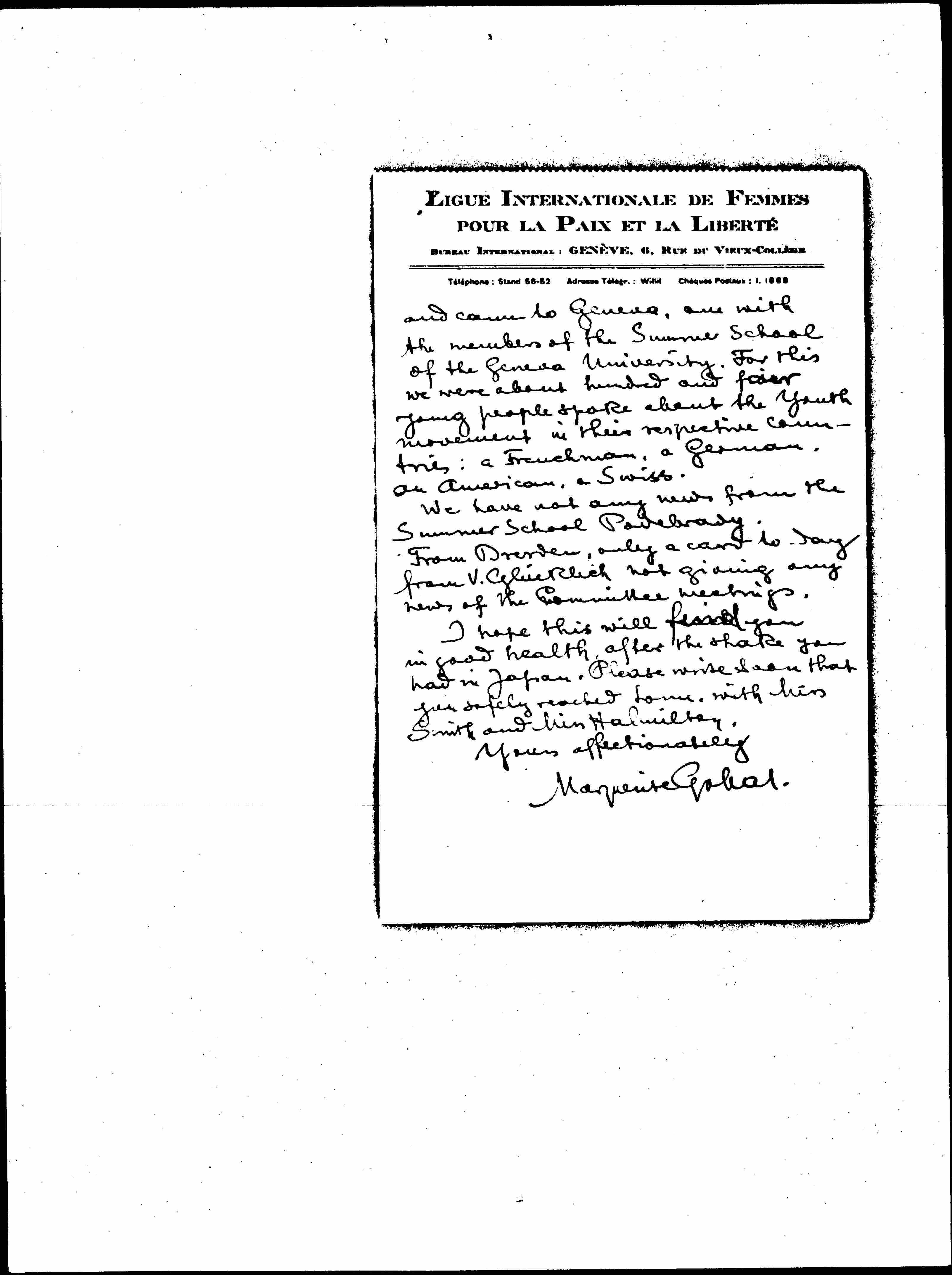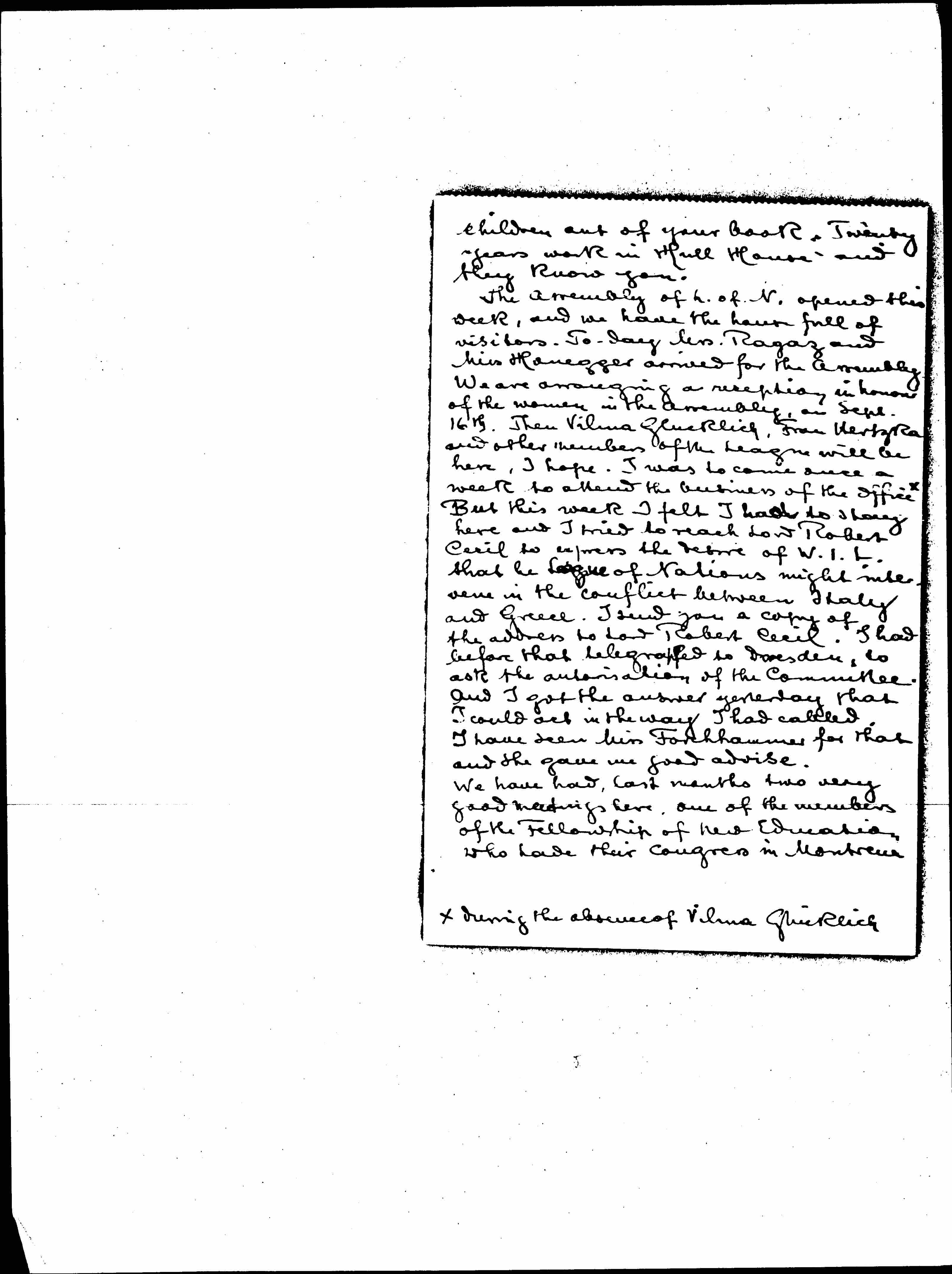 The Assembly of L. of N. opened this week, and we have the house full of visitors. [Today] Mrs. Ragaz and Miss Honegger arrived for the Assembly. We are arranging a reception in honor of the women in the Assembly, on Sept. 16th. Then Vilma Glücklich, Frau Hertzka and other members of the League will be here, I hope. I was to come once a week to attend the business of the office [written in bottom margin] ↑during the absence of Vilma Glücklich↓ but this week I felt I had to stay here and I tried to reach Lord Robert Cecil to express the desire of the W.I.L. that the League of Nations might intervene in the conflict between Italy and Greece. I send you a copy of the address to Lord Robert Cecil. I had before that telegraphed to Dresden, to ask the [authorization] of the Committee and I got the answer yesterday that I could act in the way I had cabled. I have seen Miss Forchhammer for that and she gave me good [advice].