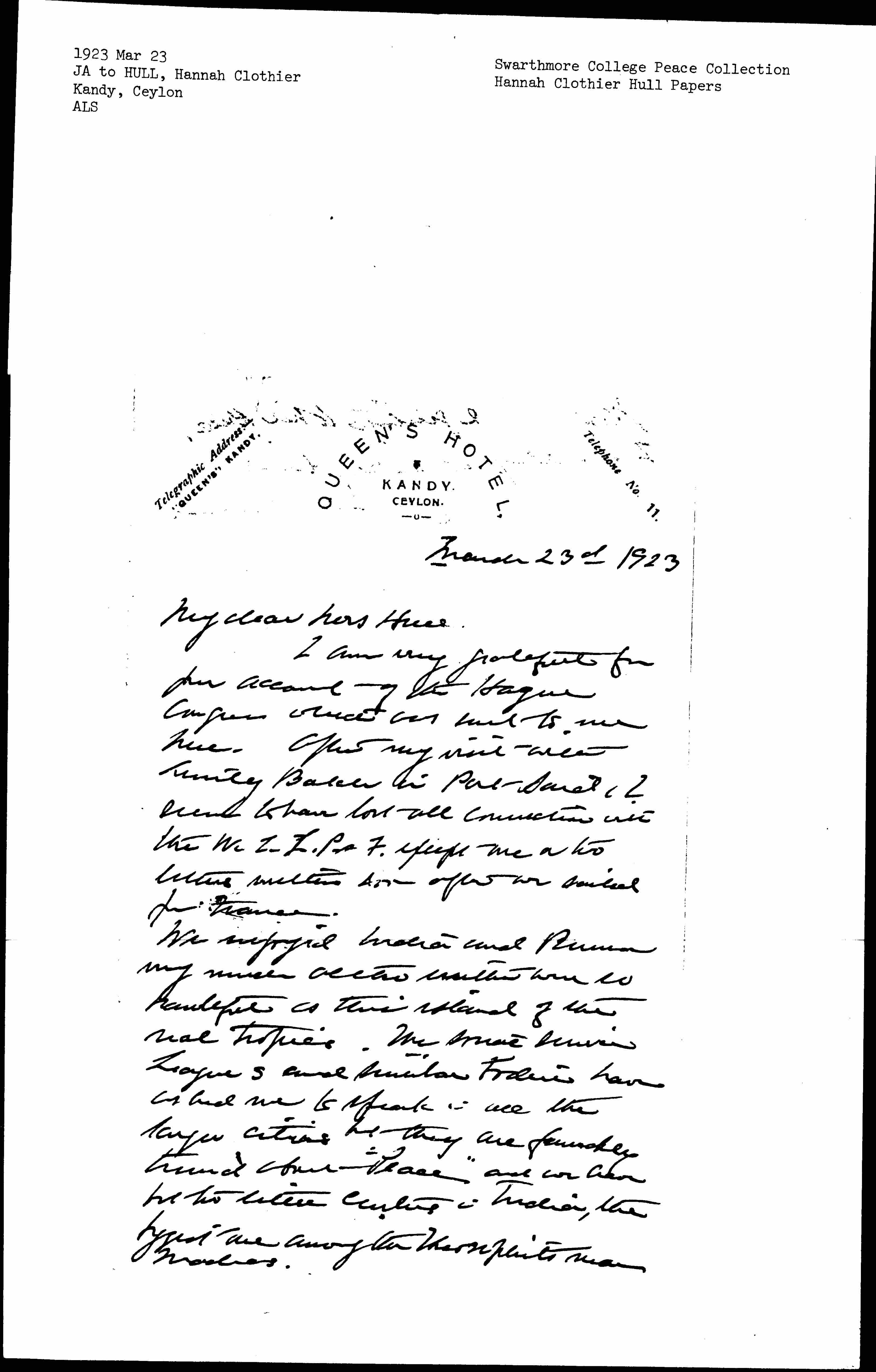 I am very grateful for your account of The Hague Congress which was sent to me here. After my visit with Emily Balch in Port Said, I seem to have lost all connection with the W.I.L.P.F. except one or two letters written soon after we sailed from France.
