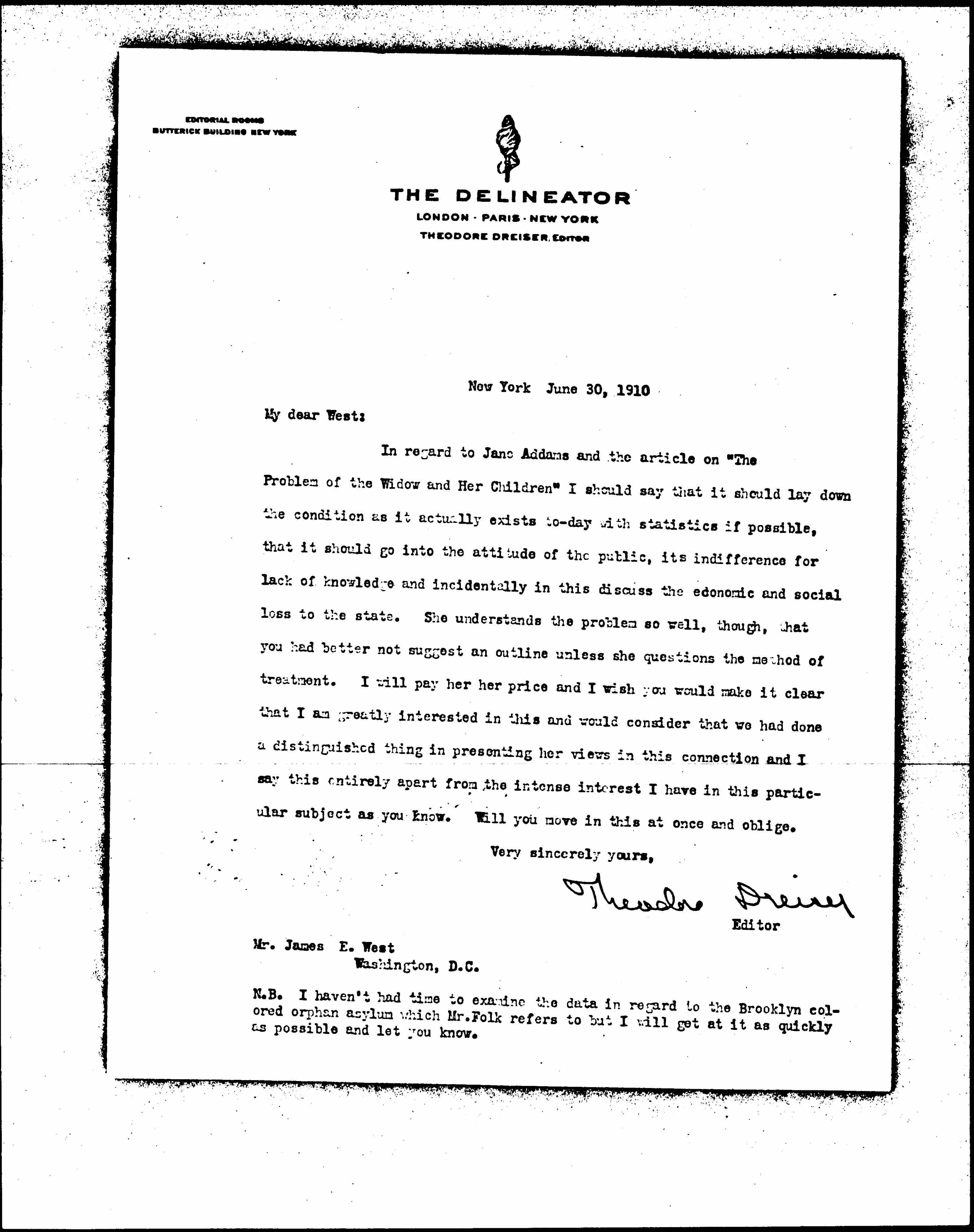 In regard to Jane Addams and the article on "The Problem of the Widow and Her Children" I should say that it should lay down the condition as it actually exists [today] with statistics if possible, that it should go into the attitude of the public, its indifference for lack of knowledge and incidentally in this discuss the economic and social loss to the state. She understands the problem so well, though, that you had better not suggest an outline unless she questions the method of treatment. I will pay her her price and I wish you would make it clear that I am greatly interested in this and would consider that we had done a distinguished thing in presenting her views in this connection and I say this entirely apart from the intense interest I have in this particular subject as you know. Will you move in this at once and oblige.