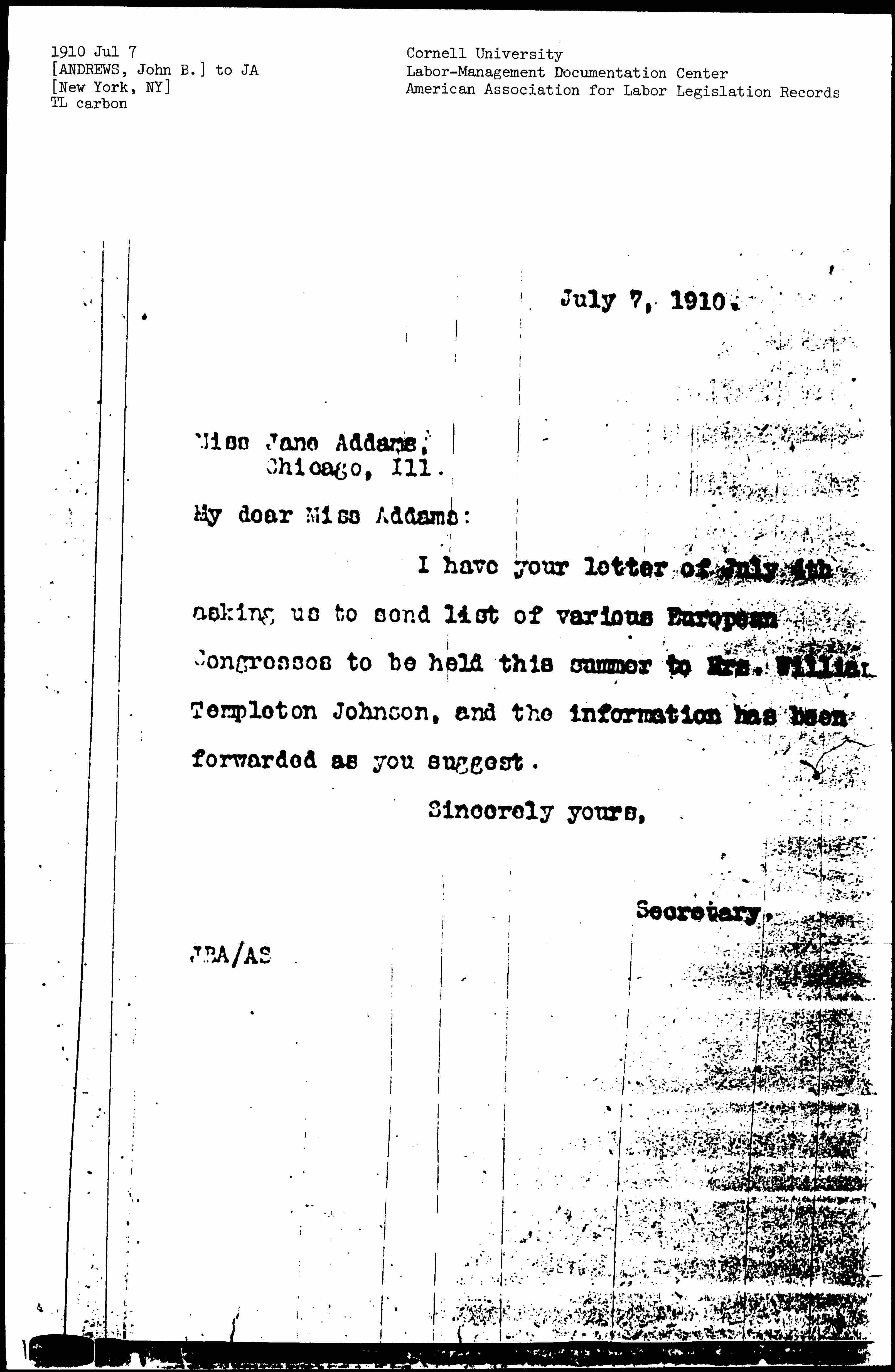 I have your letter of July 4th asking us to send list of various European Congresses to be held this summer to Mrs. William Templeton Johnson, and the information has been forwarded as you suggest.