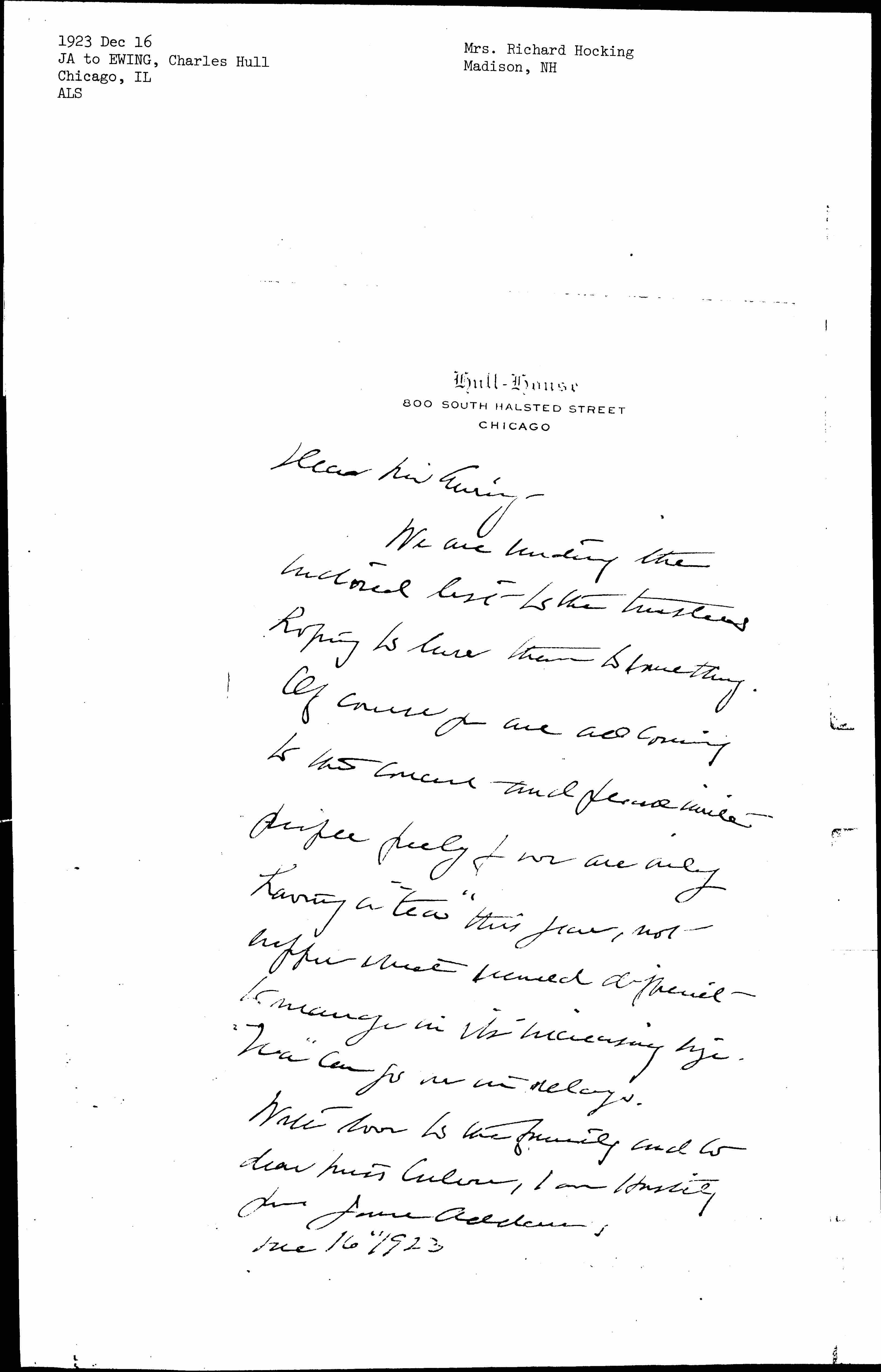With love to the family and to dear Miss Culver, I am Hastily yours Jane Addams