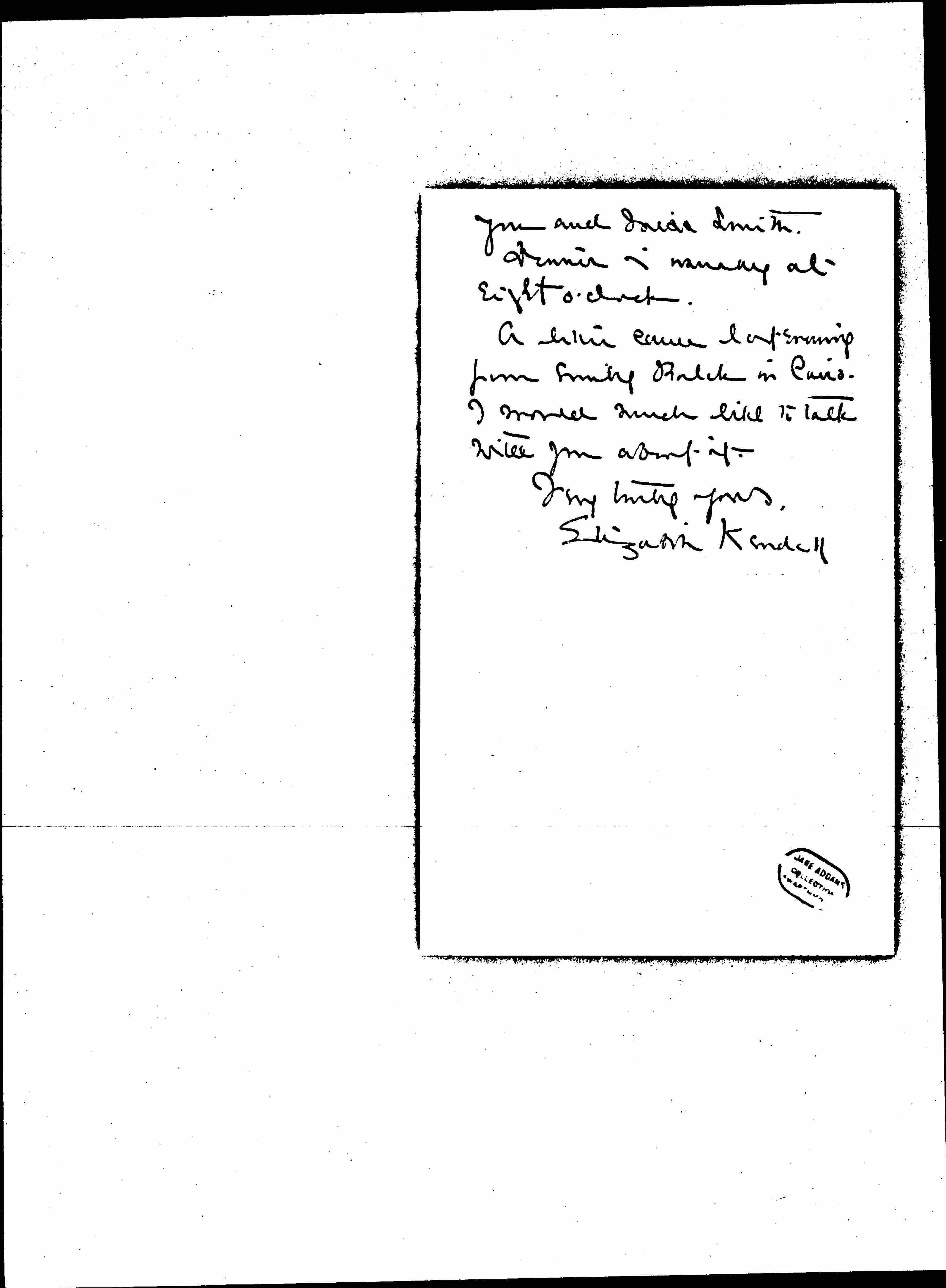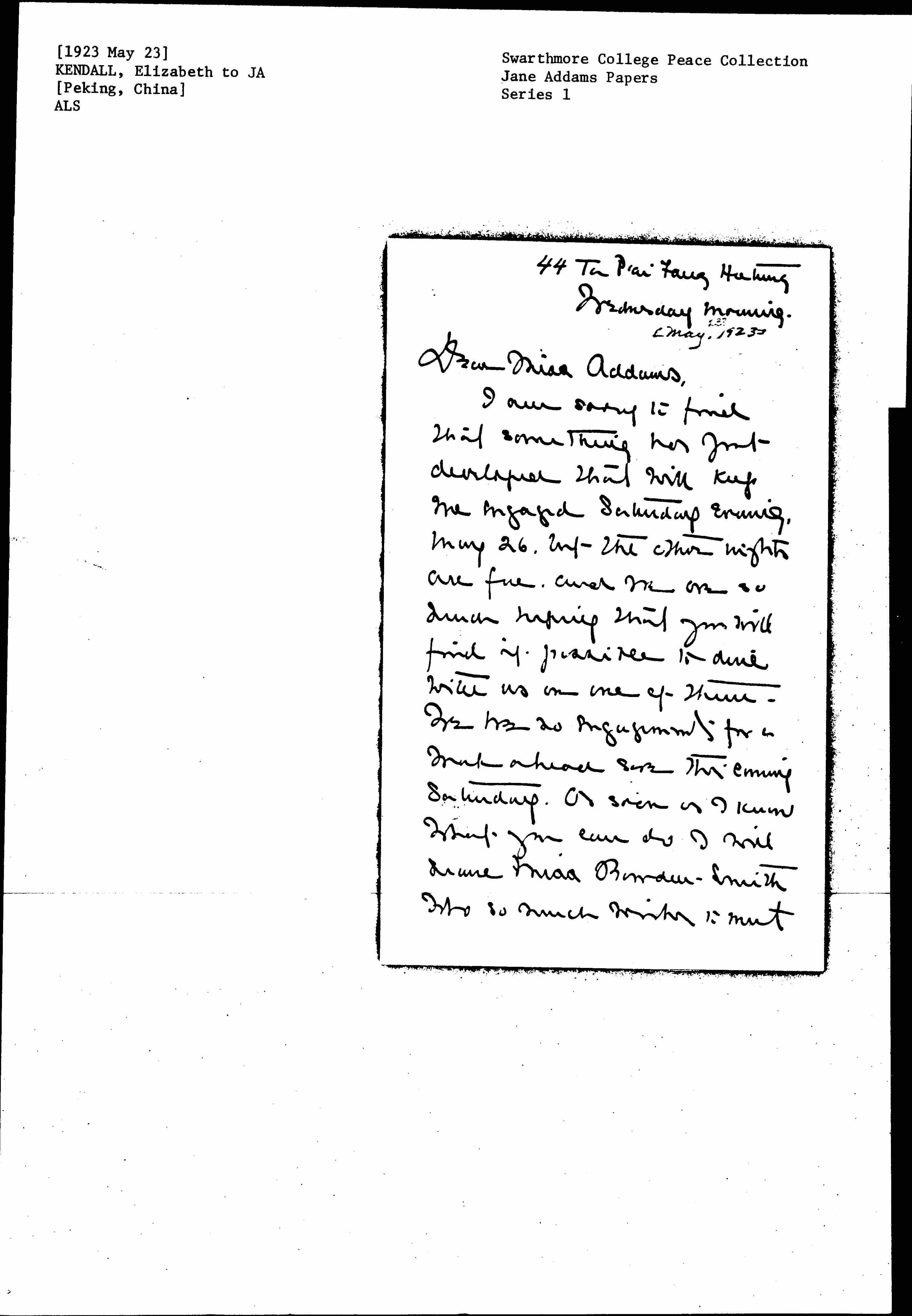 I am sorry to find that something has just developed that will keep me engaged Saturday evening, May 26, but the other nights are free and we are so much hoping that you will find it possible to dine with us on one of them. We have no engagements for a week ahead since this coming Saturday. As soon as I know what you can do I will secure Miss Bowden-Smith who so much wishes to meet [page 2] you and Miss Smith.