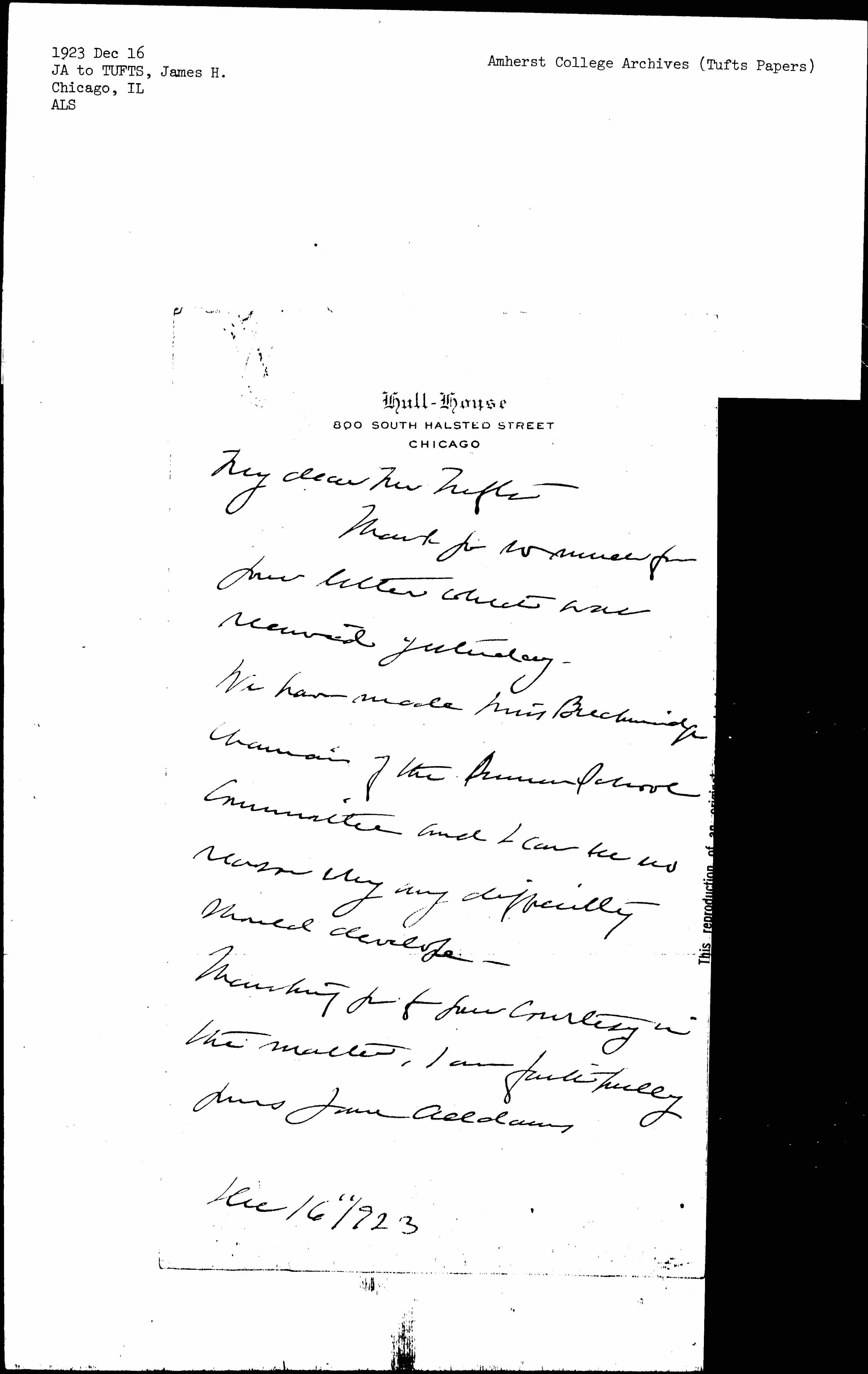 Thanking you for your courtesy in the matter, I am faithfully yours Jane Addams