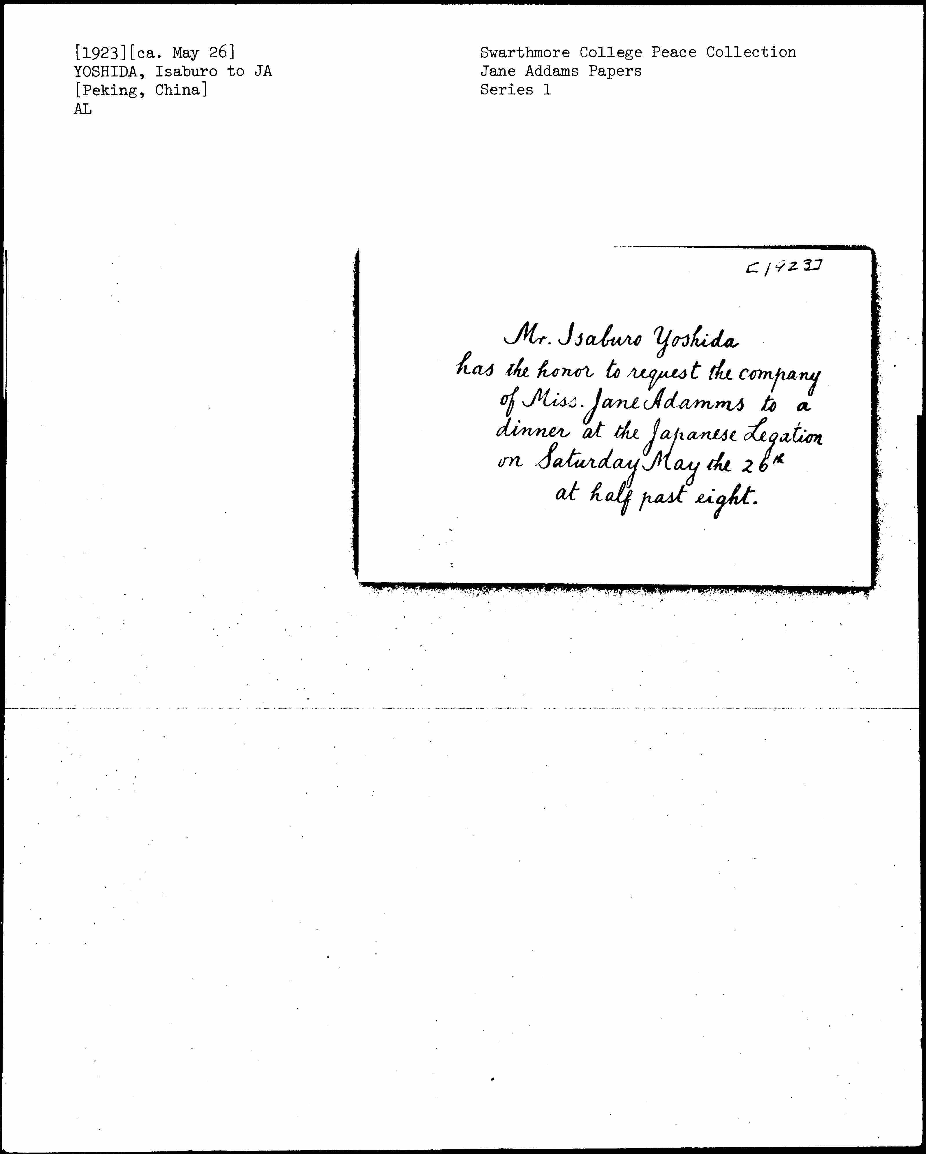 Mr. Isaburo Yoshida has the honor to request the company of Miss. Jane [Addams] to a dinner at the Japanese Legation on Saturday May the 26th at half past eight.