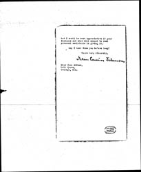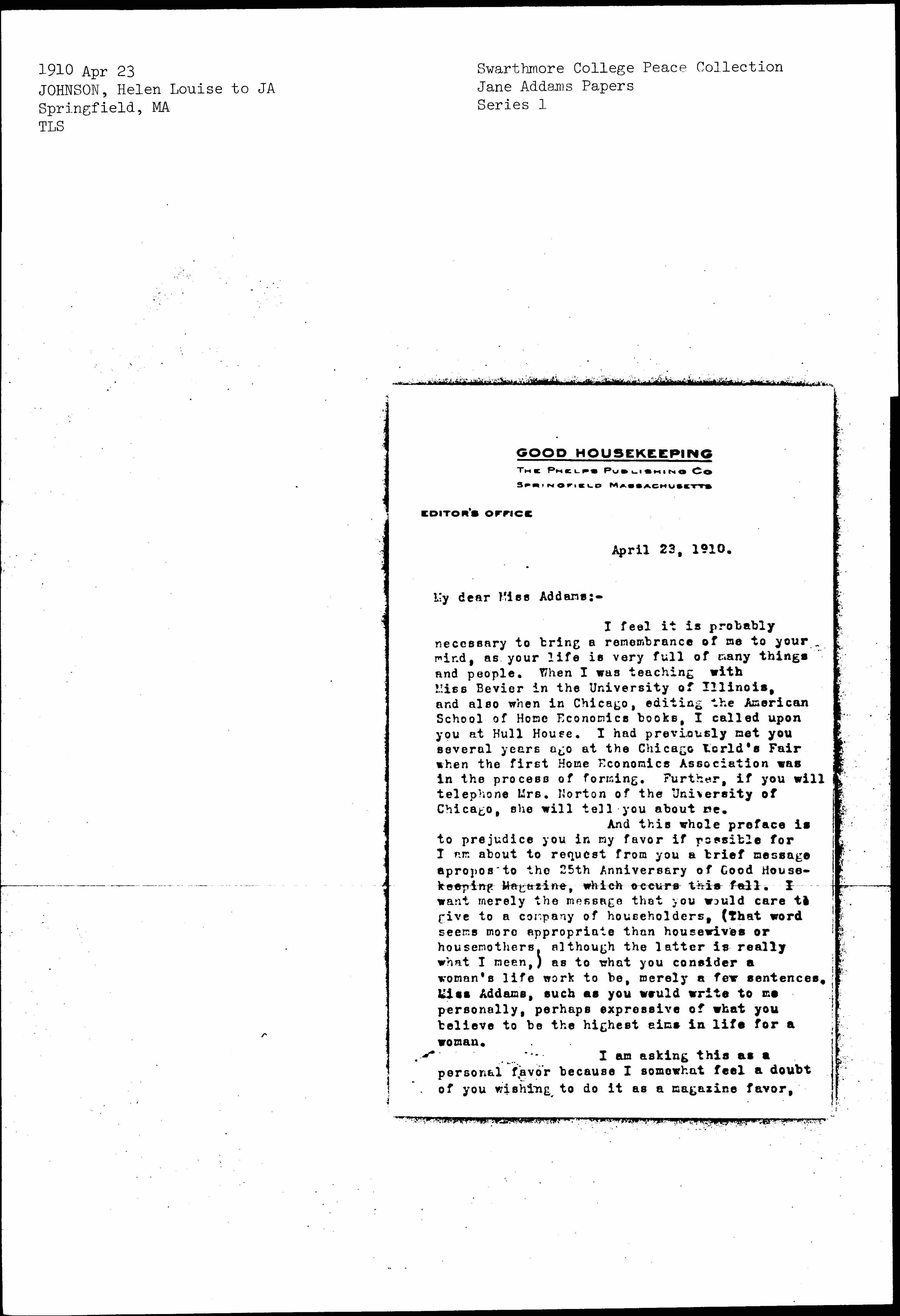 And this whole preface is to prejudice you in my favor if possible for I am about to request from you a brief message apropos to the 25th Anniversary of Good Housekeeping Magazine, which occurs this fall. I want merely the message that you would care to give to a company of householders, (That word seems more appropriate than housewives or housemothers, although the latter is really what I mean,) as to what you consider a woman's life work to be, merely a few sentences. Miss Addams, such as you would write to me personally, perhaps expressive of what you believe to be the highest aims in life for a woman.