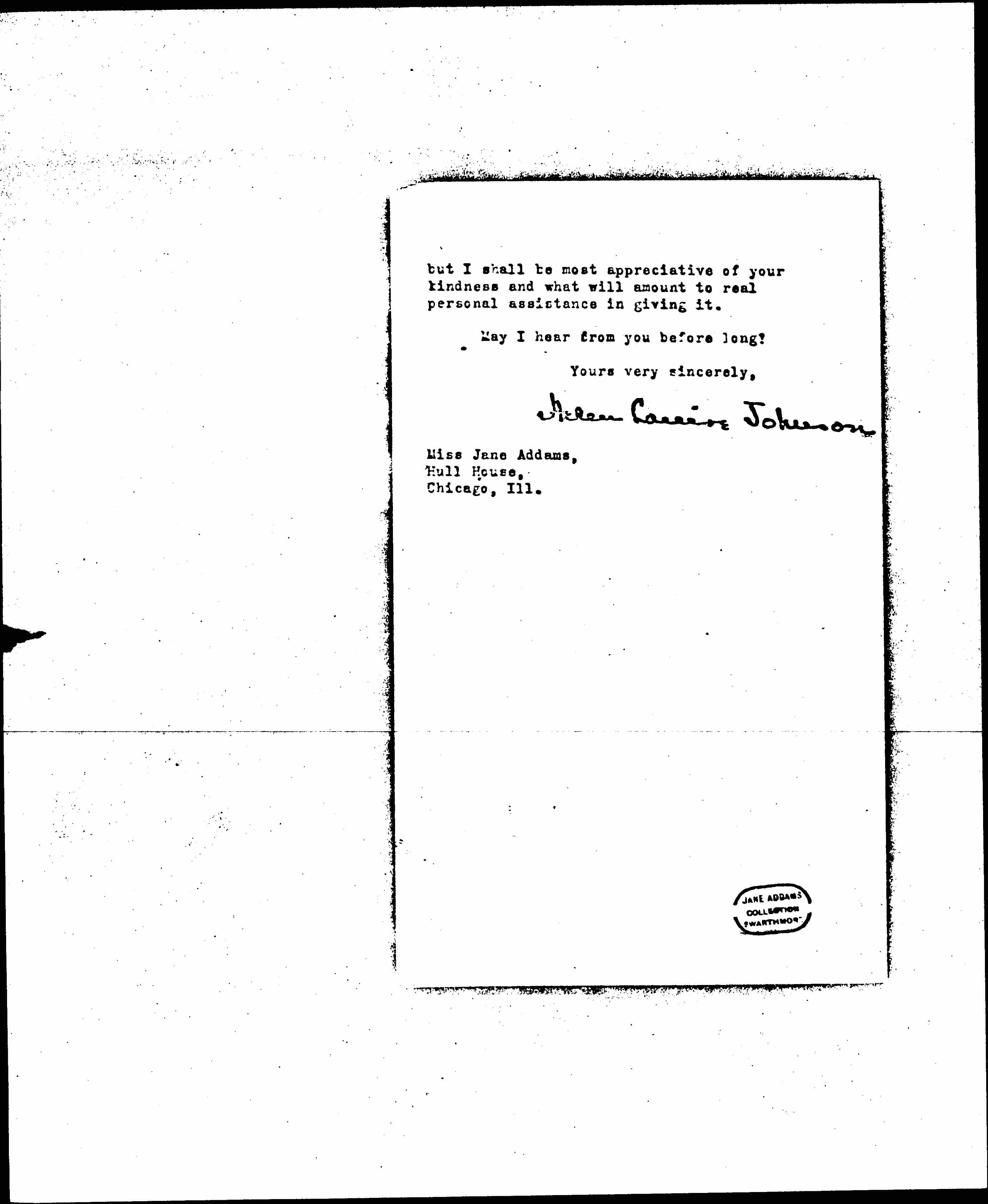 I feel it is probably necessary to bring a remembrance of me to your mind, as your life is very full of many things and people. When I was teaching with Miss Bevier in the University of Illinois, and also when in Chicago, editing the American School of Home Economics books, I called upon you at Hull House. I had previously met you several years ago at the Chicago World's Fair when the first Home Economics Association was in the process of forming. Further, if you will telephone Mrs. Norton of the University of Chicago, she will tell you about me.