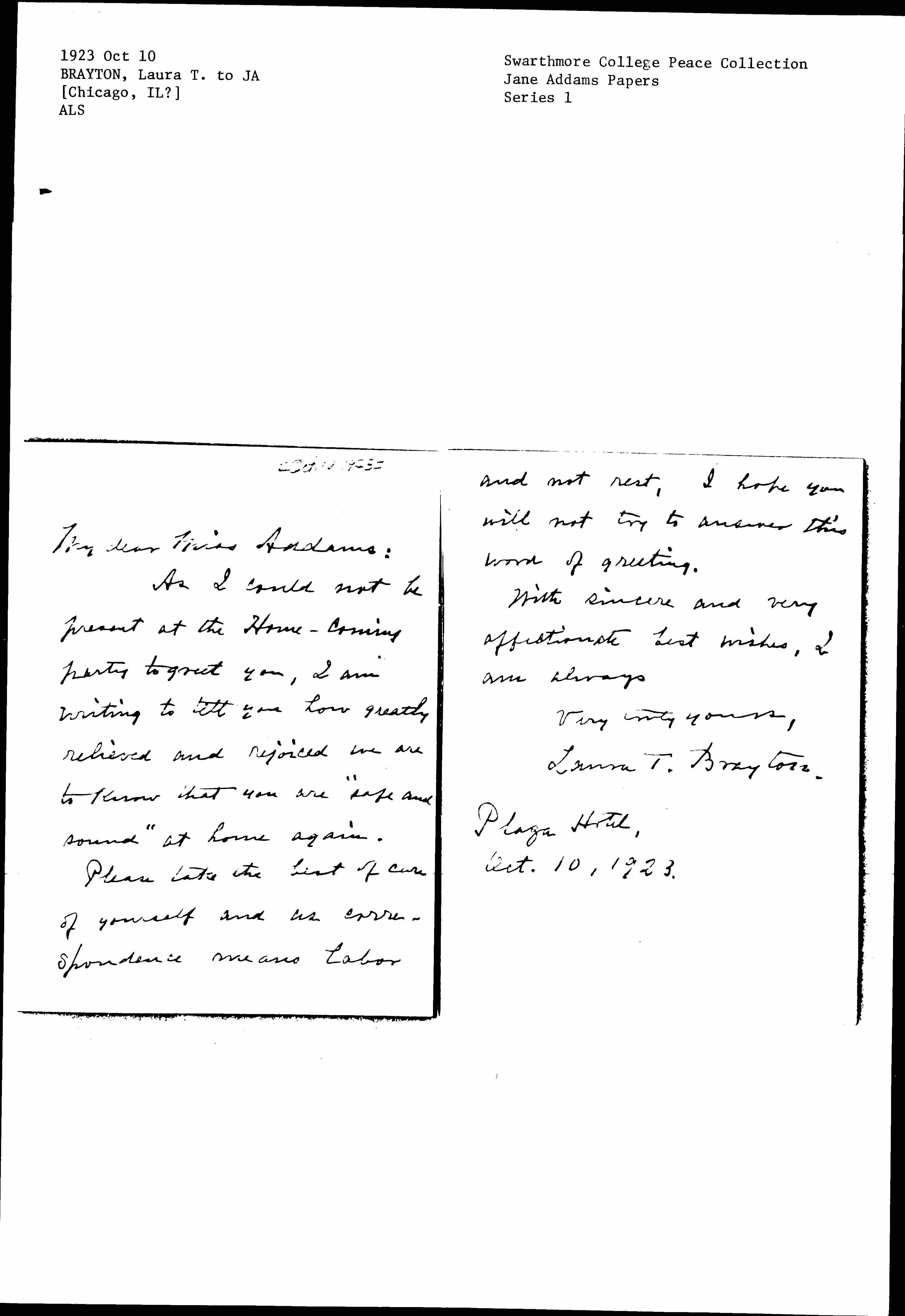 Please take the best of care of yourself and as correspondence means labor [page 2] and not rest, I hope you will not try to answer this word of greeting.