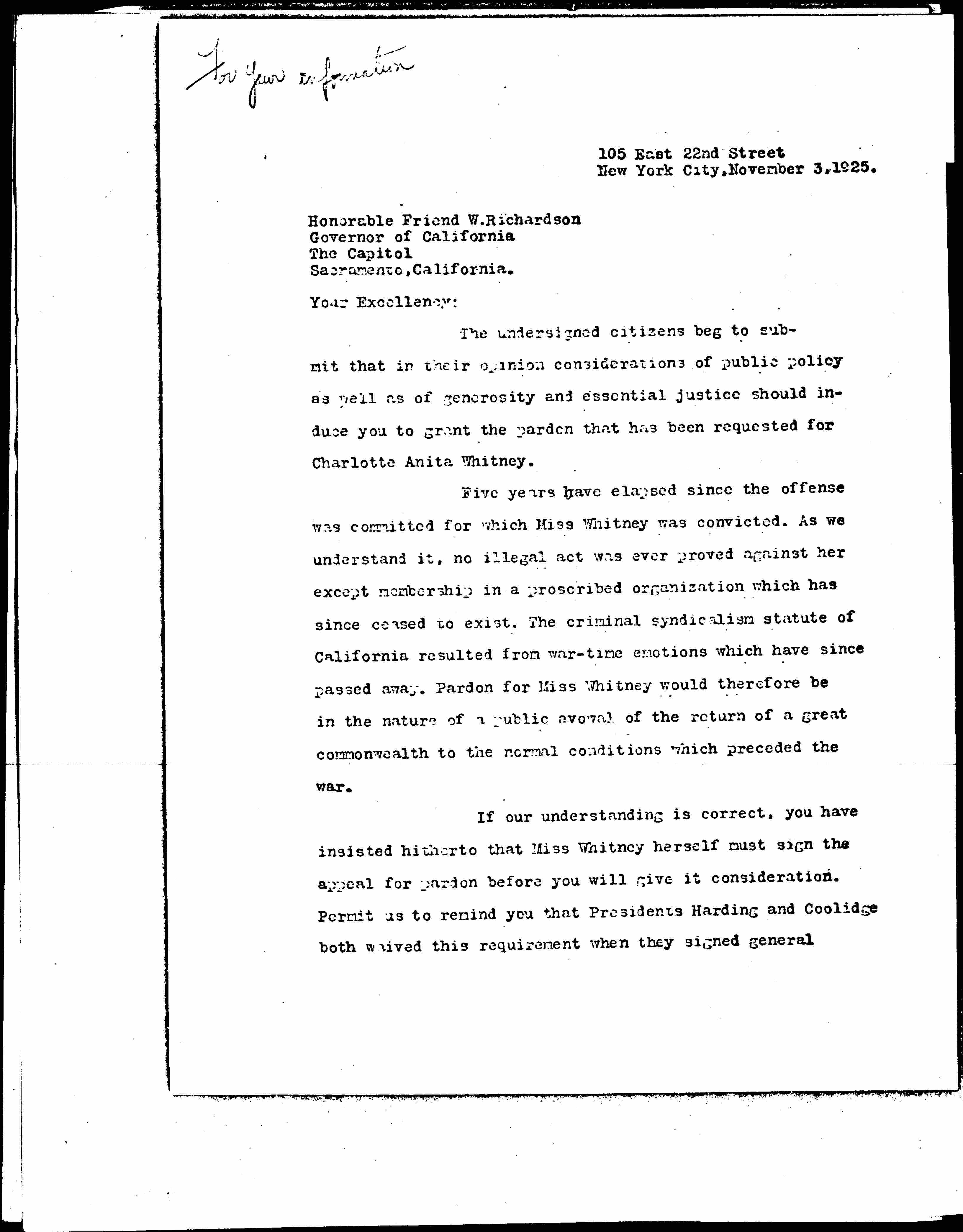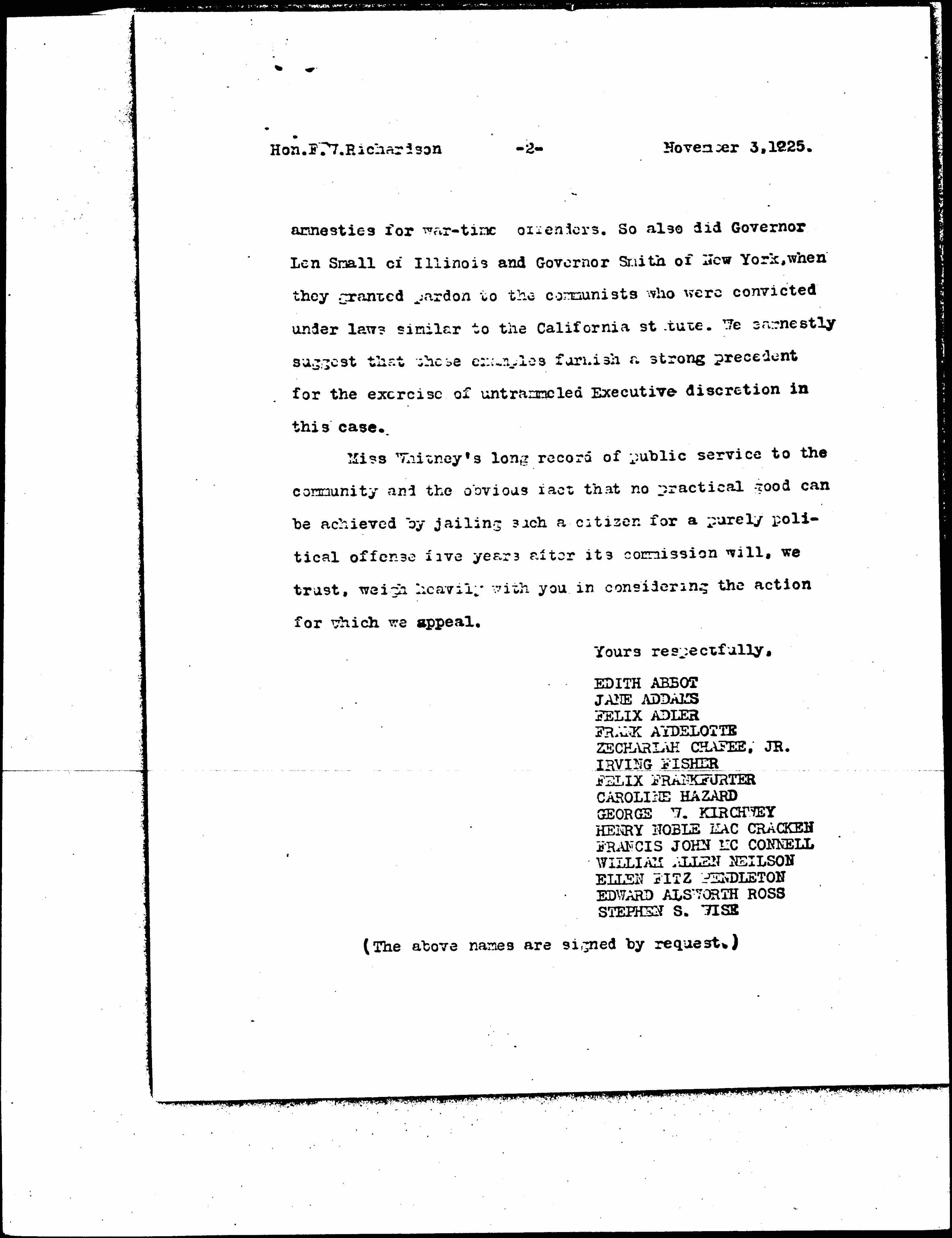 If our understanding is correct, you have insisted hitherto that Miss Whitney herself must sign the appeal for pardon before you will give it consideration. Permit us to remind you that Presidents Harding and Coolidge both waived this requirement when they signed general [page 2] amnesties for war-time offenders. So also did Governor Len Small of Illinois and Governor Smith of New York, when they granted pardon to the communists who were convicted under laws similar to the California statute. We earnestly suggest that those examples furnish a strong precedent for the exercise of untrammeled Executive discretion in this case.
