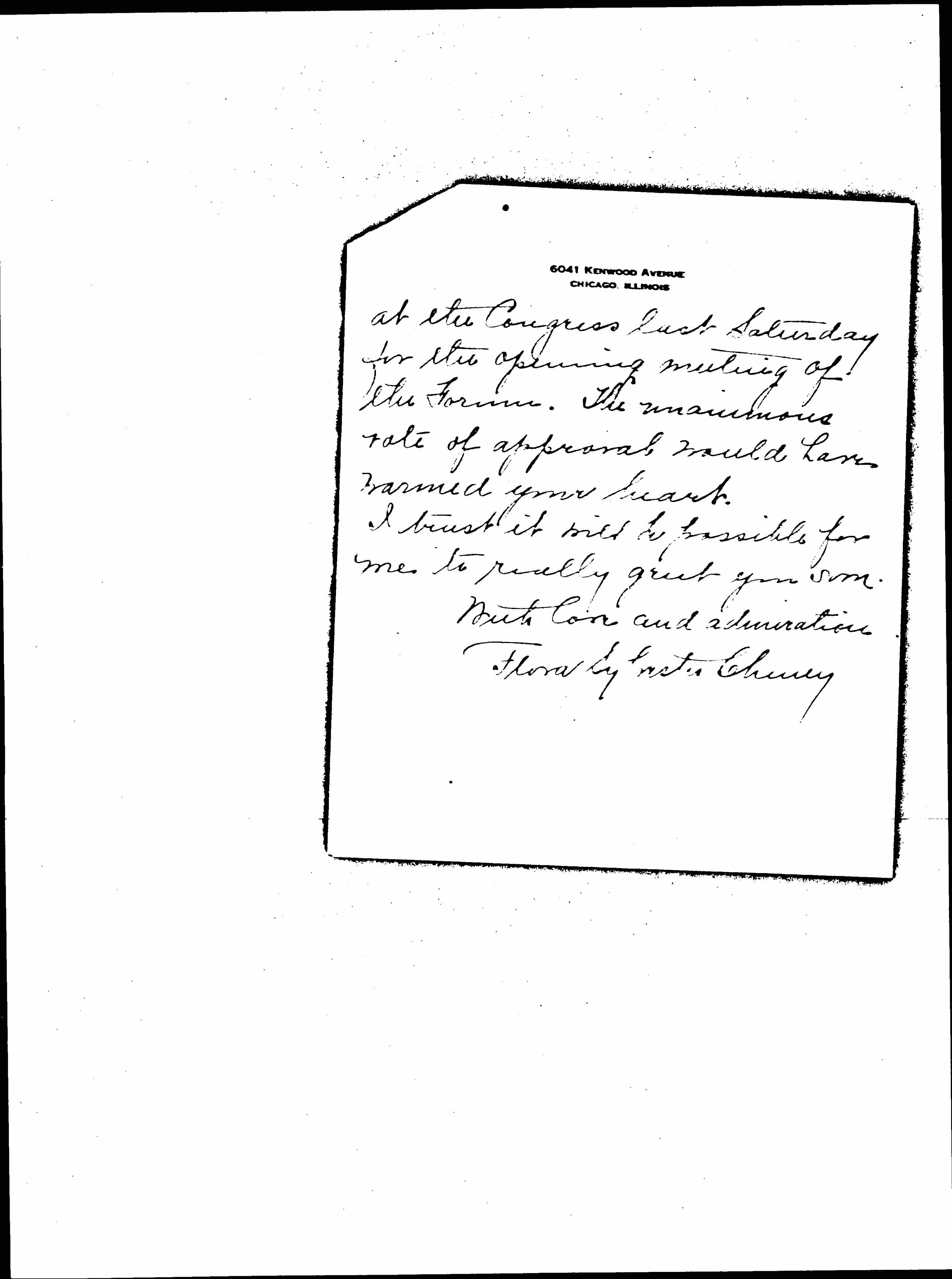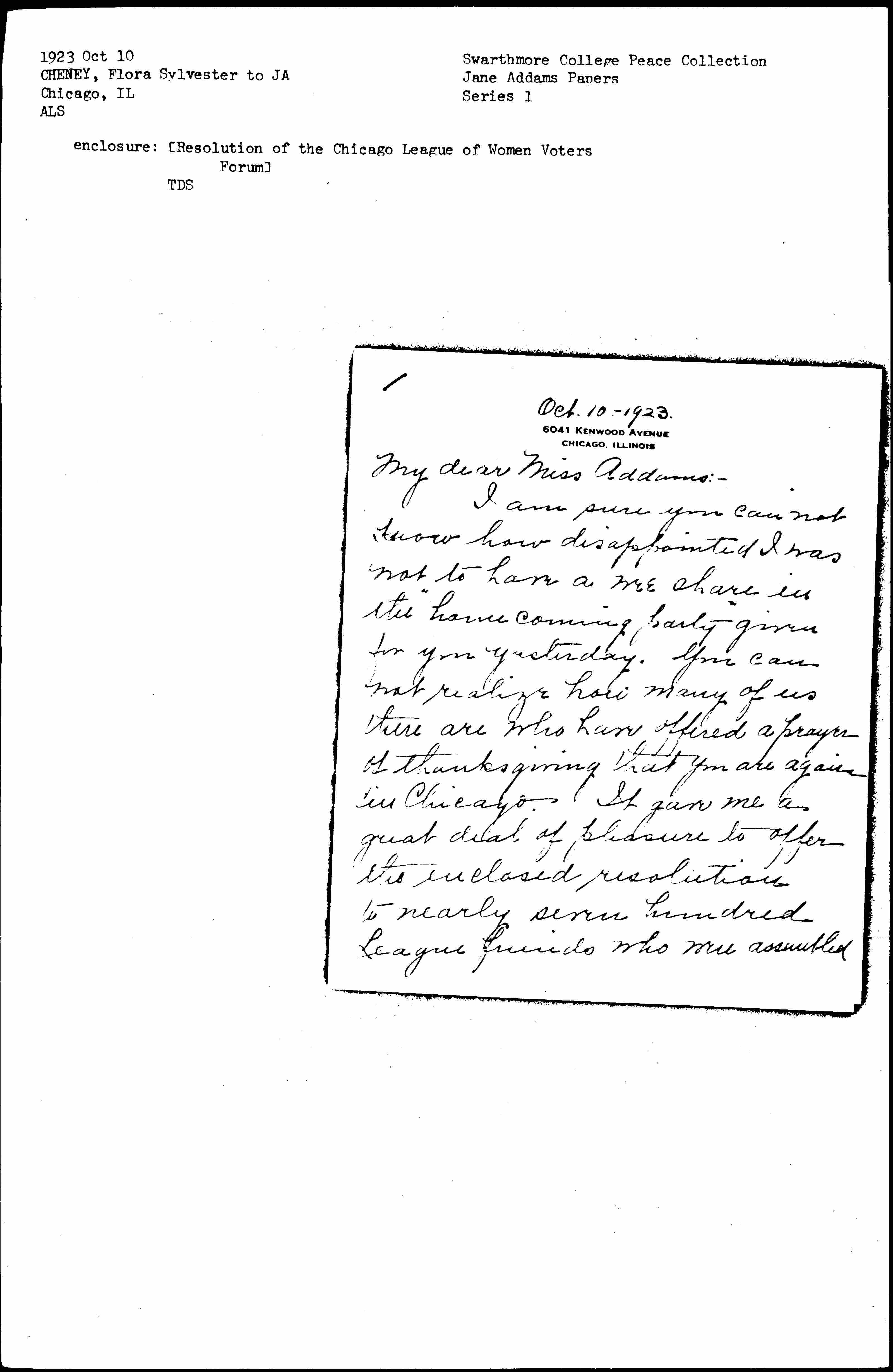 I am sure you can not know how disappointed I was not to have a wee share in the "homecoming party" given for you yesterday. You can not realize how many of us there are who have offered a prayer of thanksgiving that you are again in Chicago. It gave me a great deal of pleasure to offer the enclosed resolution to nearly seven hundred League friends who were assembled [page 2] at the Congress last Saturday for the opening meeting of the Forum. The unanimous vote of approval would have warmed your heart.