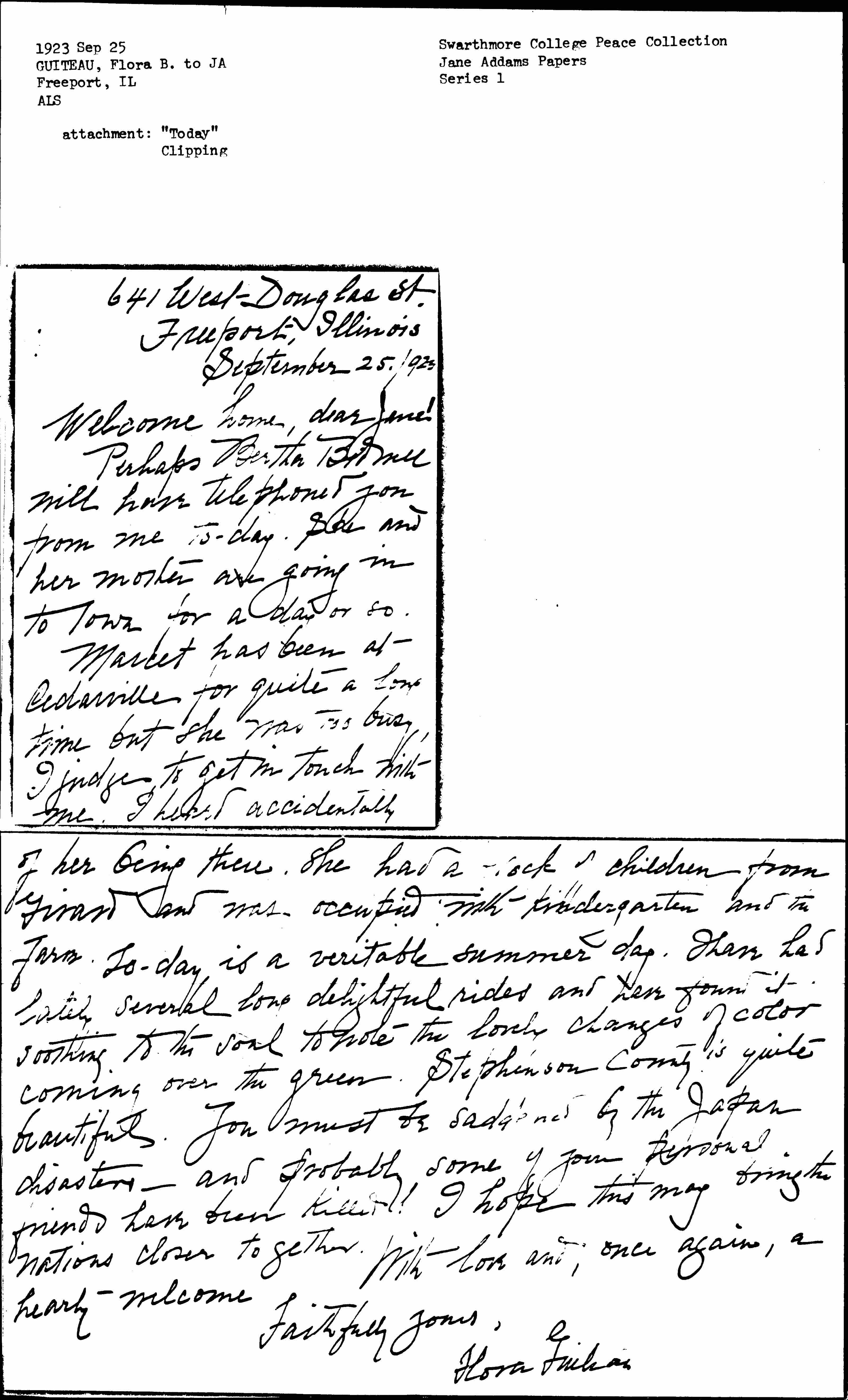 Marcet has been at Cedarville for quite a long time but she was too busy, I judge, to get in touch with me. I heard accidentally [page 2] of her being there. She had a [flock] of children from Girard and was occupied with kindergarten and the farm. [Today] is a veritable summer day. I have had lately several long delightful rides and have found it soothing to the soul to note the lovely changes of color coming over the green. Stephenson County is quite beautiful. You must be saddened by the Japan disasters -- and probably some of your personal friends have been killed! I hope this may bring the nations closer together.