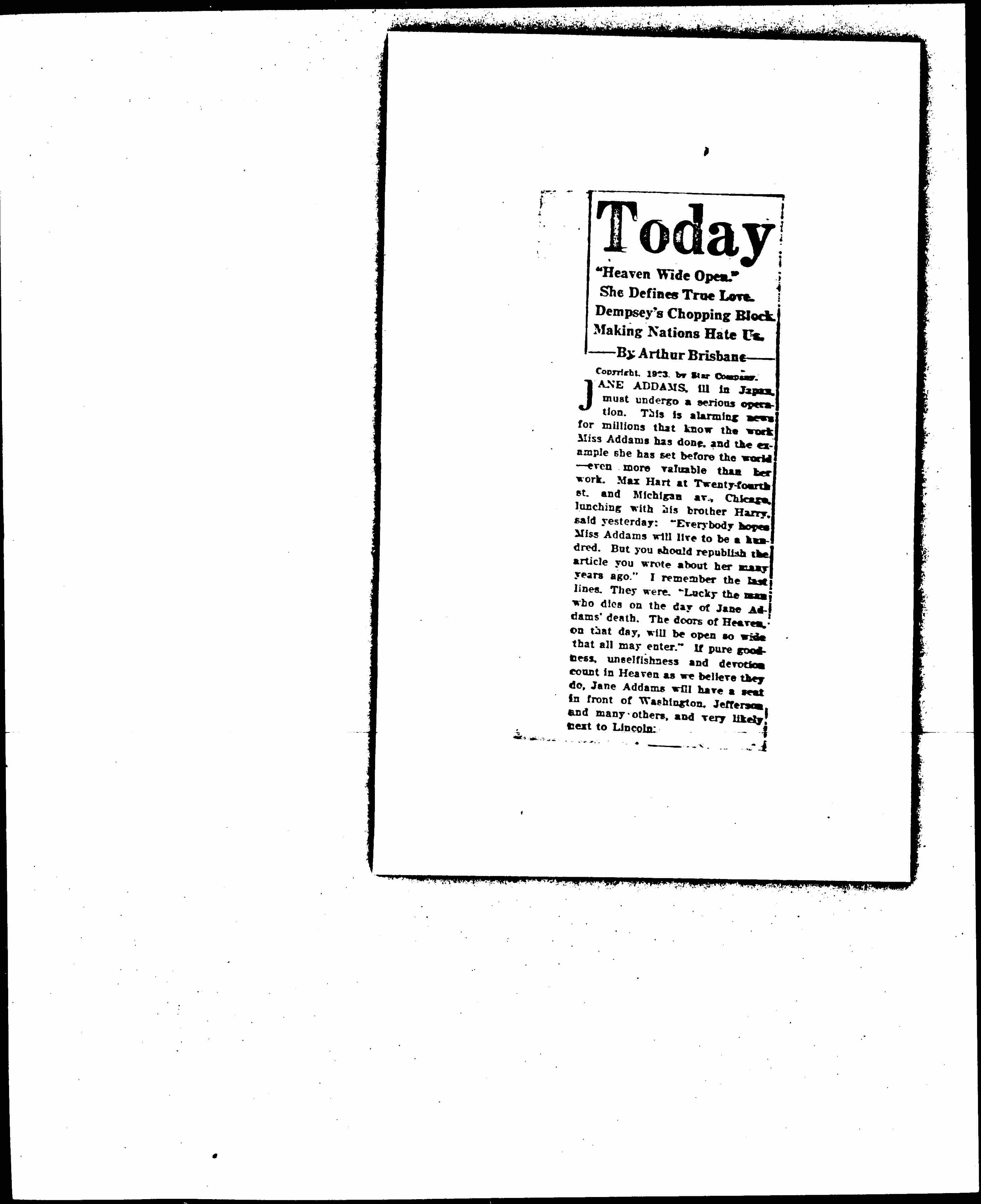 JANE ADDAMS, ill in Japan, must undergo a serious operation. This is alarming news for millions that know the work Miss Addams has done, and the example she has set before the world -- even more valuable than her work. Max Hart at Twenty-fourth St. and Michigan Av., Chicago, lunching with his brother Harry, said yesterday: "Everybody hopes Miss Addams will live to be a hundred. But you should republish the article you wrote about her many years ago." I remember the last lines. They were, "Lucky the man who dies on the day of Jane Addams' death. The doors of Heaven, on that day, will be open so wide that all may enter." If pure goodness, unselfishness and devotion count in Heaven as we believe they do, Jane Addams will have a seat in front of Washington, Jefferson and many others, and very likely next to Lincoln.