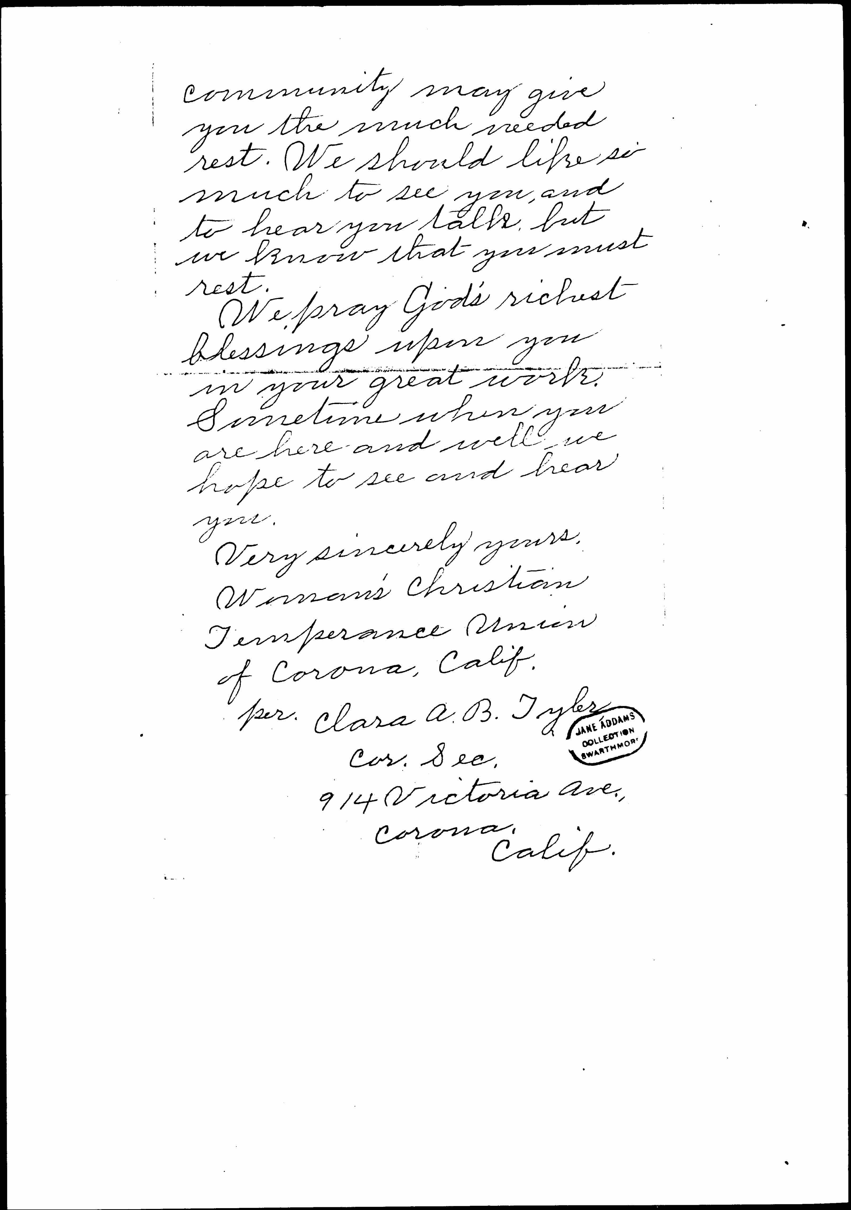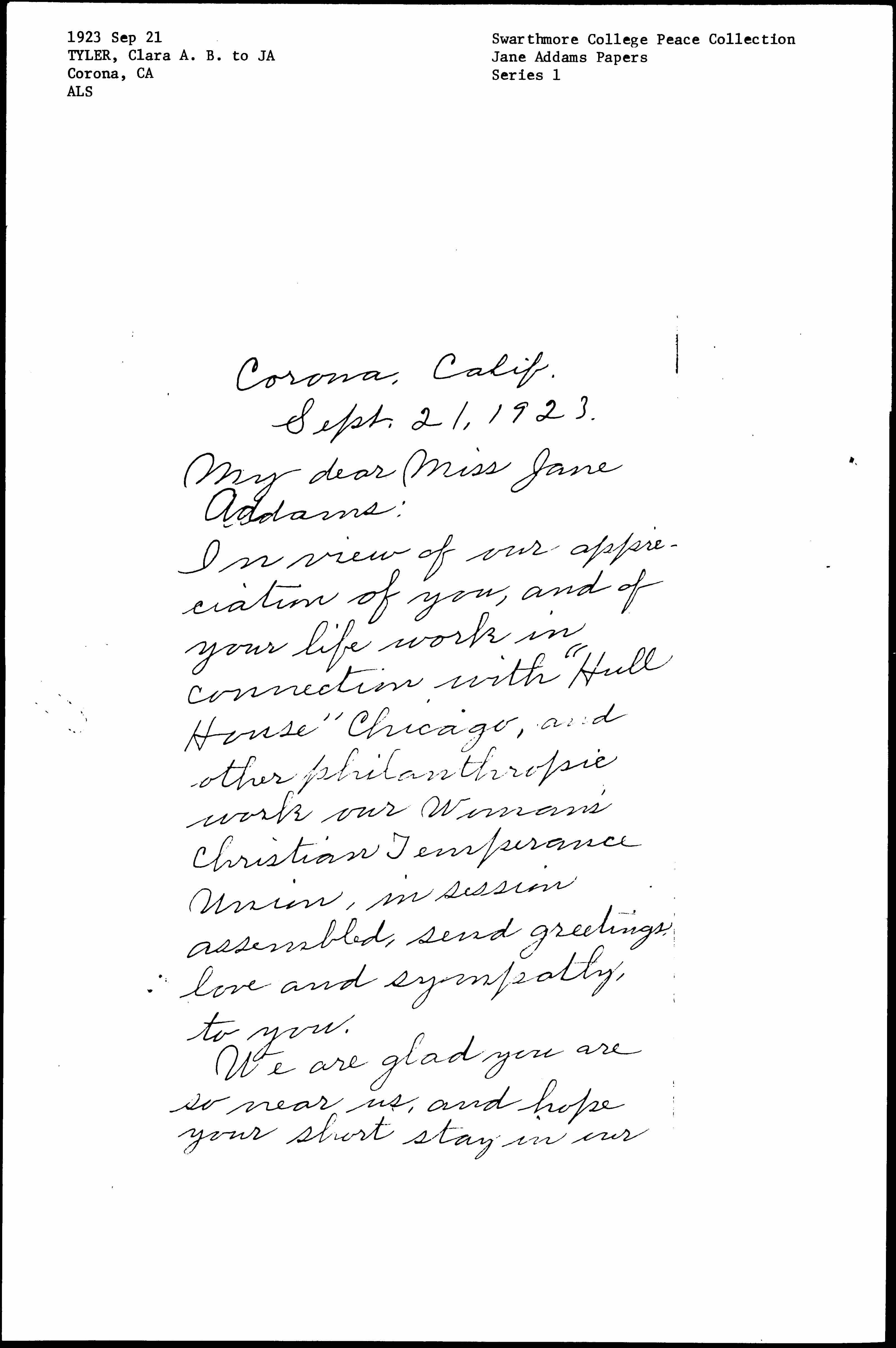 In view of our appreciation of you, and of your life work in connection with "Hull House" Chicago, and other philanthropic work our Woman's Christian Temperance Union, in session assembled, send greetings, love and sympathy, to you.