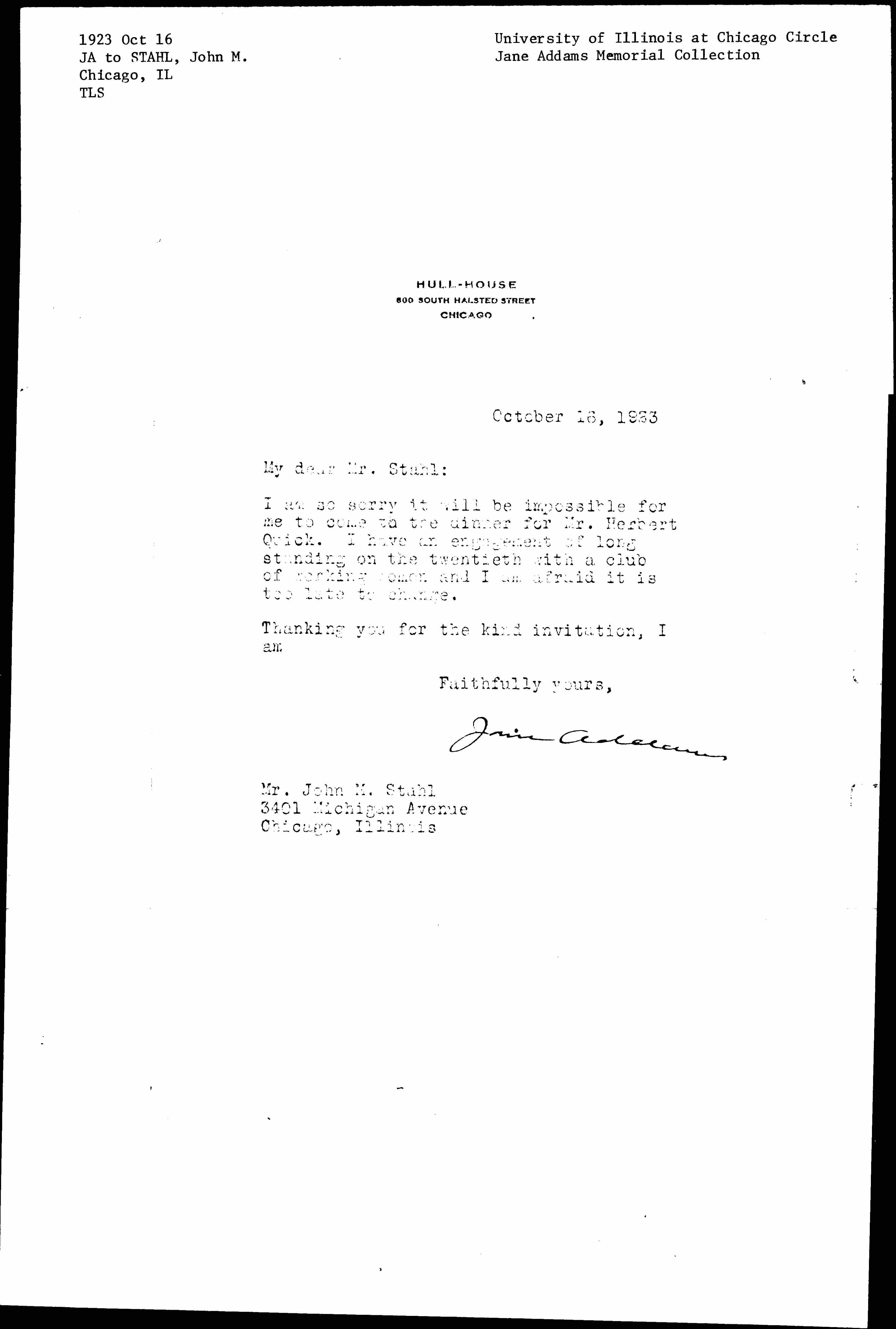 I am so sorry it will be impossible for me to come to the dinner for Mr. Herbert Quick. I have an engagement of long standing on the twentieth with a club of working women and I am afraid it is too late to change.