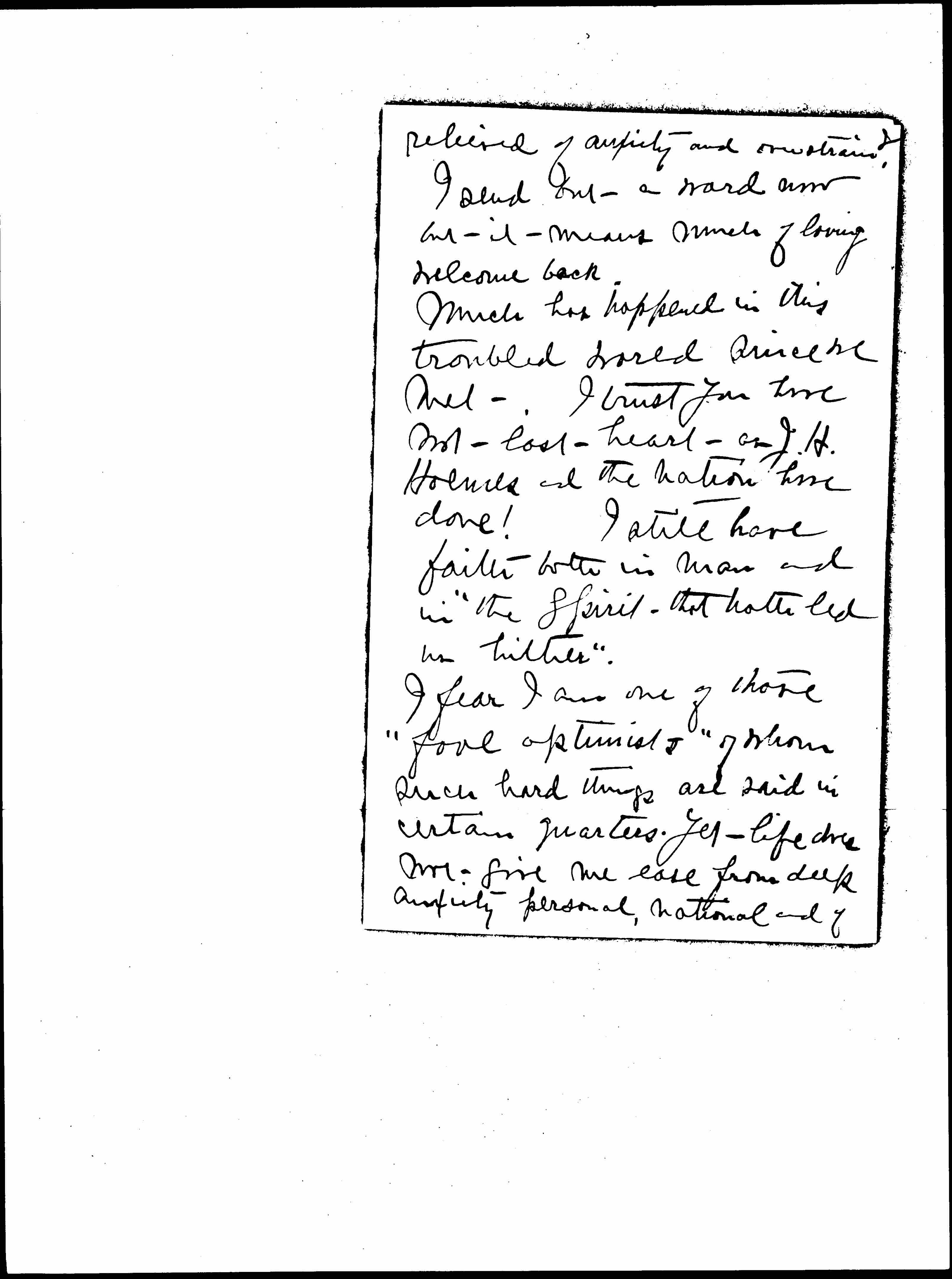 Much has happened in this troubled world since we met. I trust you have not lost heart as J. H. Holmes and the nation have done! I still have faith both in man and in "the spirit that hath led us hither".