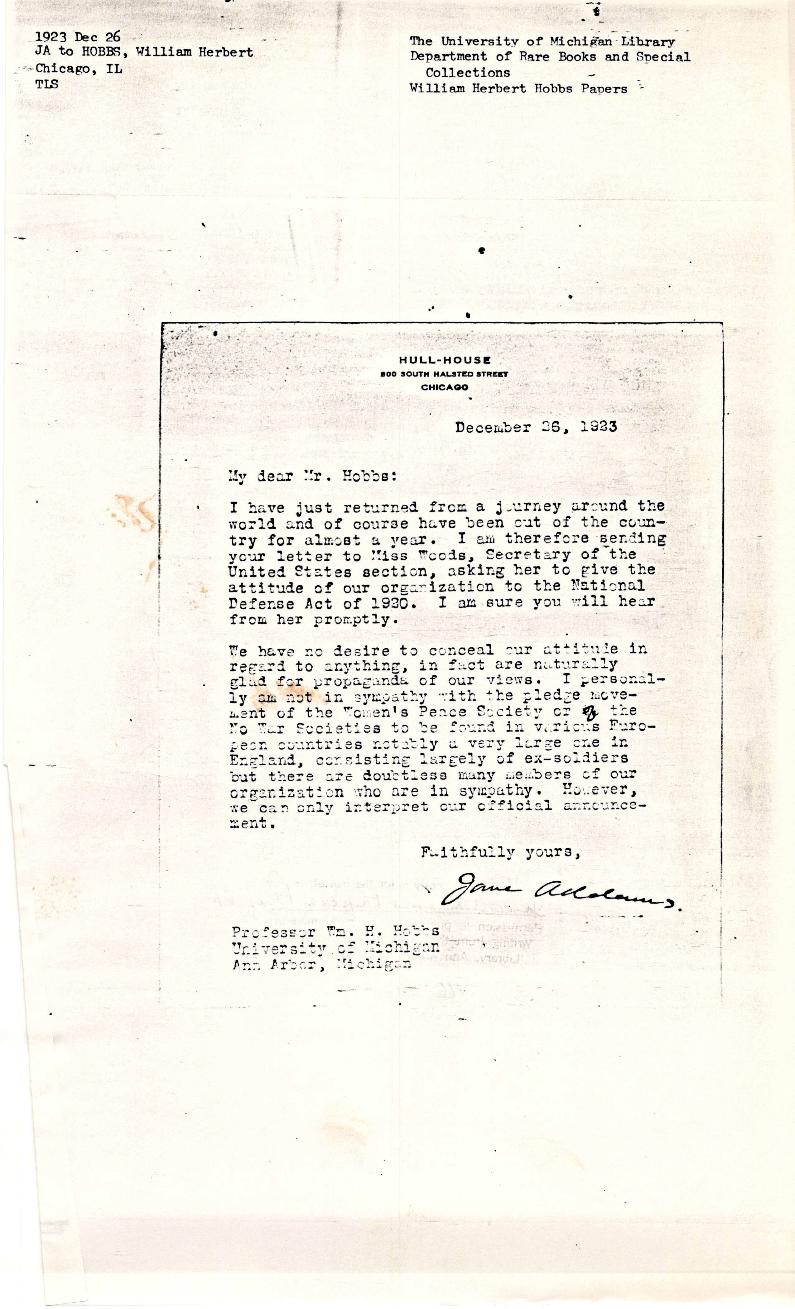 I have just returned from a journey around the world and of course have been out of the country for almost a year. I am therefore sending your letter to Miss Woods, Secretary of the United States section, asking her to give the attitude of our organization to the National Defense Act of 1920. I am sure you will hear from her promptly.
