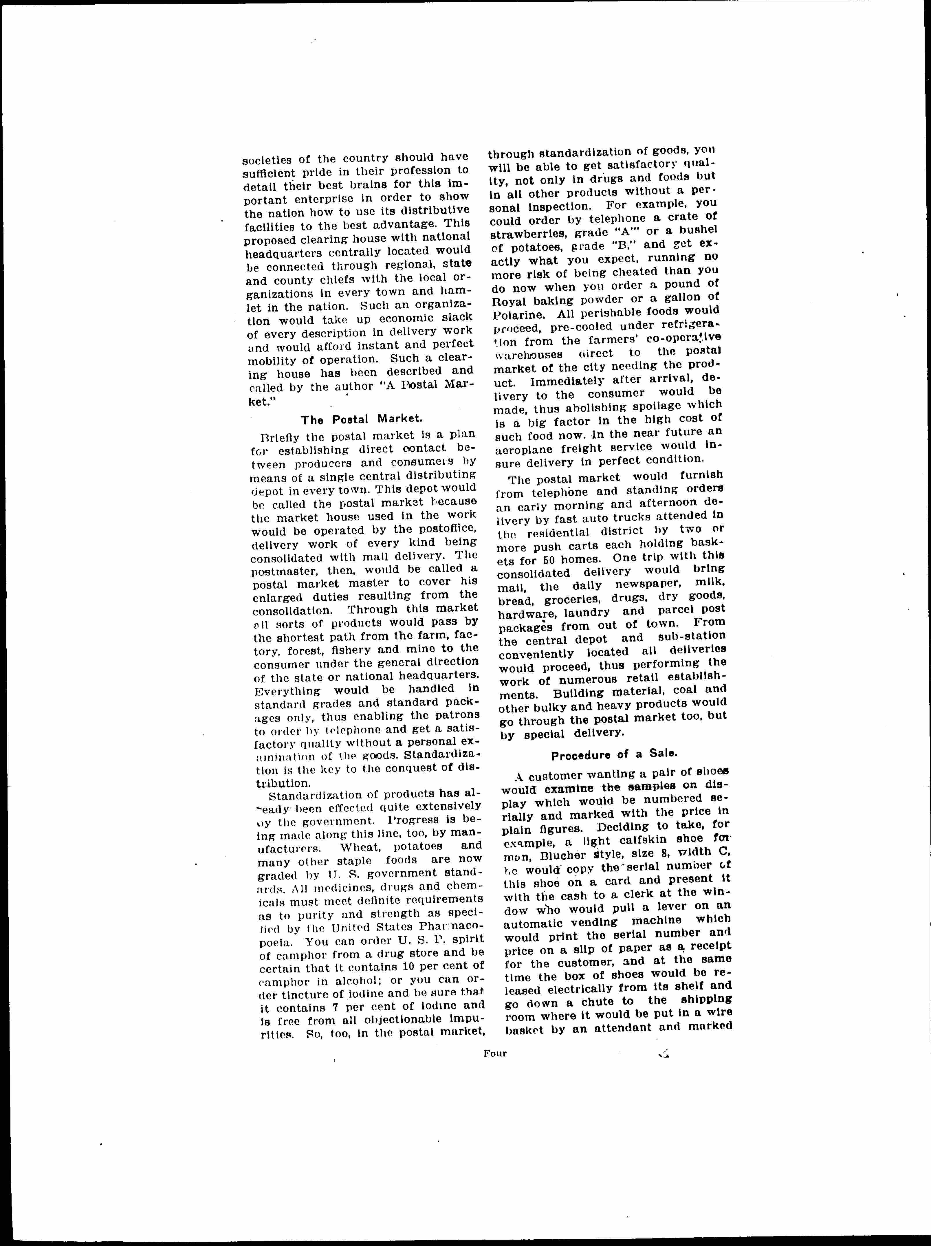 Standardization of products has already been [affected] quite extensively by the government. Progress is being made along this line, too, by manufacturers. Wheat, potatoes and many other staple foods are now graded by U.S. government standards. All medicines, drugs and chemicals must meet definite requirements as to purity and strength as specified by the United States Pharmacopoeia. You can order U.S.P. spirit of camphor from a drug store and be certain that it contains 10 [percent] of camphor in alcohol; or you can order tincture of iodine and be sure that it contains 7 [percent] of iodine and is free from all objectionable impurities. So, too, in the postal market, through standardization of goods, you will be able to get satisfactory quality, not only in drugs and foods but in all other products without a personal inspection. For example, you could order by telephone a crate of strawberries, grade "A" or a bushel of potatoes, grade "B," and get exactly what you expect, running no more risk of being cheated than you do now when you order a pound of Royal baking powder or a gallon of Polarine. All perishable foods would proceed, pre-cooled under refrigeration from the farmers' [cooperative] warehouses direct to the postal market of the city needing the product. Immediately after arrival, delivery to the consumer would be made, thus abolishing spoilage which is a big factor in the high cost of such food now. In the near future an [airplane] freight service would [ensure] delivery in perfect condition.