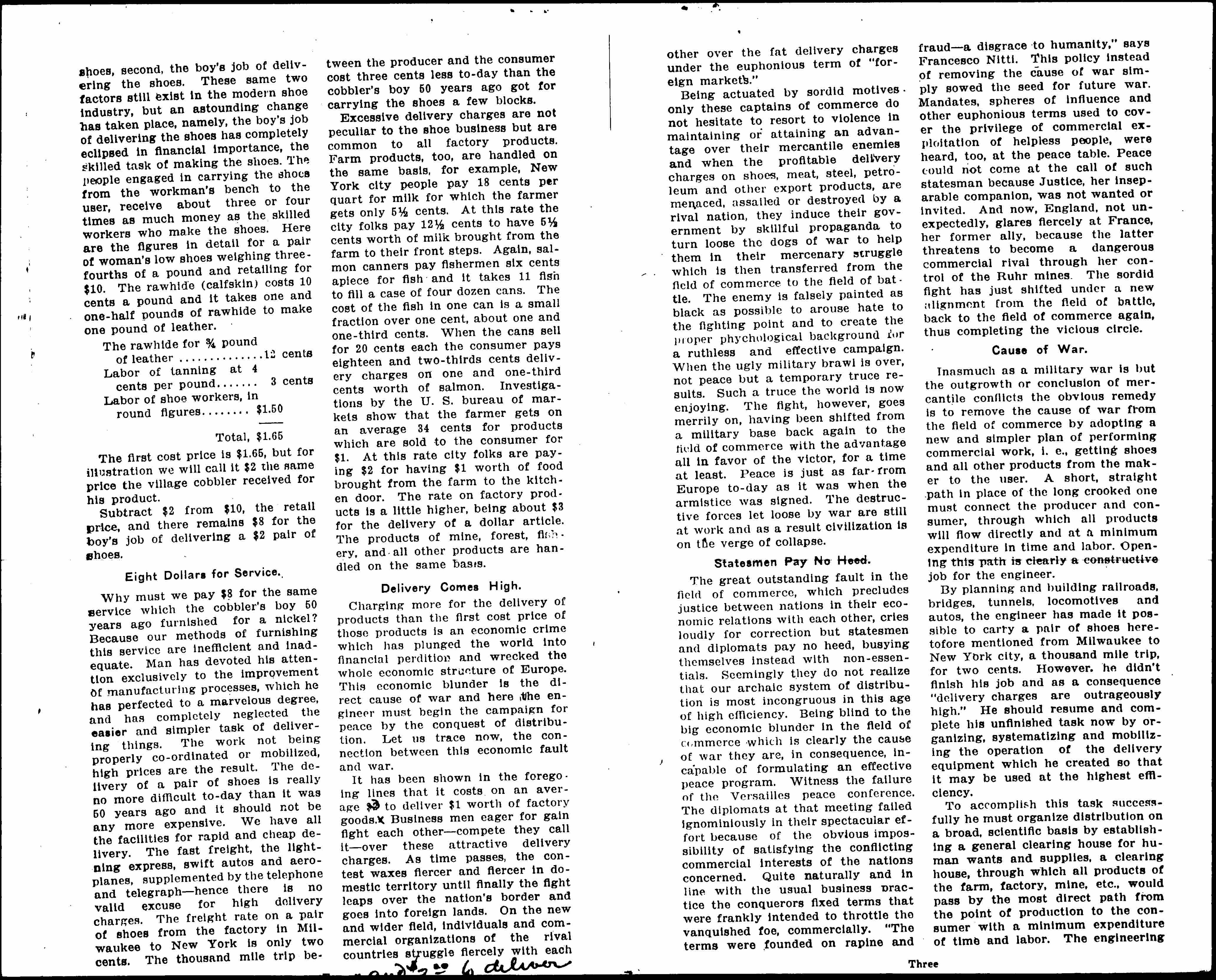 Why must we pay $8 for the same service which the cobbler's boy 50 years ago furnished for a nickel? Because our methods of furnishing this service are inefficient and inadequate. Man has devoted his attention exclusively to the improvement of manufacturing processes, which he has perfected to a marvelous degree, and has completely neglected the easier and simpler task of delivering things. The work not being properly [coordinated] or mobilized, high prices are the result. The delivery of a pair of shoes is really no more difficult [today] than it was 50 years ago and it should not be any more expensive. We have all the facilities for rapid and cheap delivery. The fast freight, the lightning express, swift autos and [airplanes], supplemented by the telephone and telegraph -- hence there is no valid excuse for high delivery charges. The freight rate in a pair of shoes from the factory in Milwaukee to New York is only two cents. The thousand mile trip between the producer and the consumer cost three cents less [today] than the cobbler's boy 50 years ago got for carrying the shoes a few blocks.