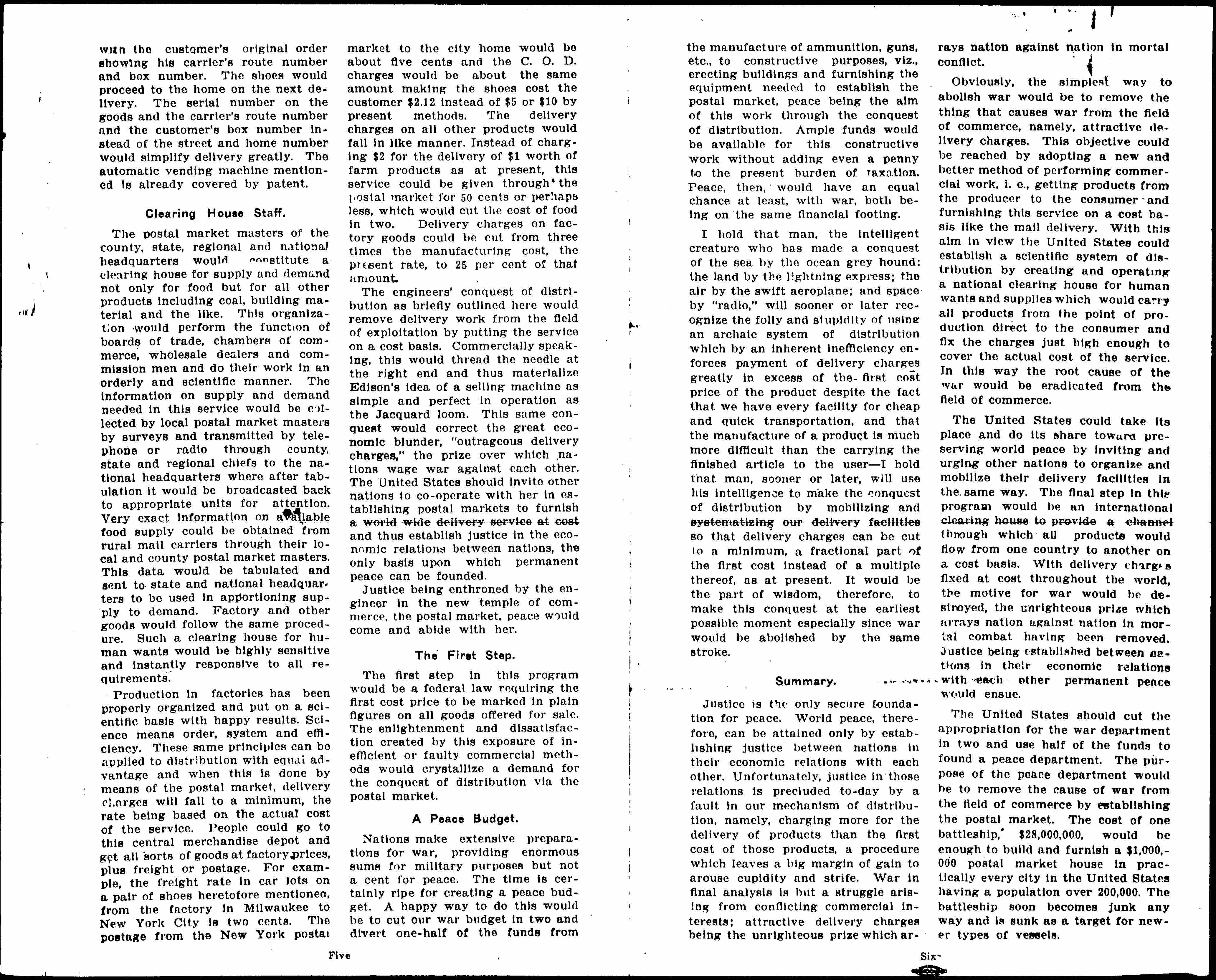 Nations make extensive preparations for war, providing enormous sums for military purposes but not a cent for peace. The time is certainly ripe for creating a peace budget. A happy way to do this would be to cut our war budget in two and divert one-half of the funds from [page 6] the manufacture of ammunition, guns, etc., to constructive purposes, viz., erecting buildings and furnishing the equipment needed to establish the postal market, peace being the aim of this work through the conquest of distribution. Ample funds would be available for this constructive work without adding even a penny to the present burden of taxation. Peace, then, would have an equal chance at least, with war, both being on the same financial footing.