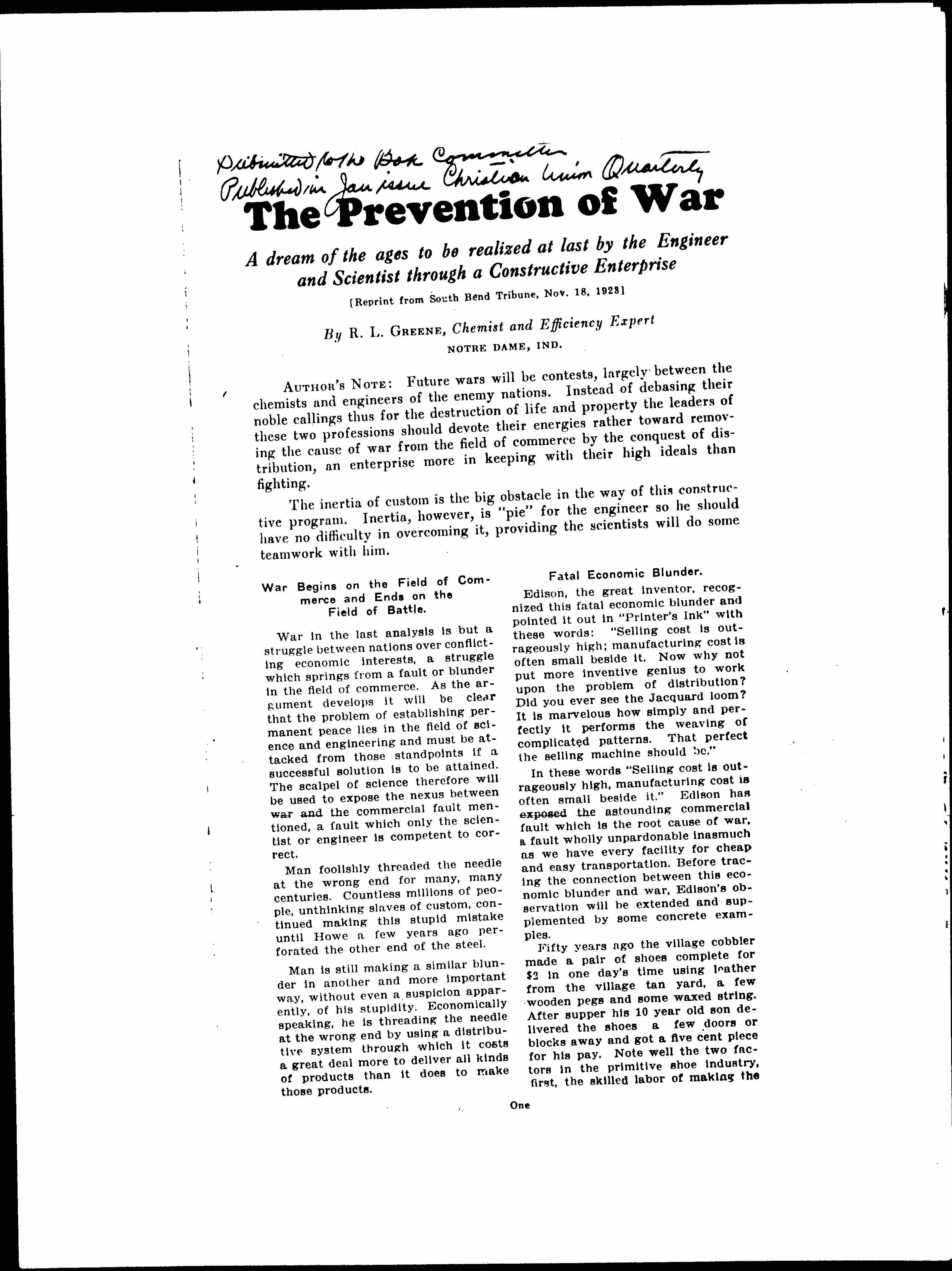 War in the last analysis is but a struggle between nations over conflicting economic interests, a struggle which springs from a fault or blunder in the field of commerce. As the argument develops it will be clear that the problem of establishing permanent peace lies in the field of science and engineering and must be attacked from those standpoints if a successful solution is to be attained. The scalpel of science therefore will be used to expose the nexus between war and the commercial fault mentioned, a fault which only the scientist or engineer is competent to correct.