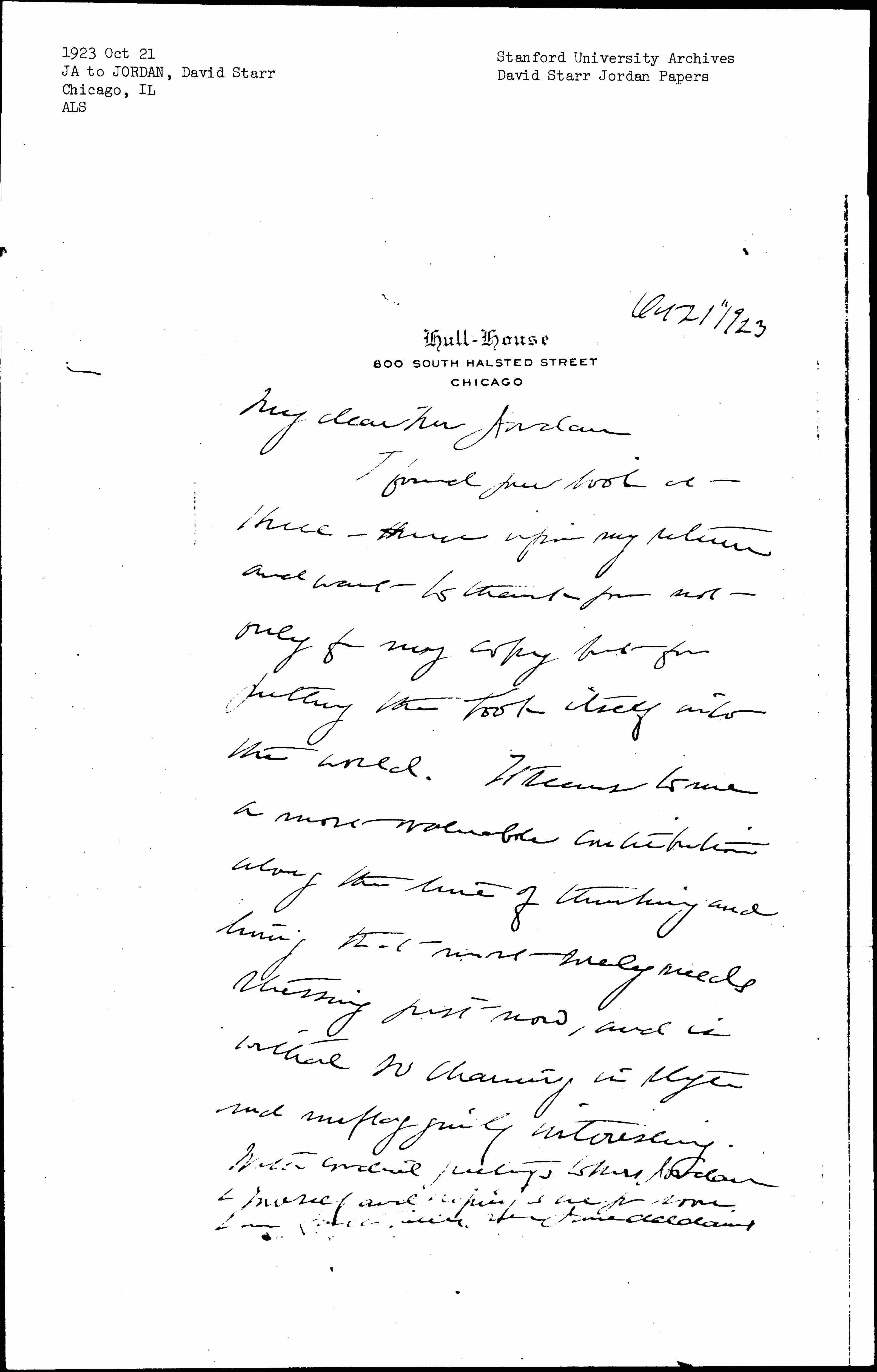 With cordial greetings to Mrs Jordan & yourself and hoping to see you soon, I am [faithfully] yours Jane Addams
