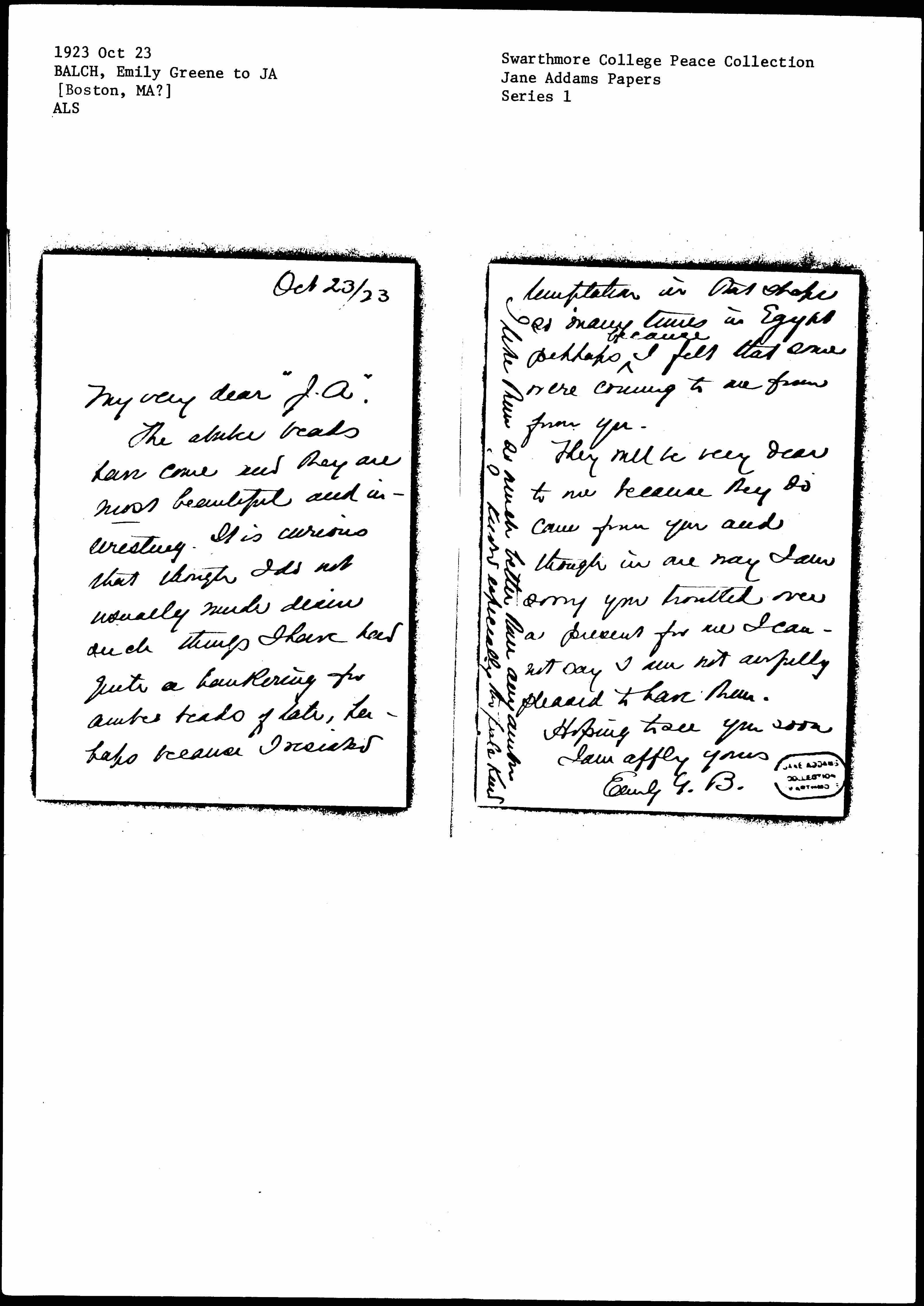 The [abuke?] beads came and they are most beautiful and interesting. It is curious that though I do not usually much desire such things I have had quite a hankering for amber beads of late, perhaps because I resisted [page 2] temptation in that shape so many times in Egypt perhaps ↑because↓ I felt that some were coming to me from you.