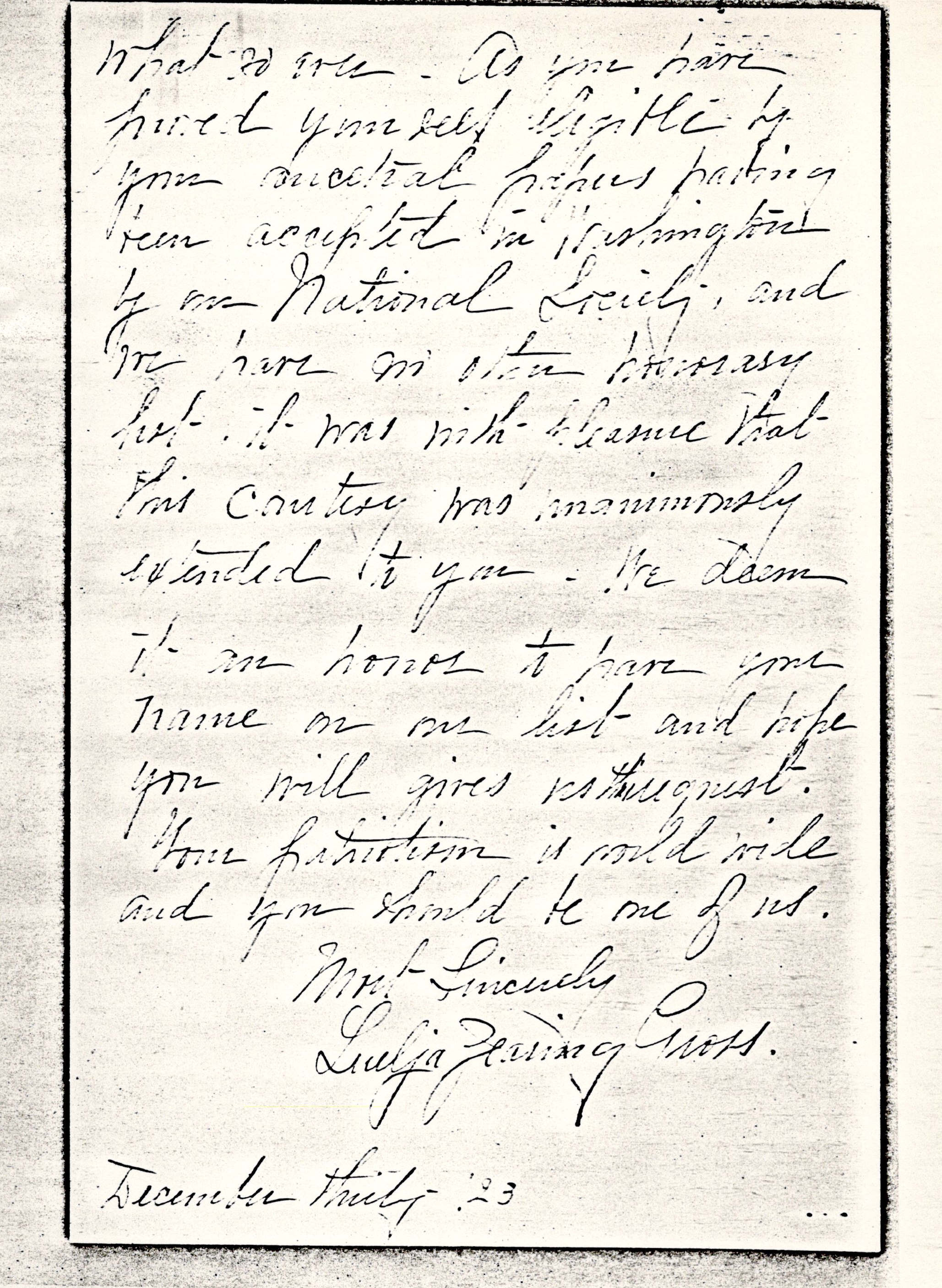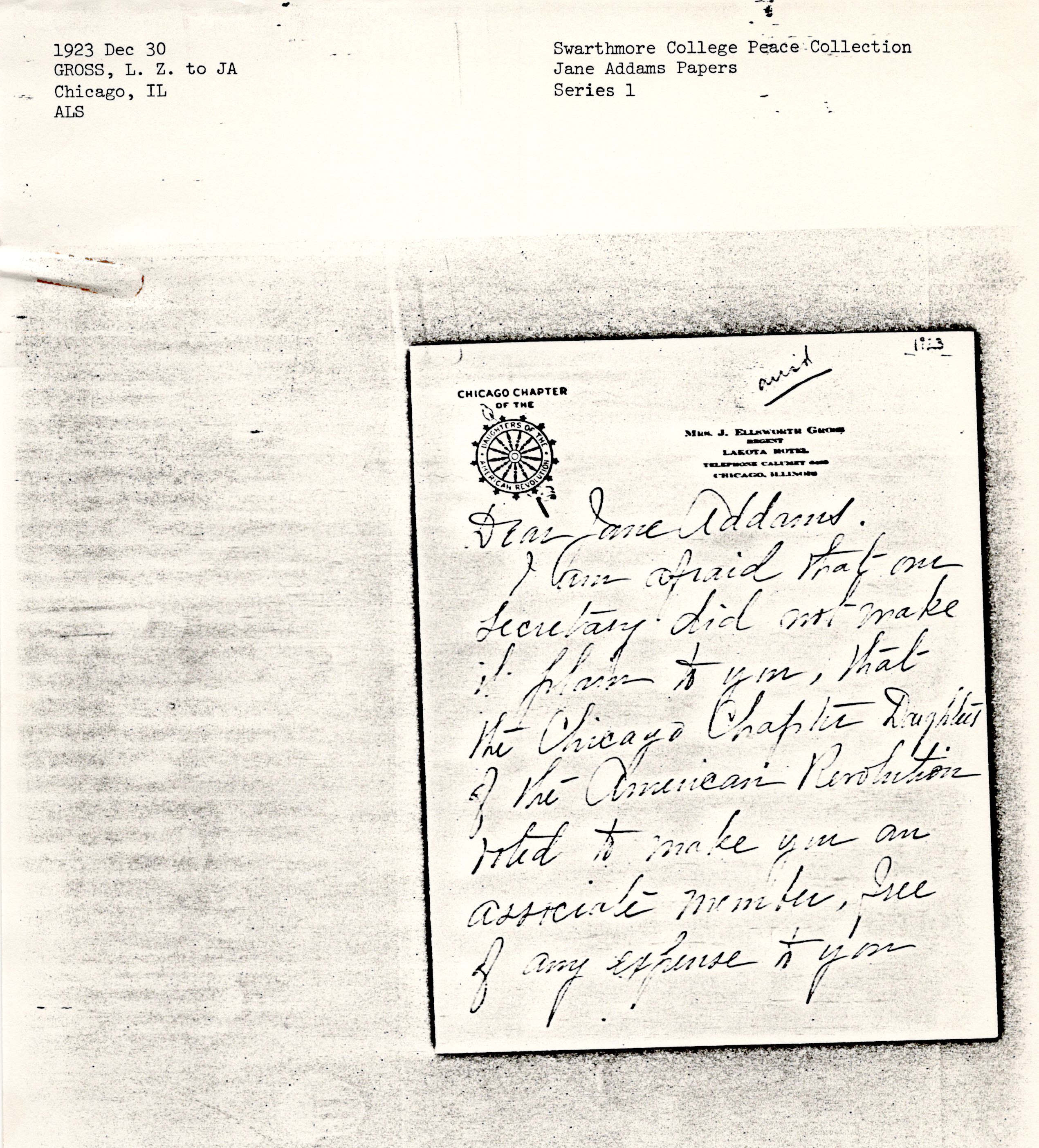 I am afraid that one Secretary did not make it plain to you, that the Chicago Chapter Daughters of the American Revolution voted to make you an associate member, free of any expense to you [page 2] whatsoever. As you have proved yourself eligible by your ancestral papers having been accepted in Washington by our National Society, and we have no other honorary list it was with pleasure that this courtesy was unanimously extended to you. We deem it an honor to have your name on our list and hope you will [give us the request]. Your patriotism is [worldwide] and you should be one of us.