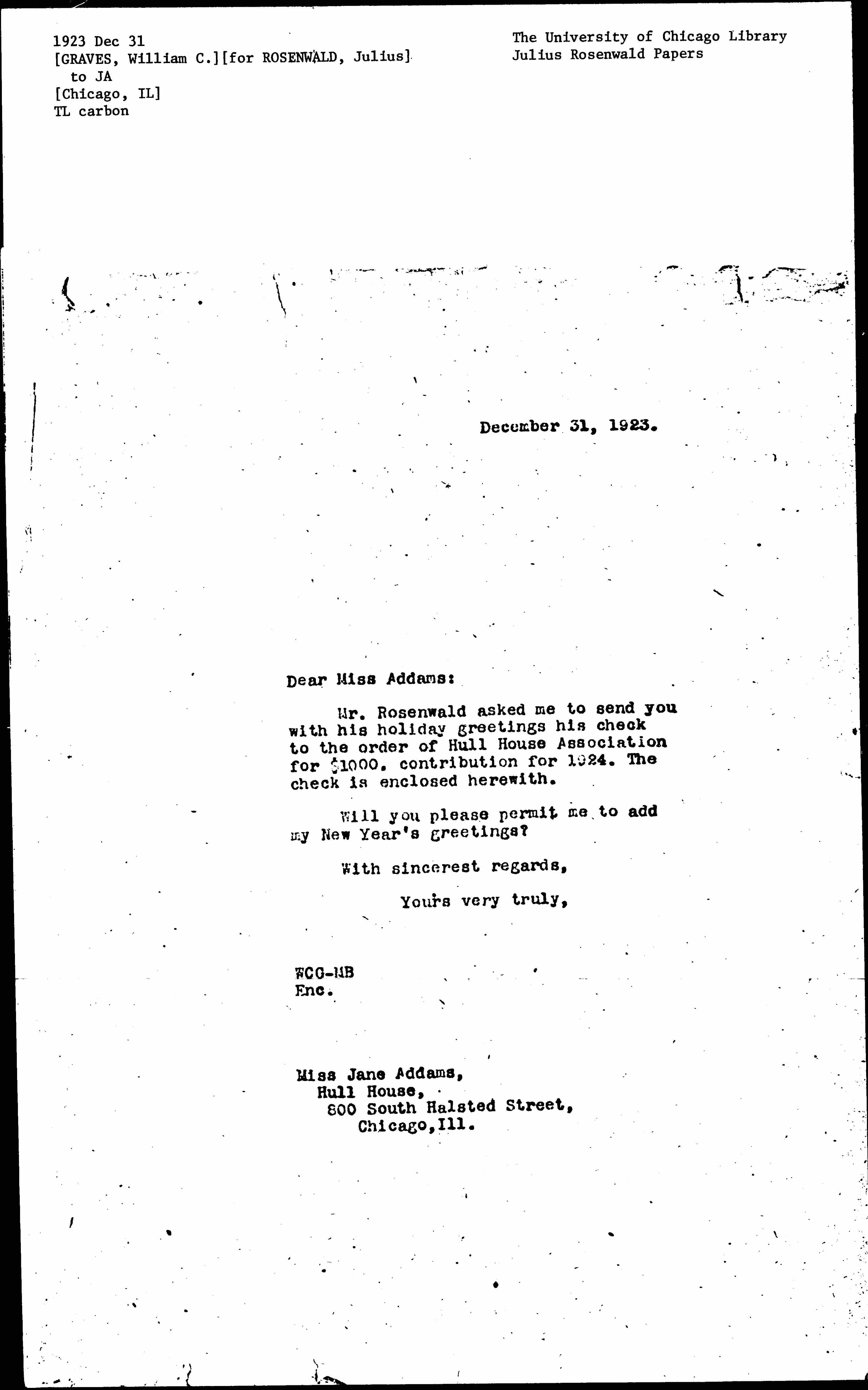 Mr. Rosenwald asked me to send you with his holiday greetings his check to the order of Hull House Association for $1000. contribution for 1924. The check is enclosed herewith.