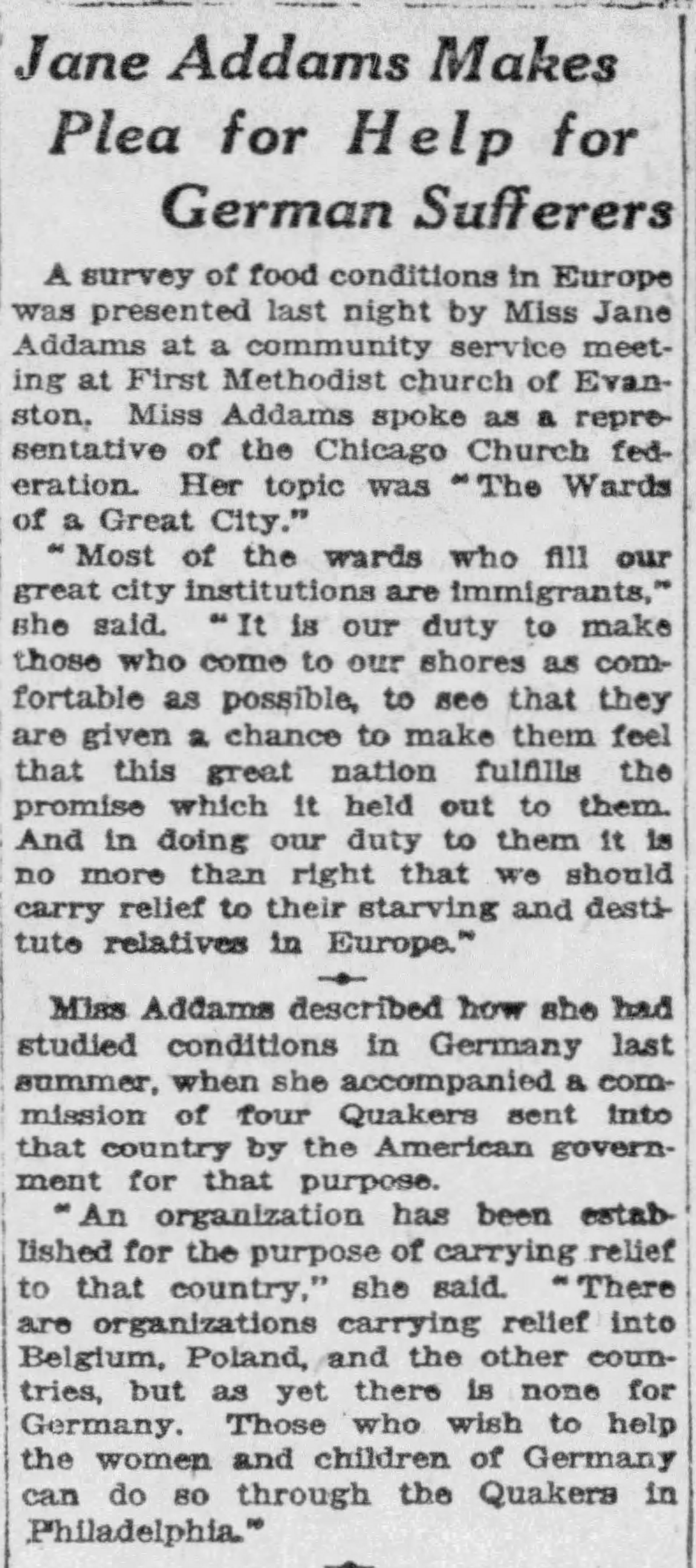 A survey of food conditions in Europe was presented last night be Miss Jane Addams at a community service meeting at First Methodist Church of Evanston. Miss Addams spoke as a representative of the Chicago Church Federation. Her topic was "The Wards of a Great City."
