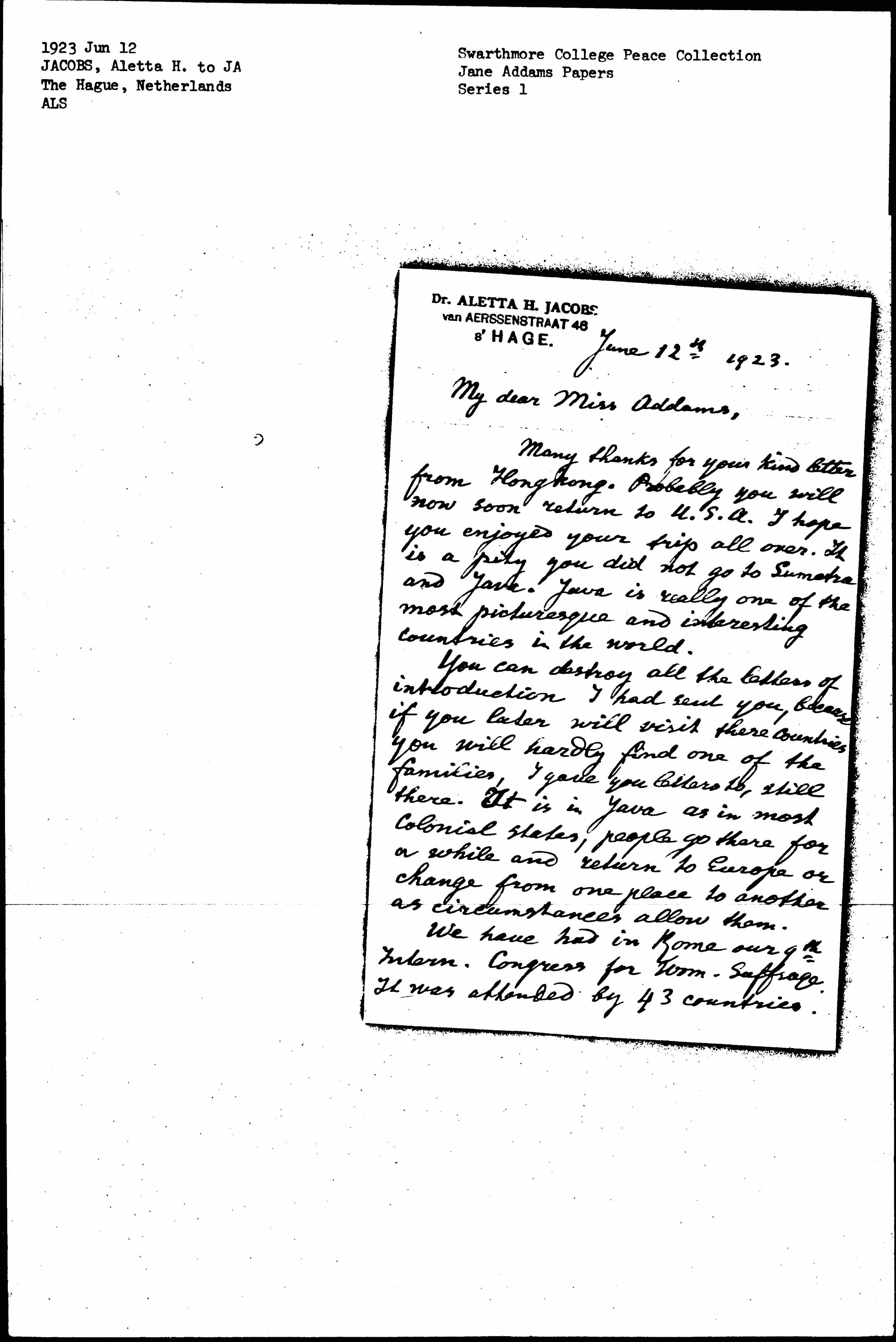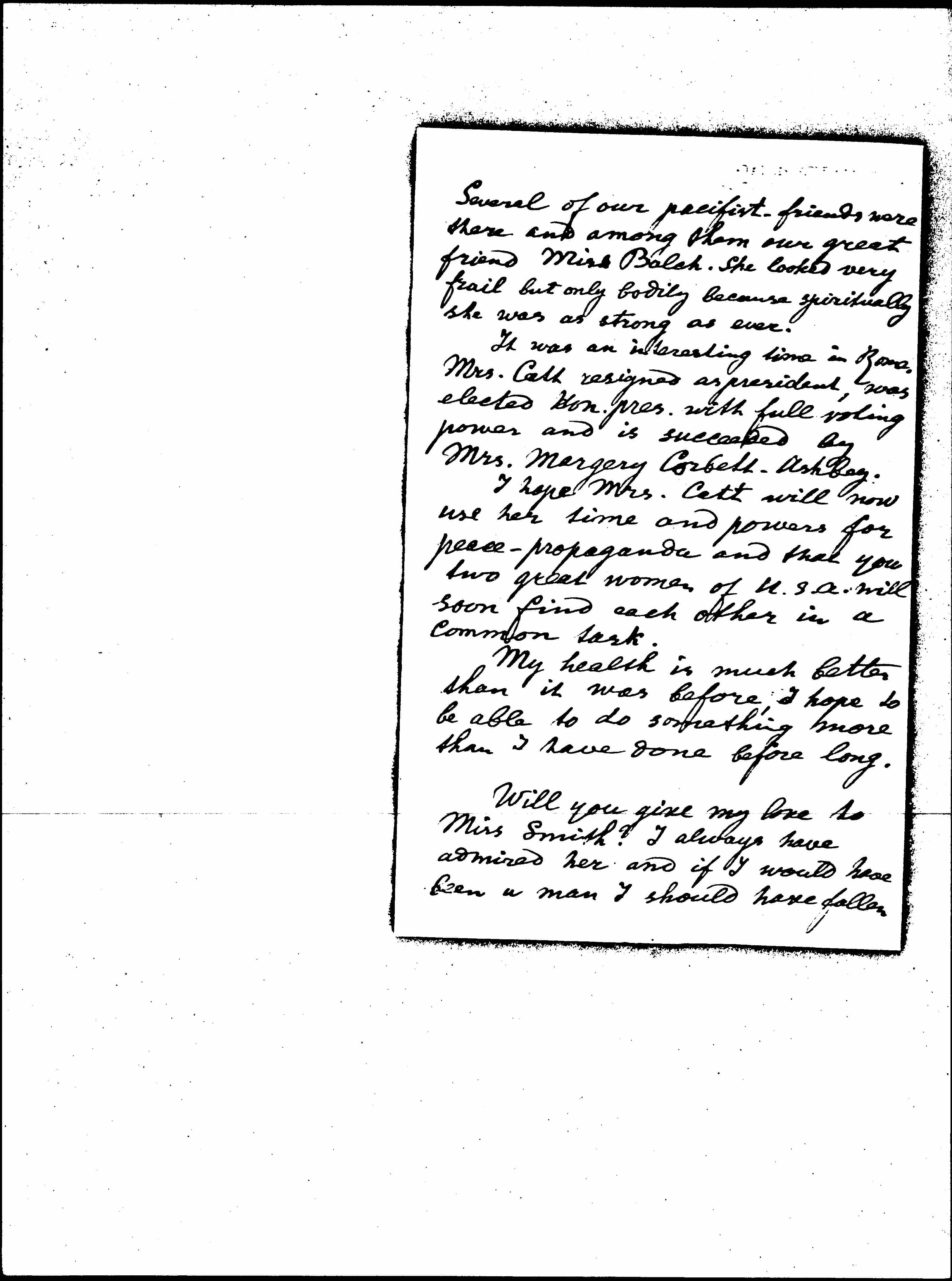 We have had in Rome our 9th Inter. Congress for Wom. Suffrage. It was attended by 43 countries. [page 2] Several of our pacifist-friends were there and among them our great friend Miss Balch. She looked very frail but only bodily because spiritually she was as strong as ever.