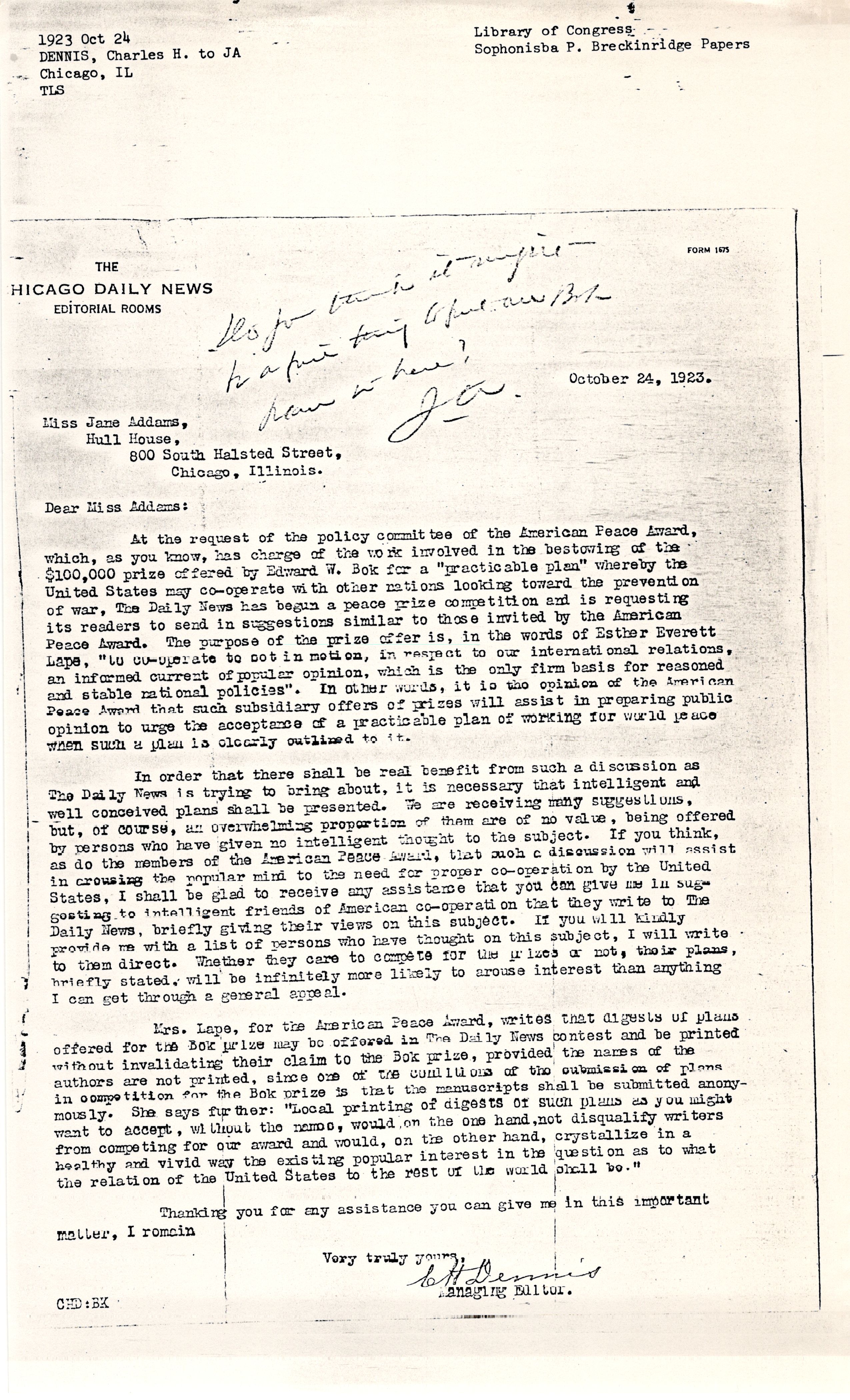 At the request of the policy committee of the American Peace Award, which, as you know, has charge of the work involved in the bestowing of the $100,000 prize offered by Edward W. Bok for a "practicable plan" whereby the United States may [cooperate] with other nations looking toward the prevention of war. The Daily News has begun a peace prize competition and is requesting its readers to send in suggestions similar to those invited by the American Peace Award. The purpose of the prize offer is, in the words of Esther Everett Lape, "to [cooperate] to set in motion, in respect to our international relations, an informed current of popular opinion, which is the only firm basis for reasoned and stable national policies." In other words, it is the opinion of the American Peace Award that such subsidiary offers of prizes will assist in preparing public opinion to urge the acceptance of a practicable plan of working for world peace when such a plan is clearly outlined to it.