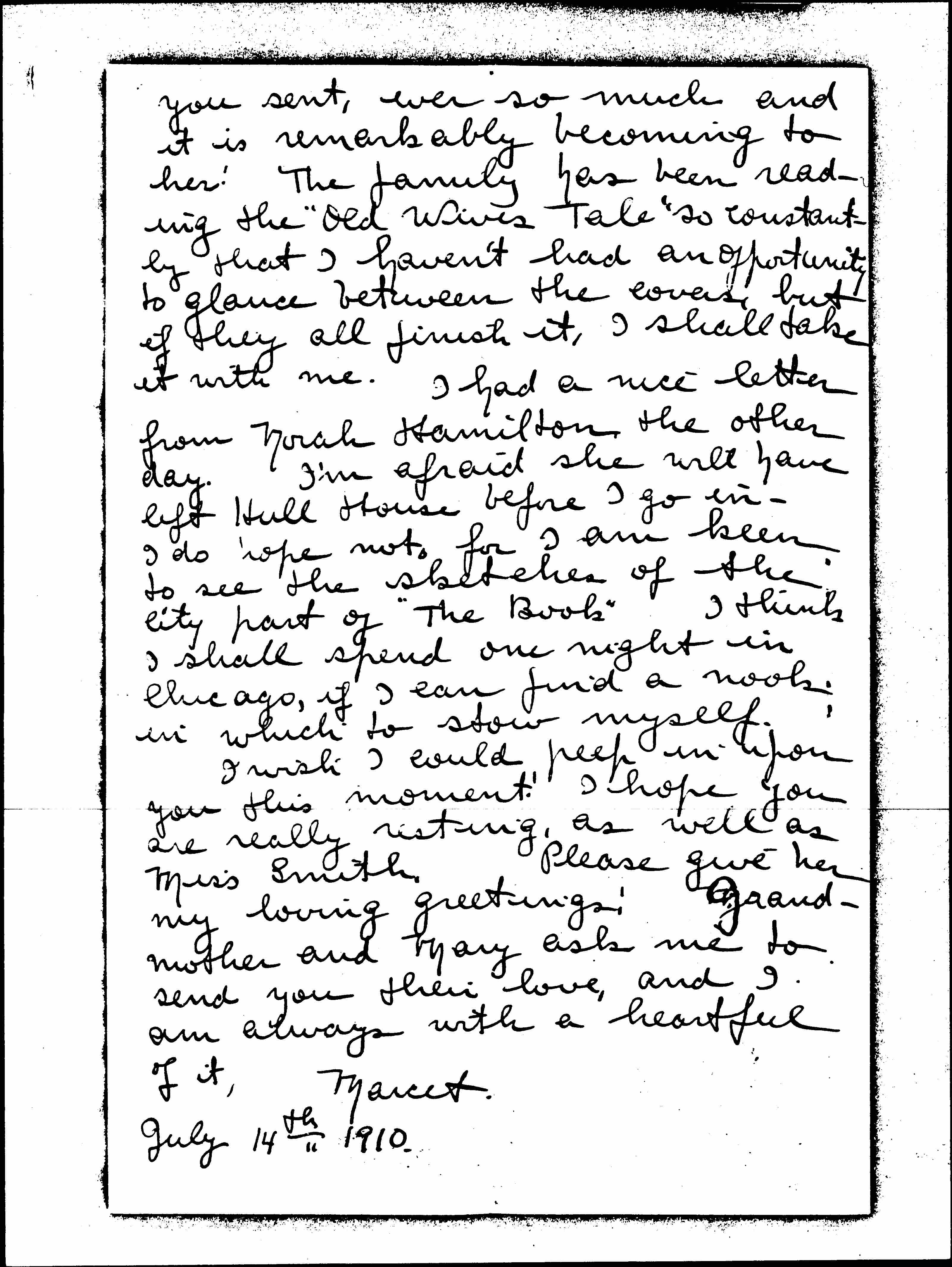 I had a nice letter from Norah Hamilton the other day. I'm afraid she will have left Hull House before I go in. I do hope not, for I am keen to see the sketches of the city part of "The Book." I think I shall spend one night in Chicago, if I can find a nook, in which to stow myself.
