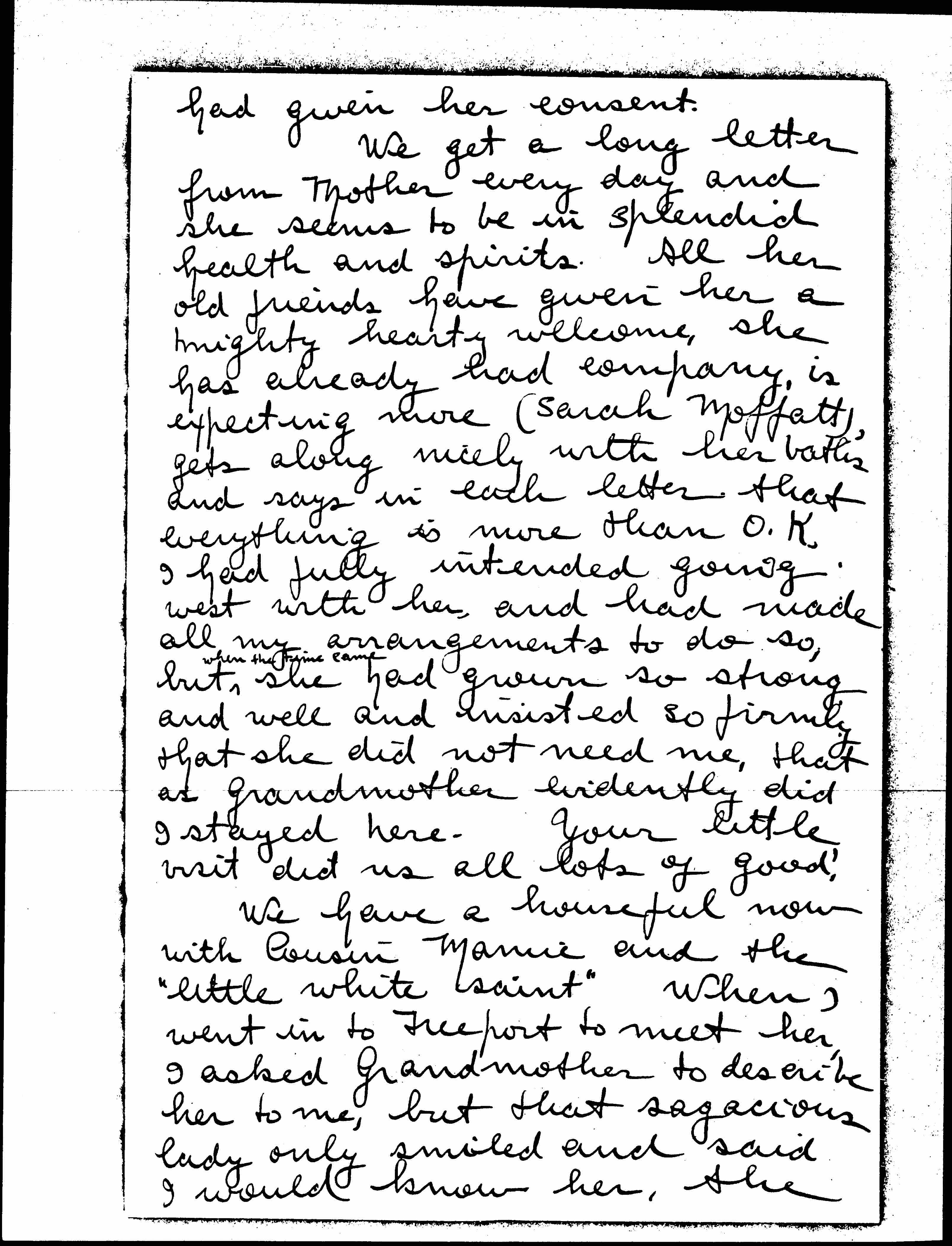 This has been a big concession for Grandmother and I hope the very first second you have time you will write her your "very prettiest" as I told her I should let you know that she [page 3] had given her consent.