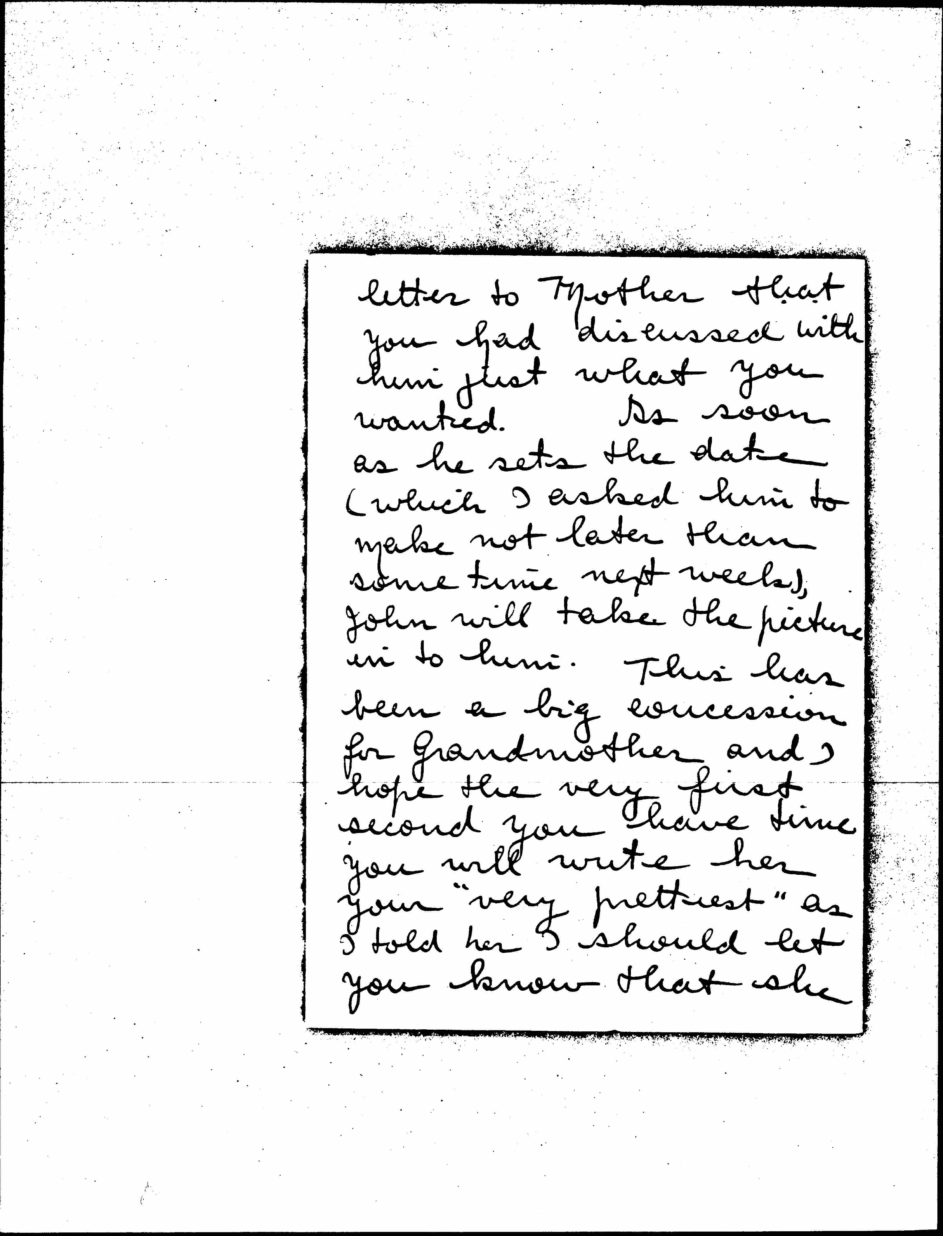 Grandmother has given her sanction to a letter, just sent to Mr Cox, asking him to make an appointment with us to take a photograph of Grandfather's portrait. I told him, I did so at your request as I inferred from your [page 2] letter to Mother that you had discussed with him just what you wanted. As soon as he sets the date (which I asked him to make not later than sometime next week), John will take the picture in to him.