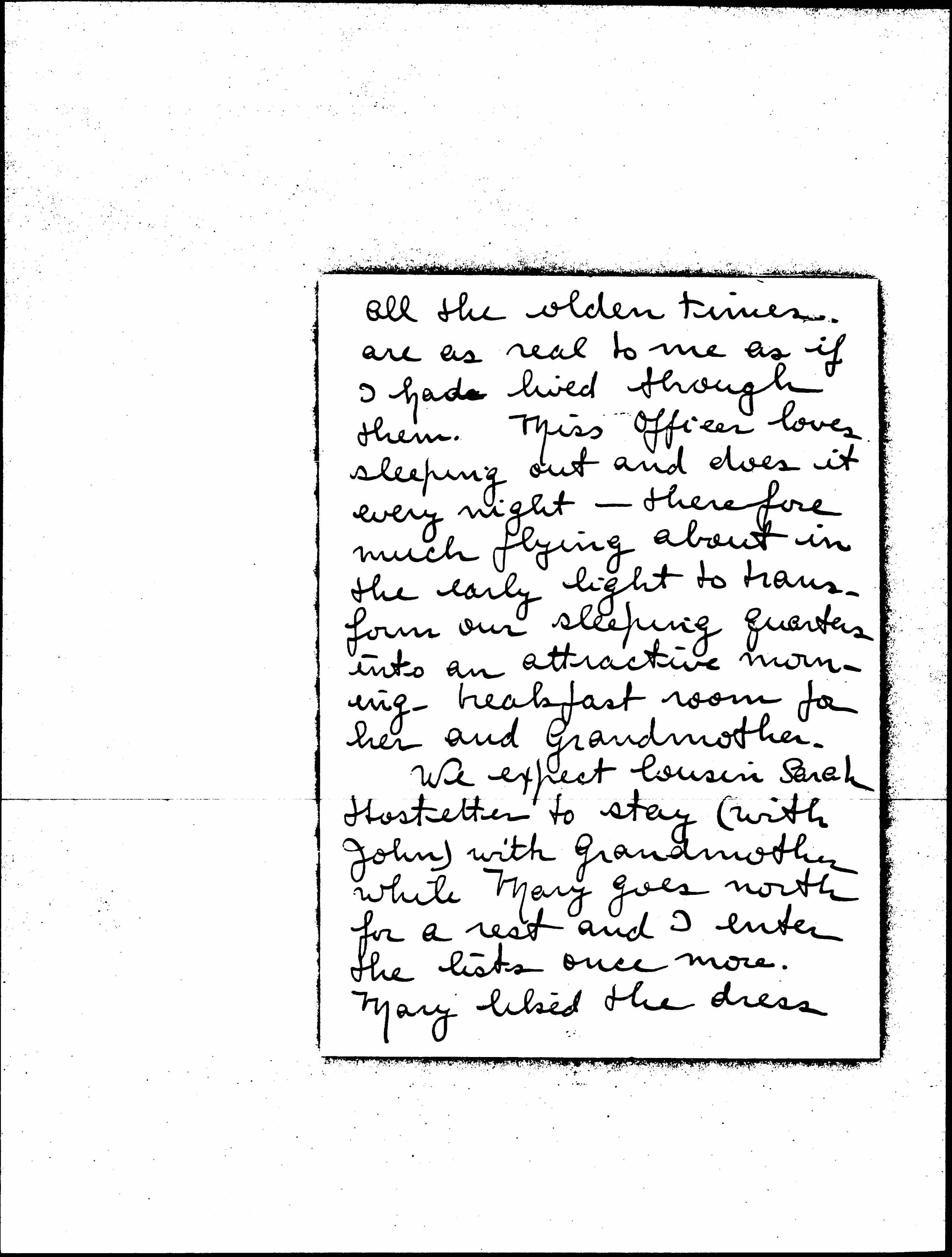We have a houseful now with Cousin Mamie and the "little white saint." When I went in to Freeport to meet her, I asked Grandmother to describe her to me, but that sagacious lady only smiled and said I would know her, the [page 4] minute I saw her. I must confess that as the train pulled in, I felt quite excited and not a little doubtful of my powers of divination, but the second she stepped into the doorway, I was as certain she was Miss Officer as if I had known her for years and years, and by the time we had reached home, I could not remember the day when we had not been friends -- partly because I am so chummy with Grandmother that [page 5] all the olden times are as real to me as if I had lived through them. Miss Officer loves sleeping out and does it every night -- therefore much flying about in the early light to transform our sleeping quarters into an attractive morning breakfast room for her and Grandmother.