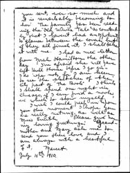 We get a long letter from Mother every day and she seems to be in splendid health and spirits. All her old friends have given her a mighty hearty welcome, she has already had company, is expecting more (Sarah Moffatt), gets along nicely with her baths and says in each letter that everything is more than O.K. I had fully intended going west with her, and had made all my arrangements to do so, but ↑when the time came↓ she had grown so strong and well and insisted so firmly that she did not need me, that as Grandmother evidently did I stayed here. Your little visit did us all lots of good!