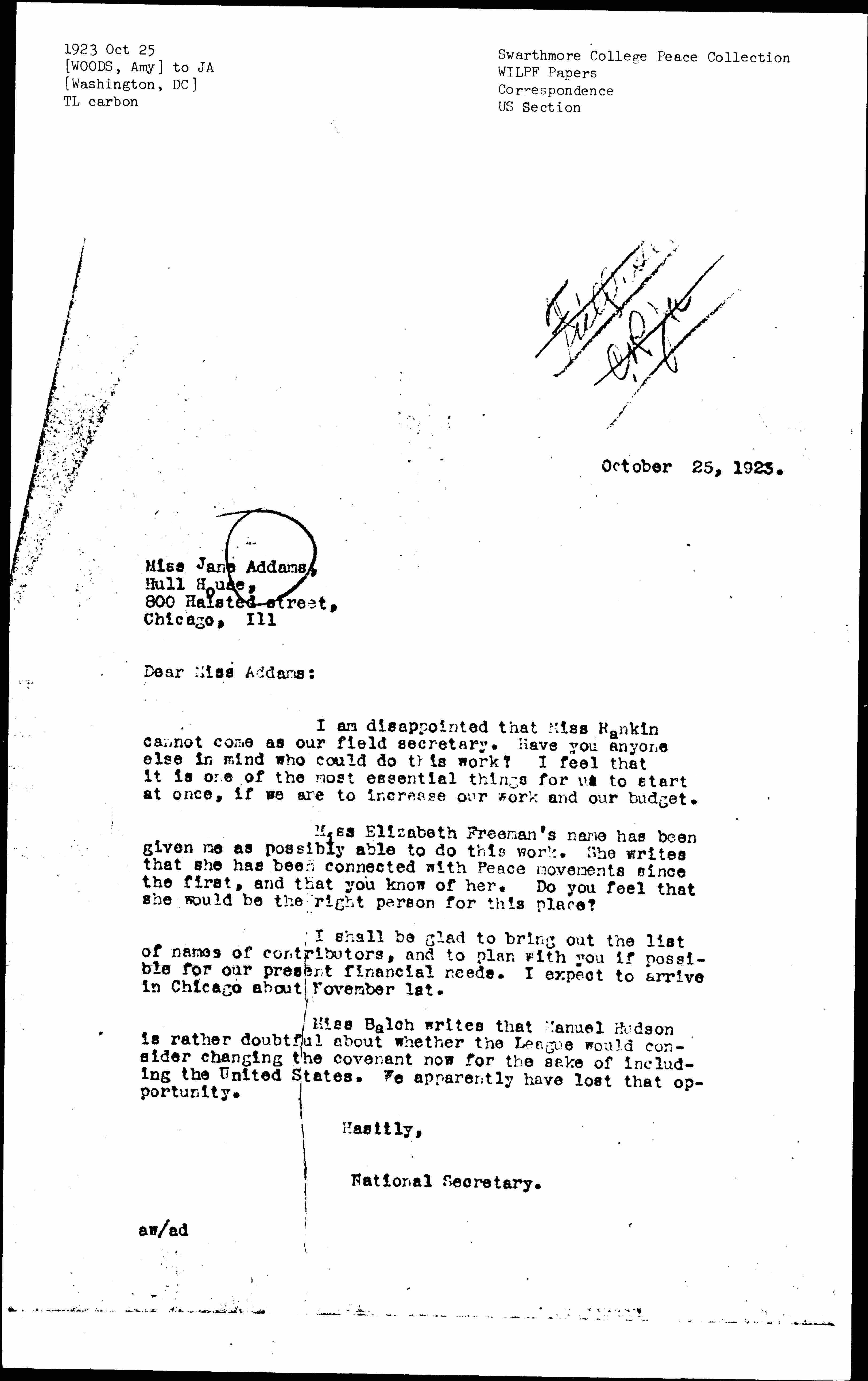 I am disappointed that Miss Rankin cannot come as our field secretary. Have you anyone else in mind who could do this work? I feel that it is one of the most essential things for us to start at once, if we are to increase our work and our budget.