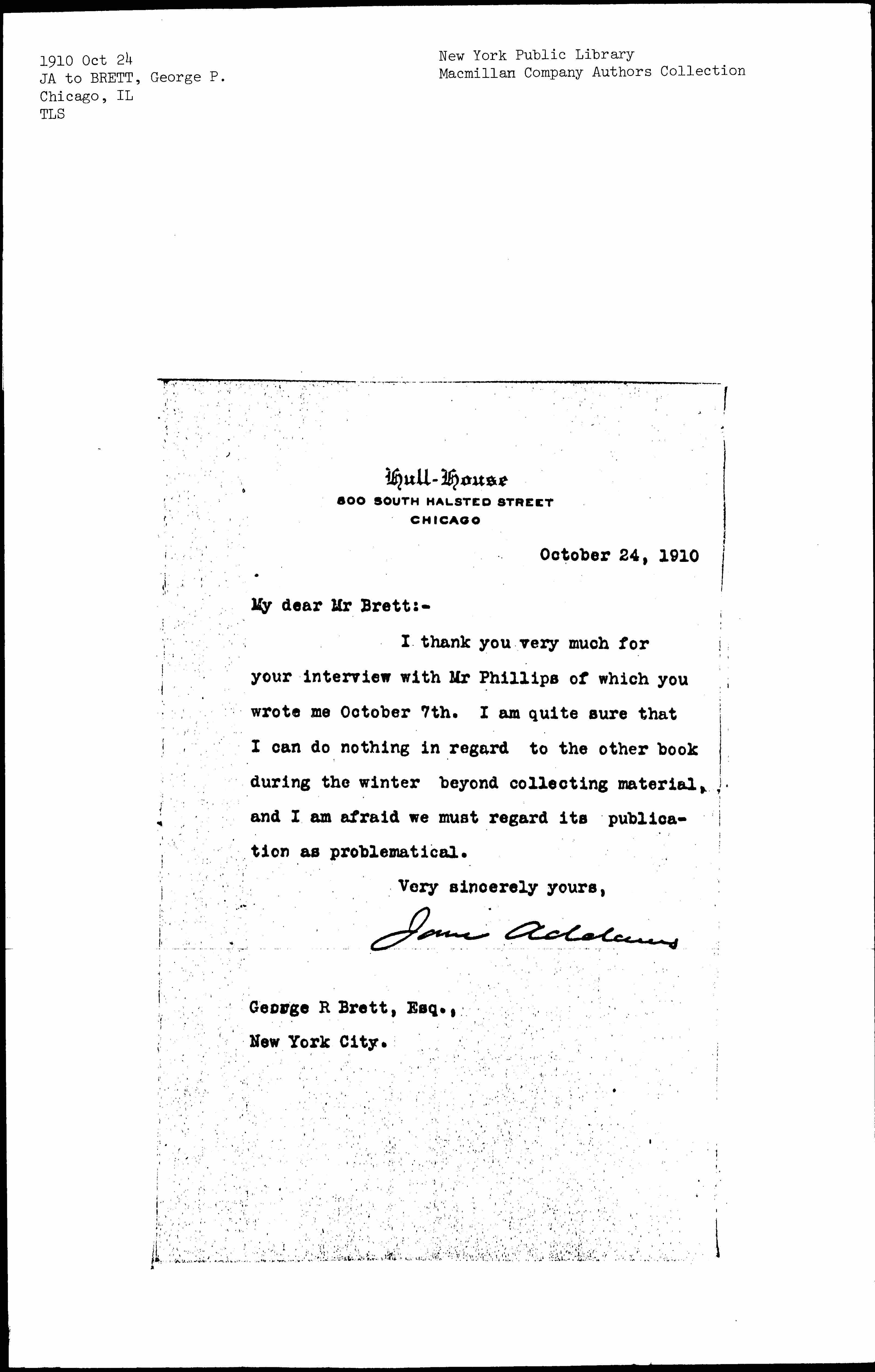 I thank you very much for your interview with Mr Phillips of which you wrote me October 7th. I am quite sure that I can do nothing in regard to the other book during the winter beyond collecting material, and I am afraid we must regard its publication as problematical.